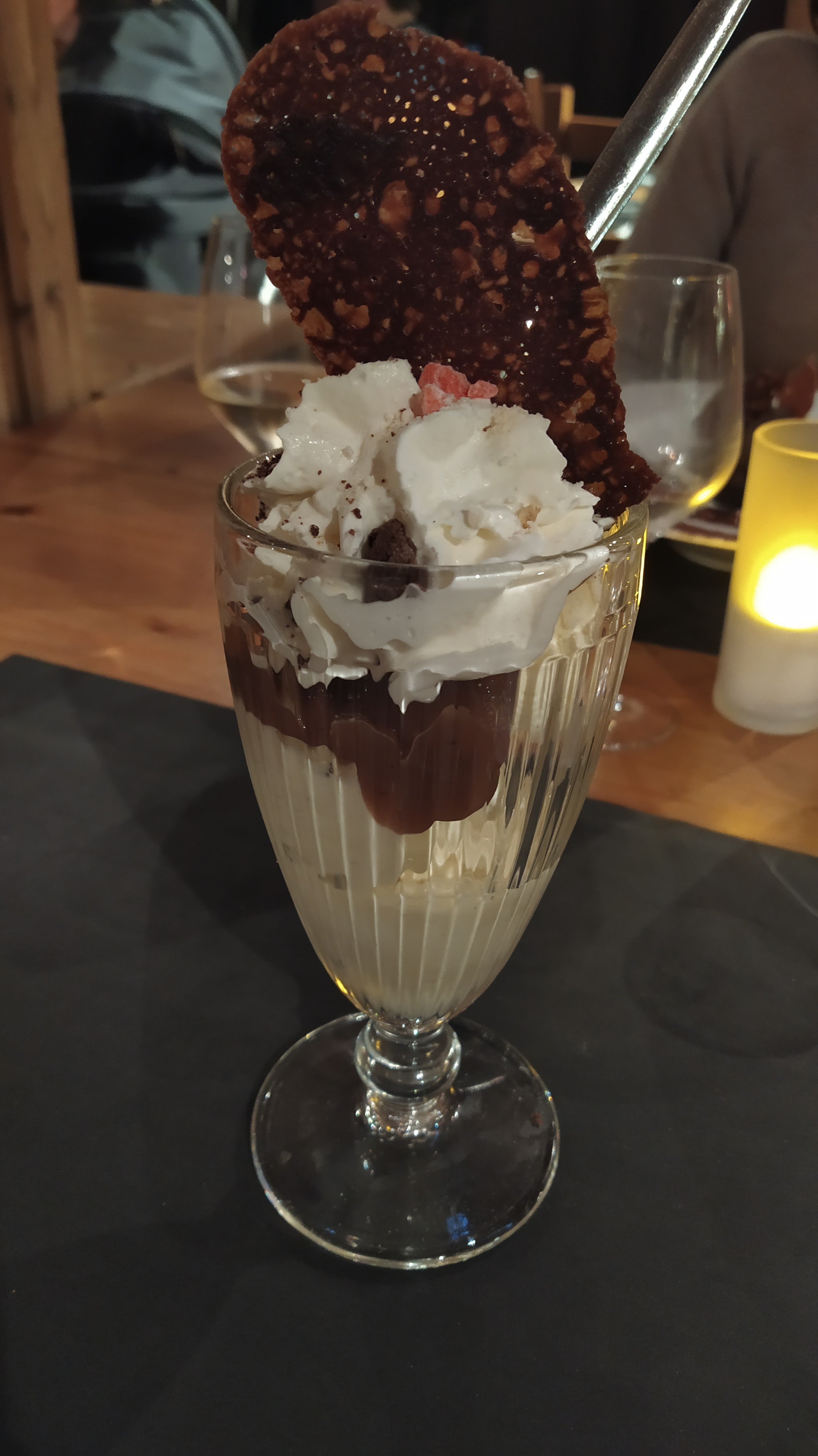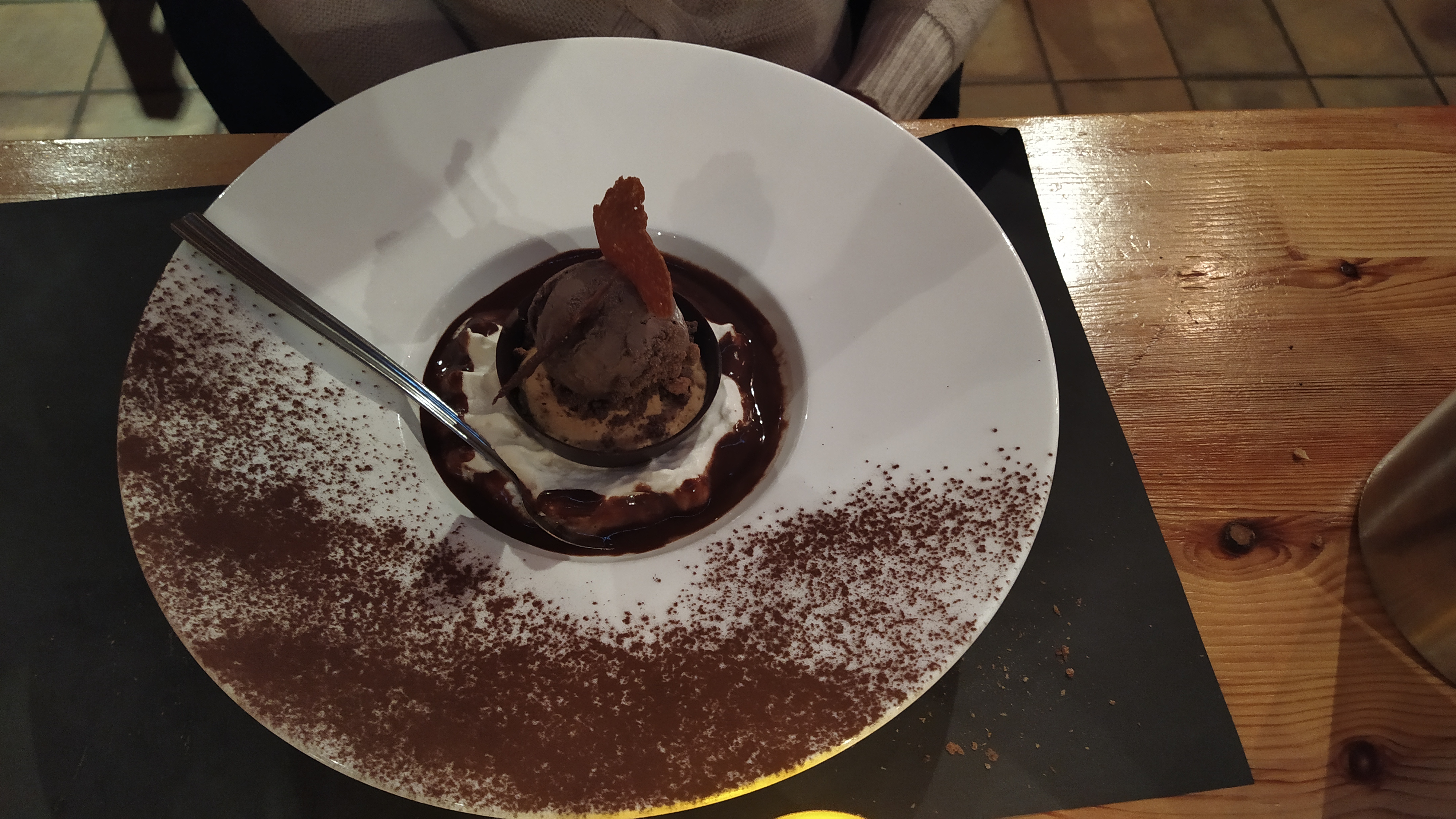 Le restaurant est sympathique, les plats sont copieux, bons, mais sans plus. Tartiflette et delice ai Reblochon étaient bons. Pour le burger on ne nous a pas demandé la cuisson, mais il était bon. On était très déçu par les pâtes linguine à la sauce pizzaiole : trop de pâtes, un peu de sauce tomate, et très peu de parmesan. Donc, on n'a pas compris l'originalité de ce plat. Nous avons commandé les kirs, mais il y avait plus de crème que du blanc, trop sucré. Mais le plus désagréable c'était notre serveuse, pas de sourire, pour le service du vin: juste ouvert la bouteille, pas proposé de déguster, pas servi dans les verres, la façon débrouillez vous. Toute la soirée on avait l'impression de l'embêter, on se sentait gênée. Même avant de commander le dessert on lui a posé la question si cela ne la dérangeait pas. Finalement, on a pris le dessert juste pour l'enfant, le croquant au chocolat, ma fille l'a aimé.