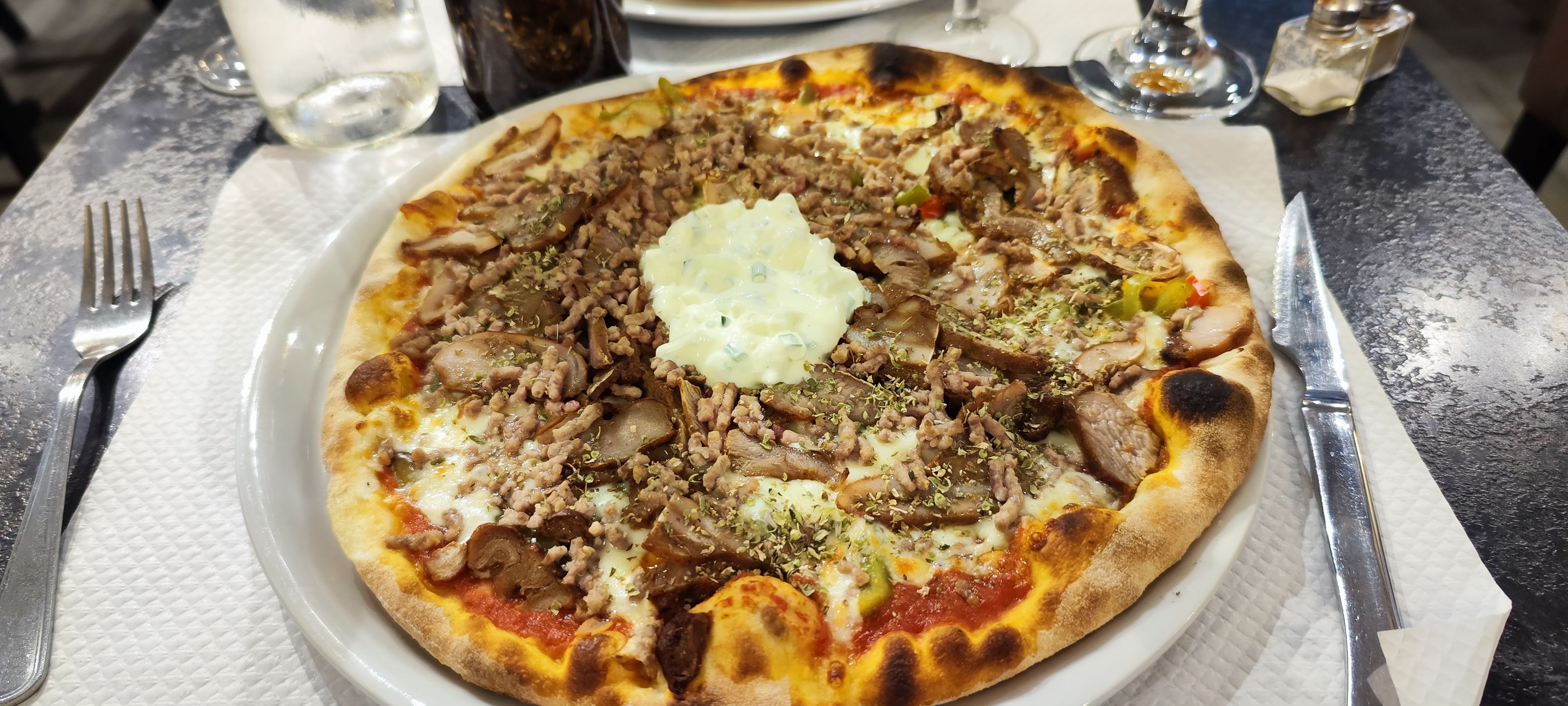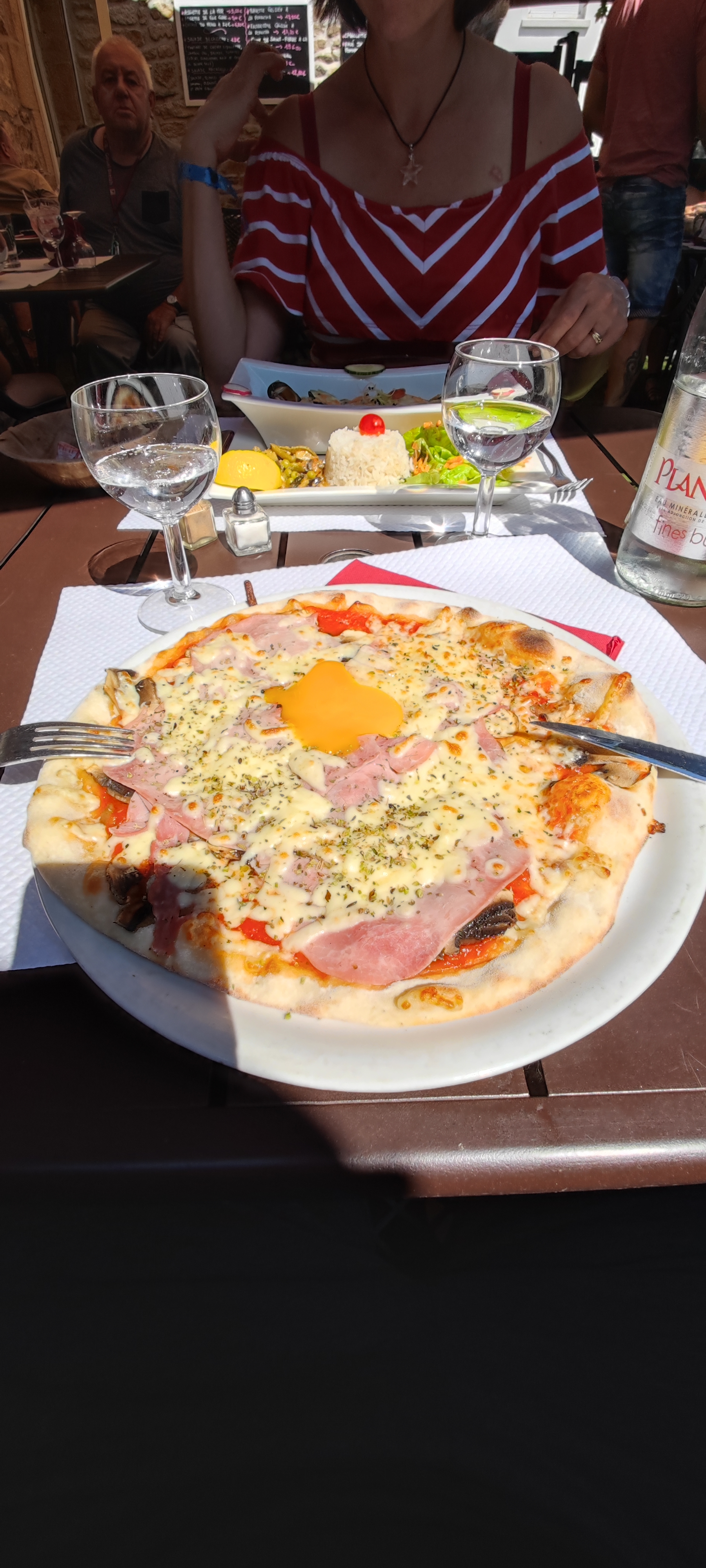 Nous avons pris des pizzas à emporter, excellentes, bien garnies avec le petit œuf à côté à casser au dernier moment, trop bon !!!