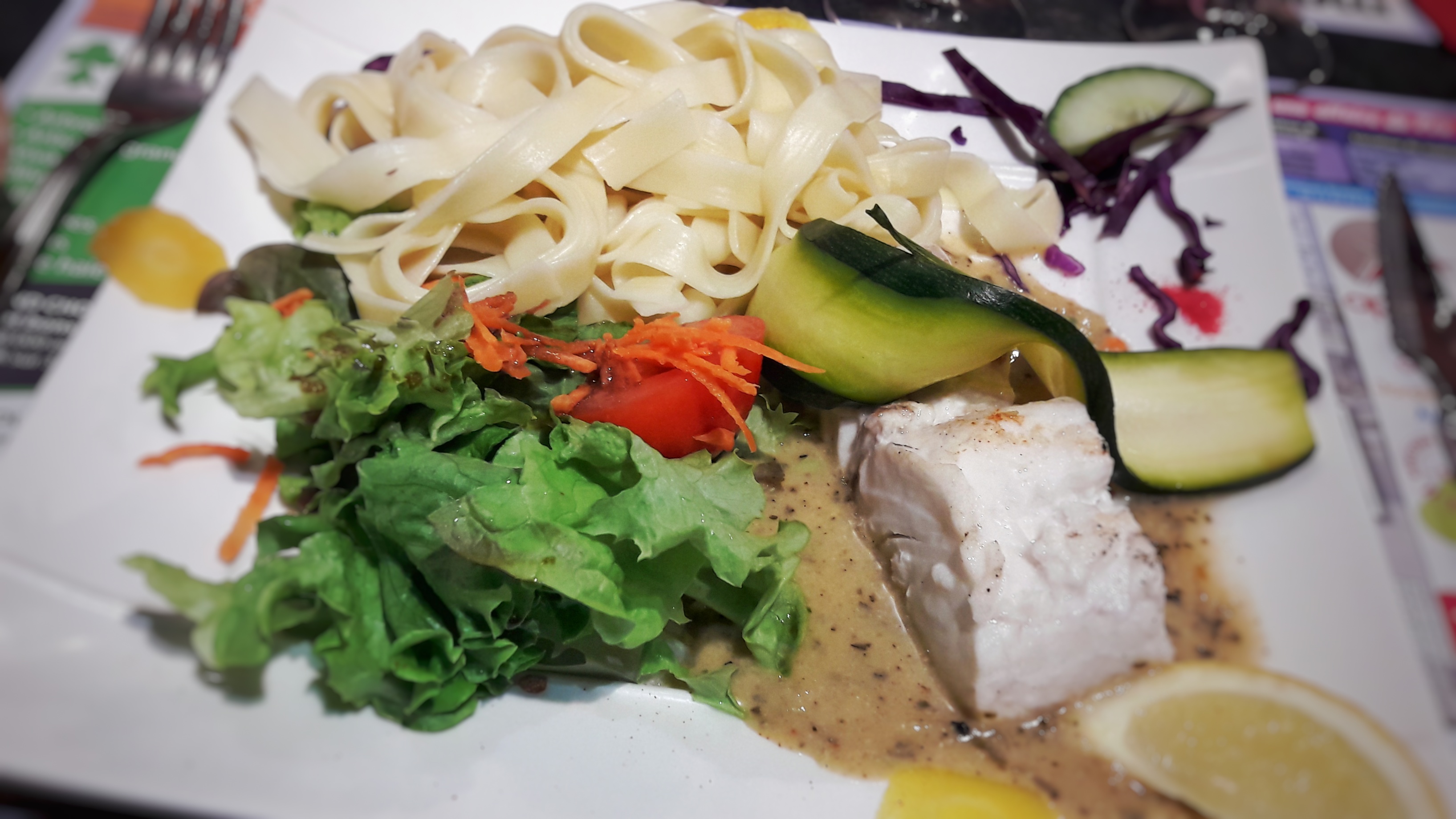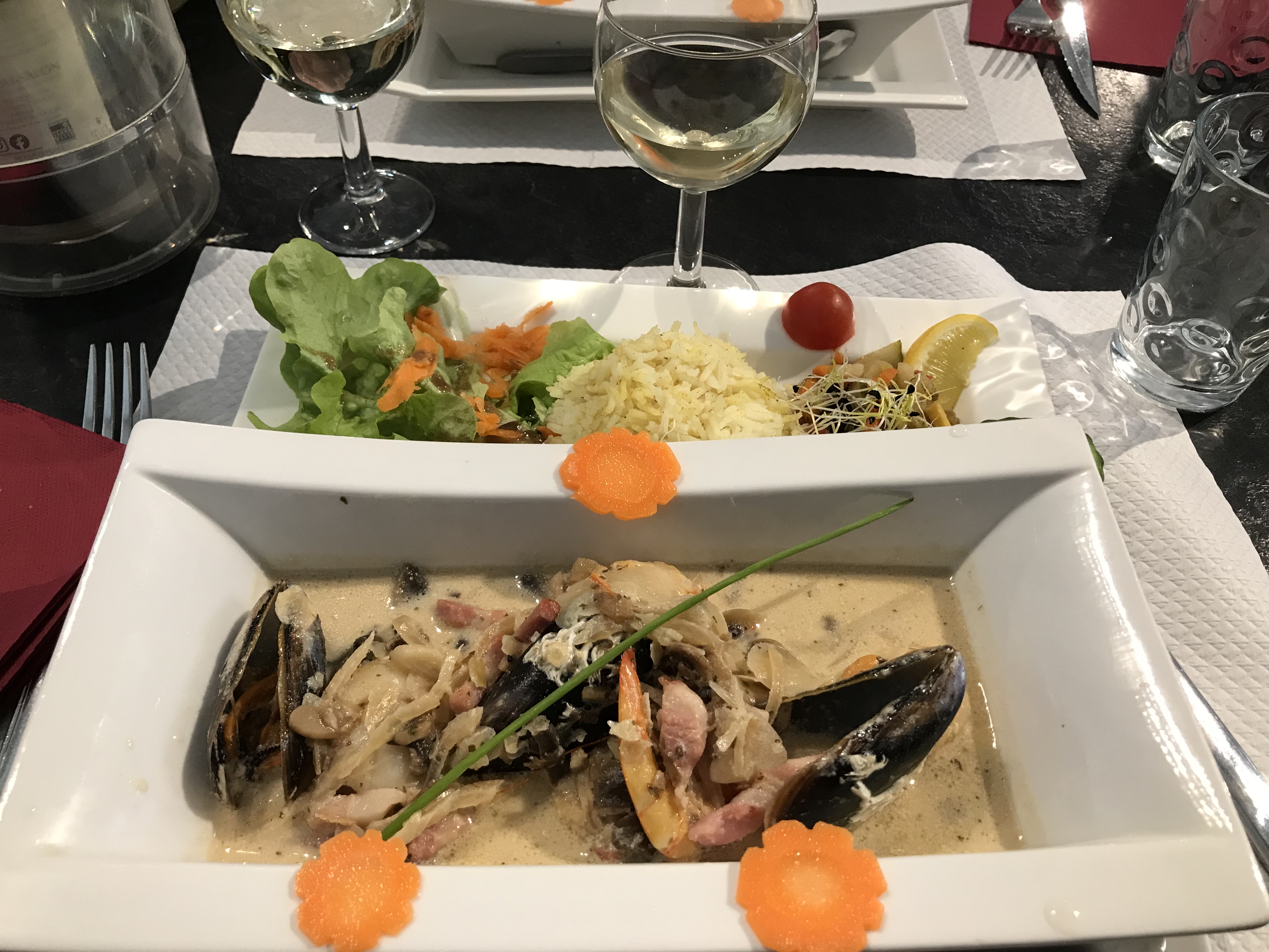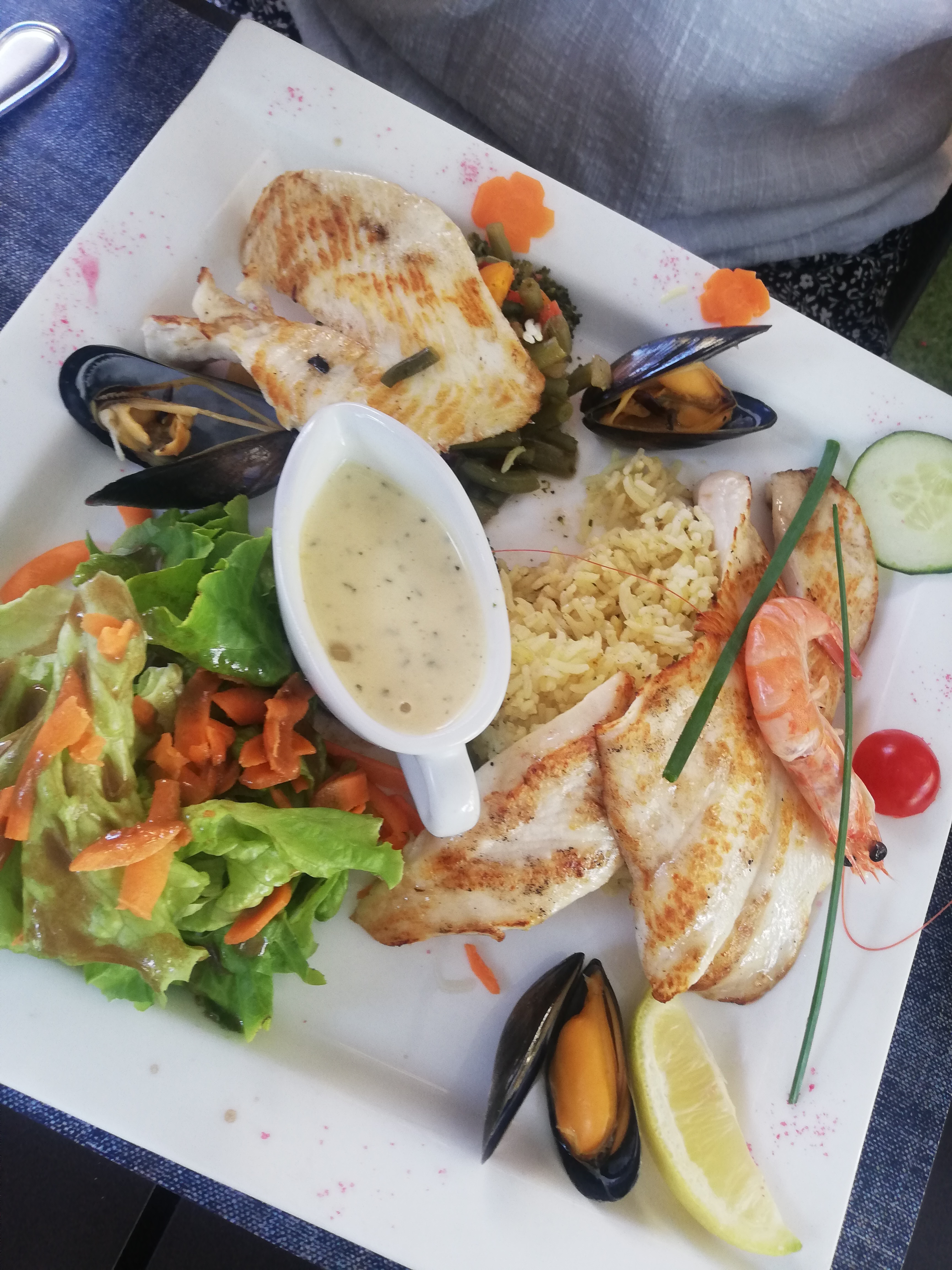 Bof bof l entrée qq moules 3tranches de chorizo gratinées tres salées et salade, beaucoup de salade, 1radis coupé, ,, le plat qui , 3joues de lottes trop cuites dans une sauce indéterminée et des moules encore, riz lamelles de poivron 1rondelle de carotte a chaque angle du plat rectangulaire ahah et encore de la salade verte et le dessert un cheese cake fruits rouges dans un verre creme chantilly biscuit au fond et coulis ressemblant plutot a un tiramisu,, , fortement déçue pour la somme de 18,50€,,,je ne recommande pas du tout , personnel aimable