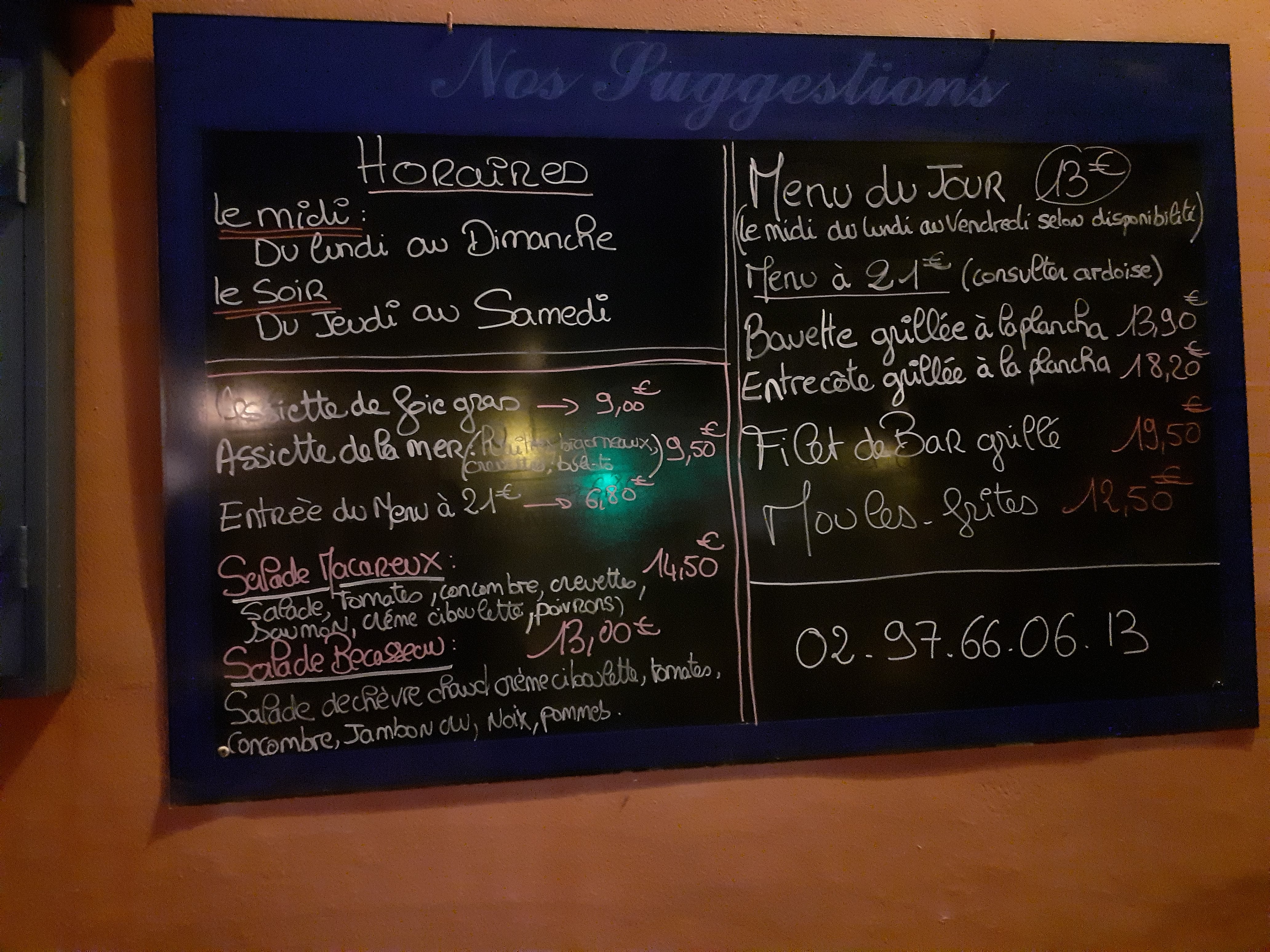 Nous etions un groupe de 22 randonneurs. Nous avons déjeuné un terrine de poisson.,moules frites, far breton café pour 25€. Le repas etait maison et de qualite. L accueil chaleureux. Nous recommandon cet établissement
