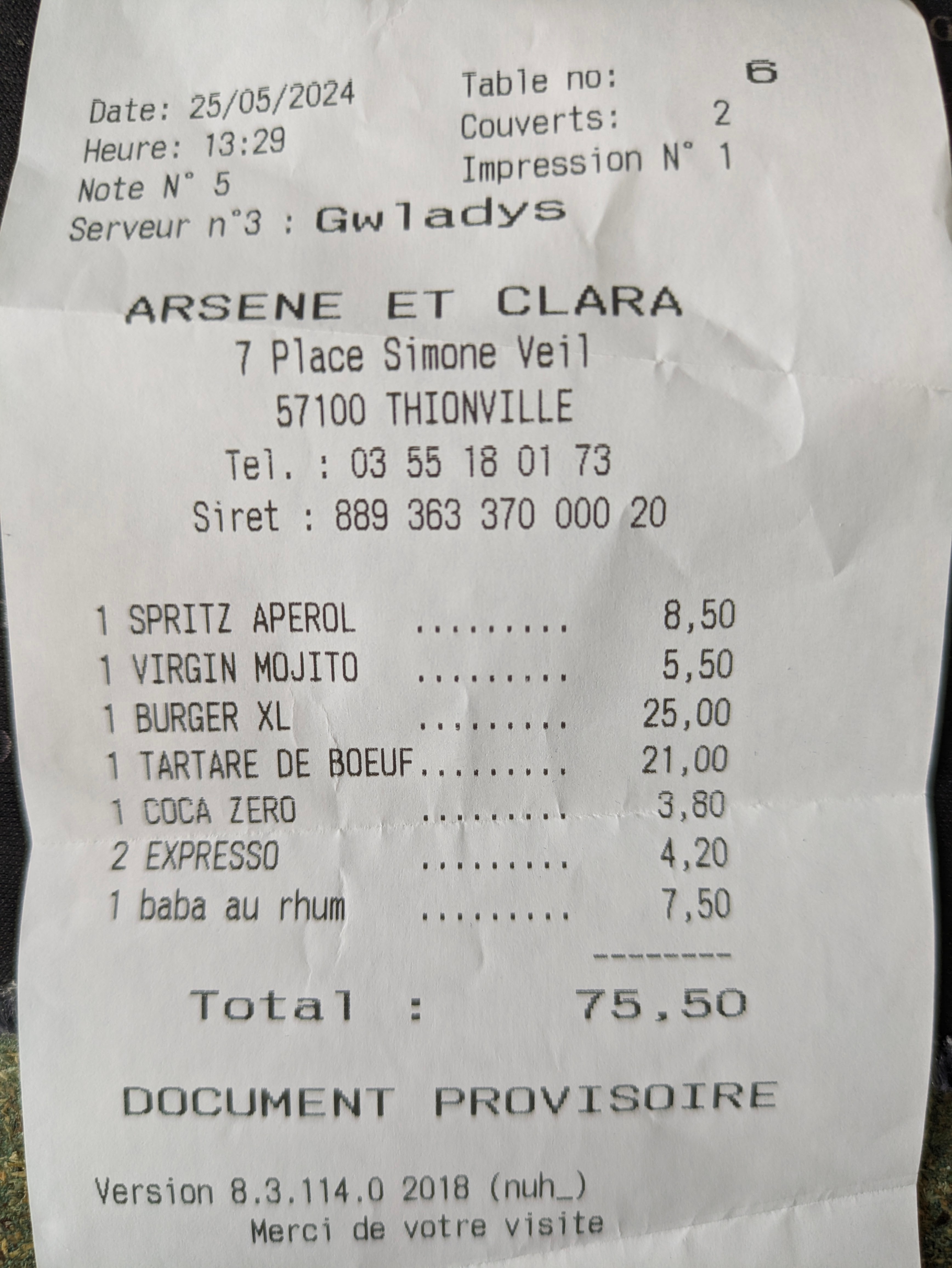Un très bon moment passé chez Arsène et Clara. Petite mention particulière pour le service, tout a été fait pour que vous puissions manger en 1 h ! Parfait merci beaucoup. Je recommande.