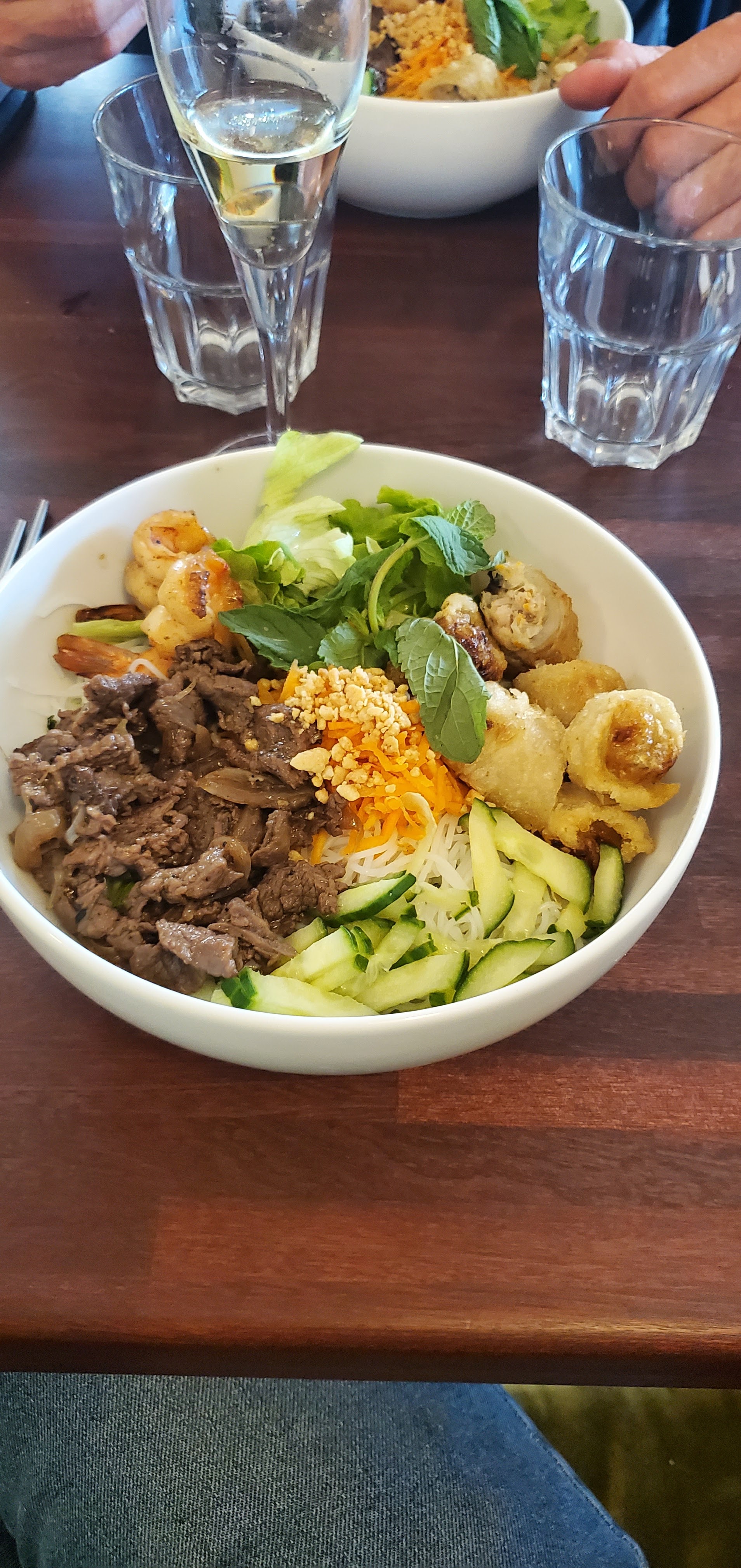 Accueil agréable, petite entrée à partager satisfaisante, bo bun excellent, frais et copieux et pour finir mousse chocolat blanc avec coulis fruit exotique succulent. Je recommande