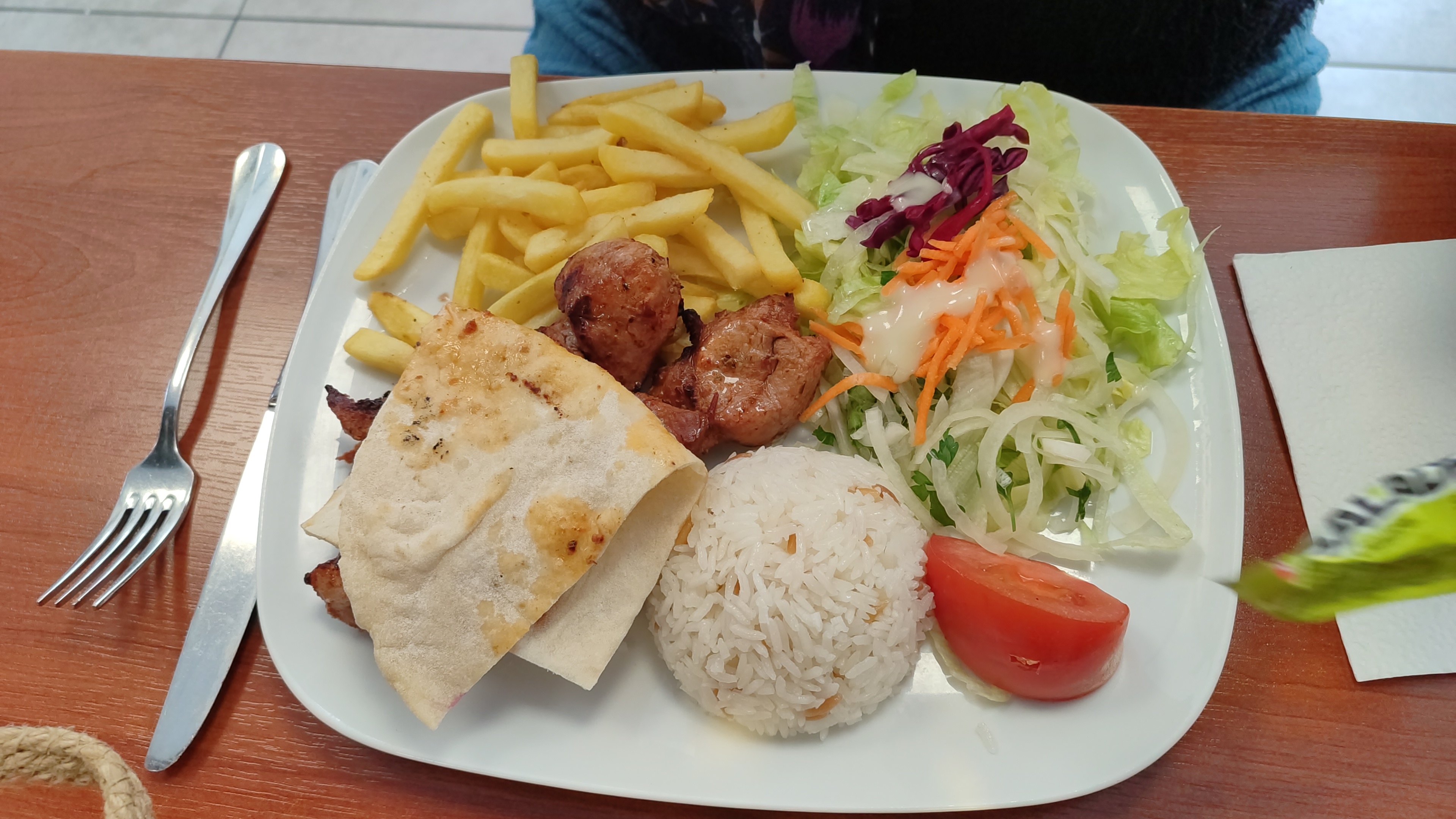 Très bonne adresse, l assiette avec ces quatres viandes, frites, salade et riz pour 15€00, bon prix, bonne qualité et bien servi