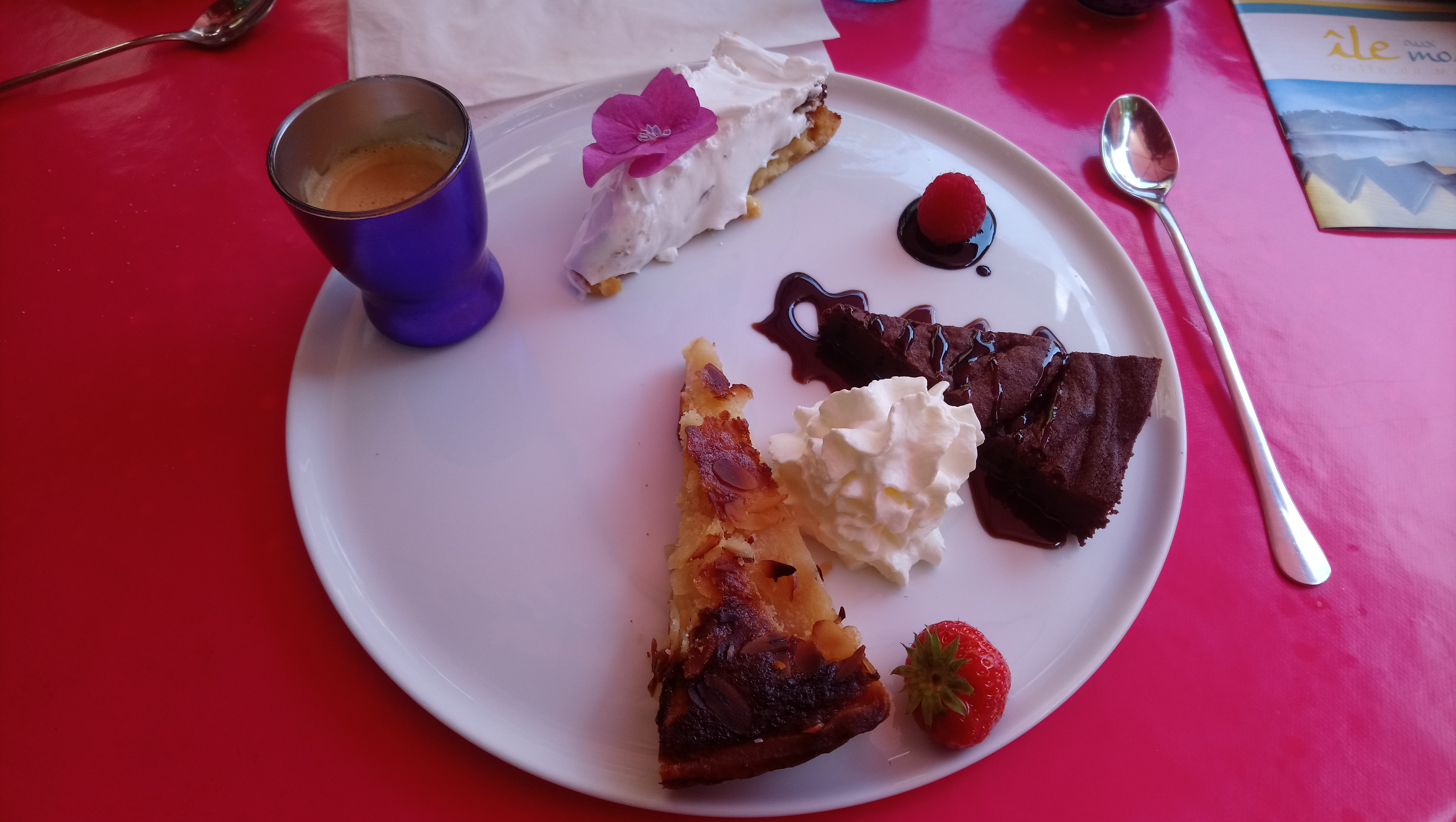 Un pur bonheur à l'ombre des chênes, des portions généreuses et goûteuses (mais pas coûteuses). Incontournable de l'île Aux Moines. Photo : café gourmand, chocolat grand-mère et jus carottes orange gingembre (c'était bin bon).
