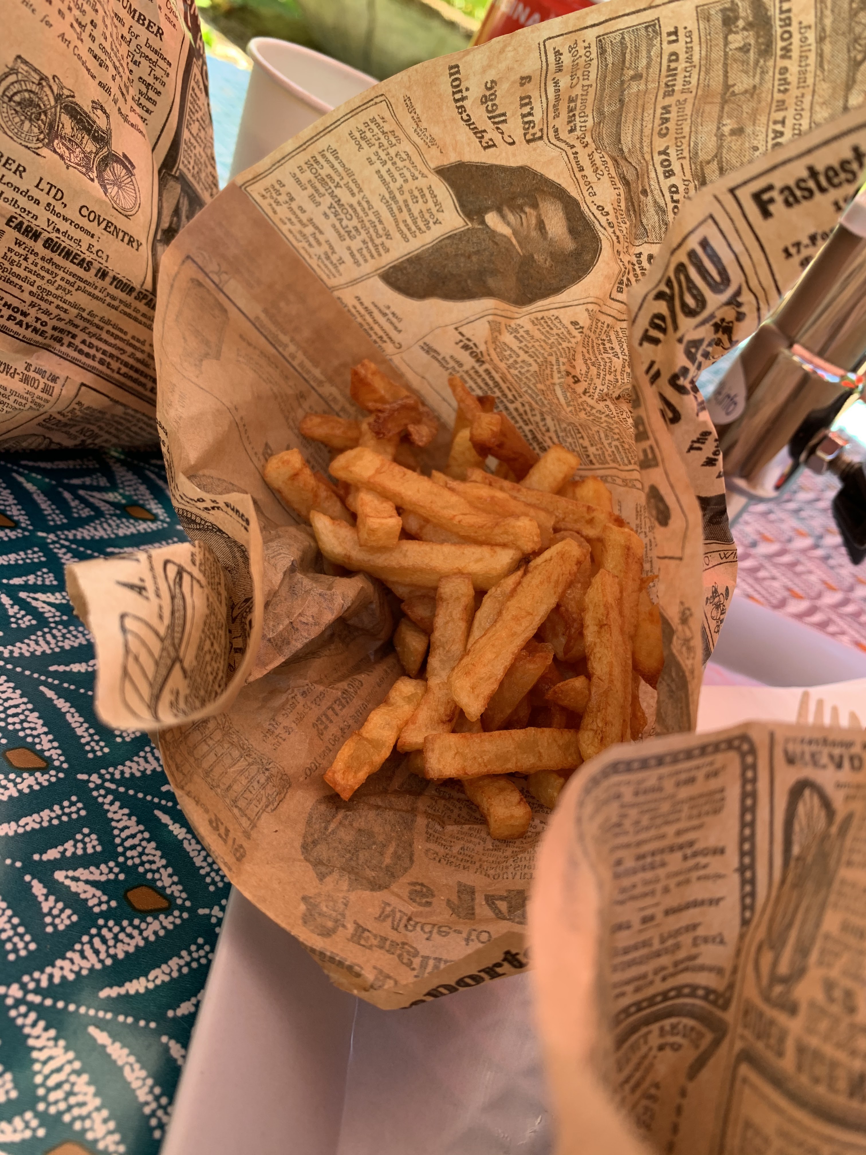Déjeuner sous les arbres à l'ombre. Accueil chaleureux et burgers excellents