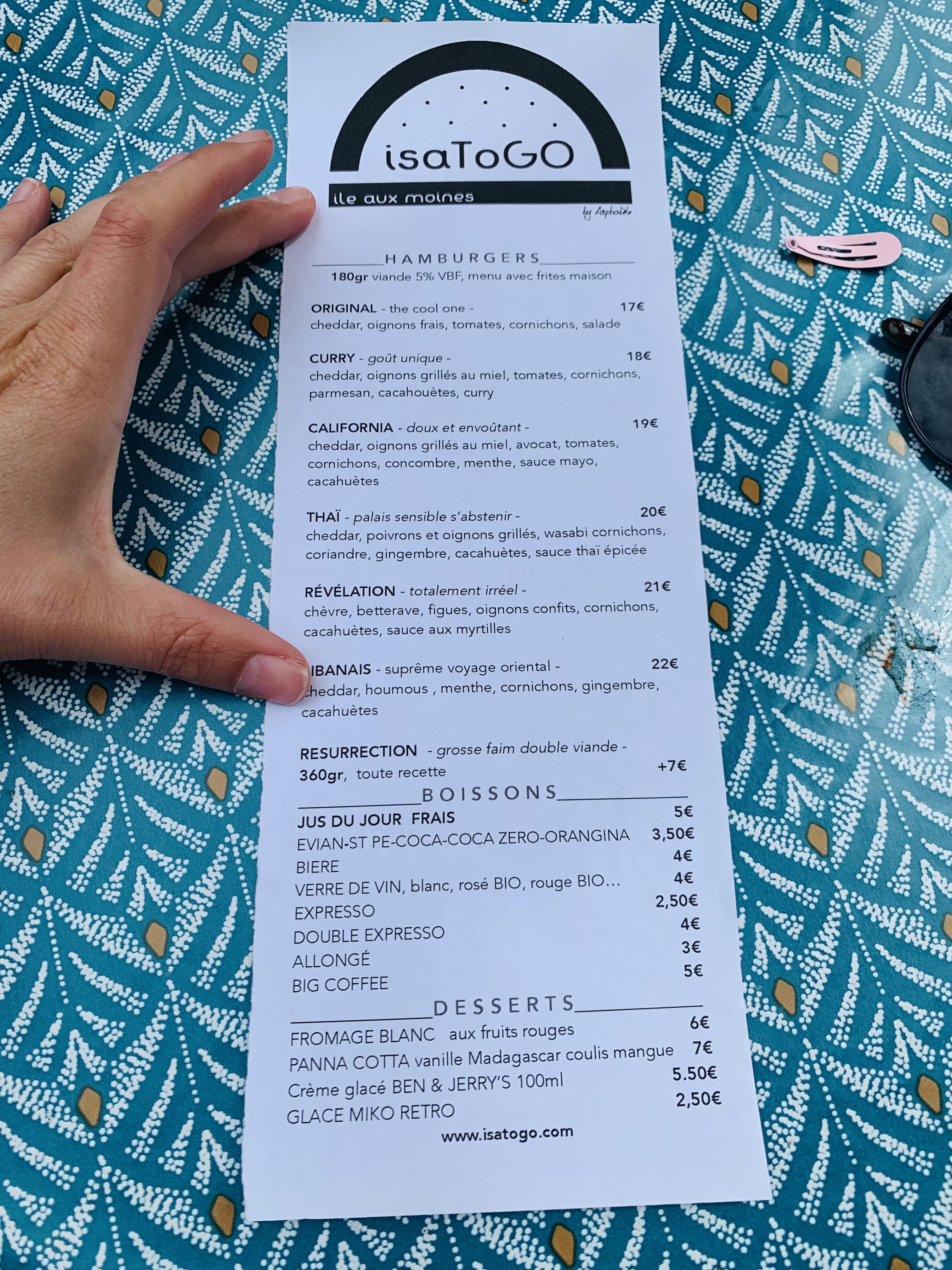 Quelle belle surprise ! Je n’aurai jamais trouvé cet endroit sublime si ce n’avait pas été sur recommandation. Ce petit cocon bien caché dans le bourg de l’Île-aux-Moines est d’une tranquillité et d’une beauté inouïe. J’adore le concept de la carte « straigh to the point » : quelques burgers et quelques tartares, au moins ils sont excellents et on ne cogite pas ! Le burger thaï est une dinguerie.