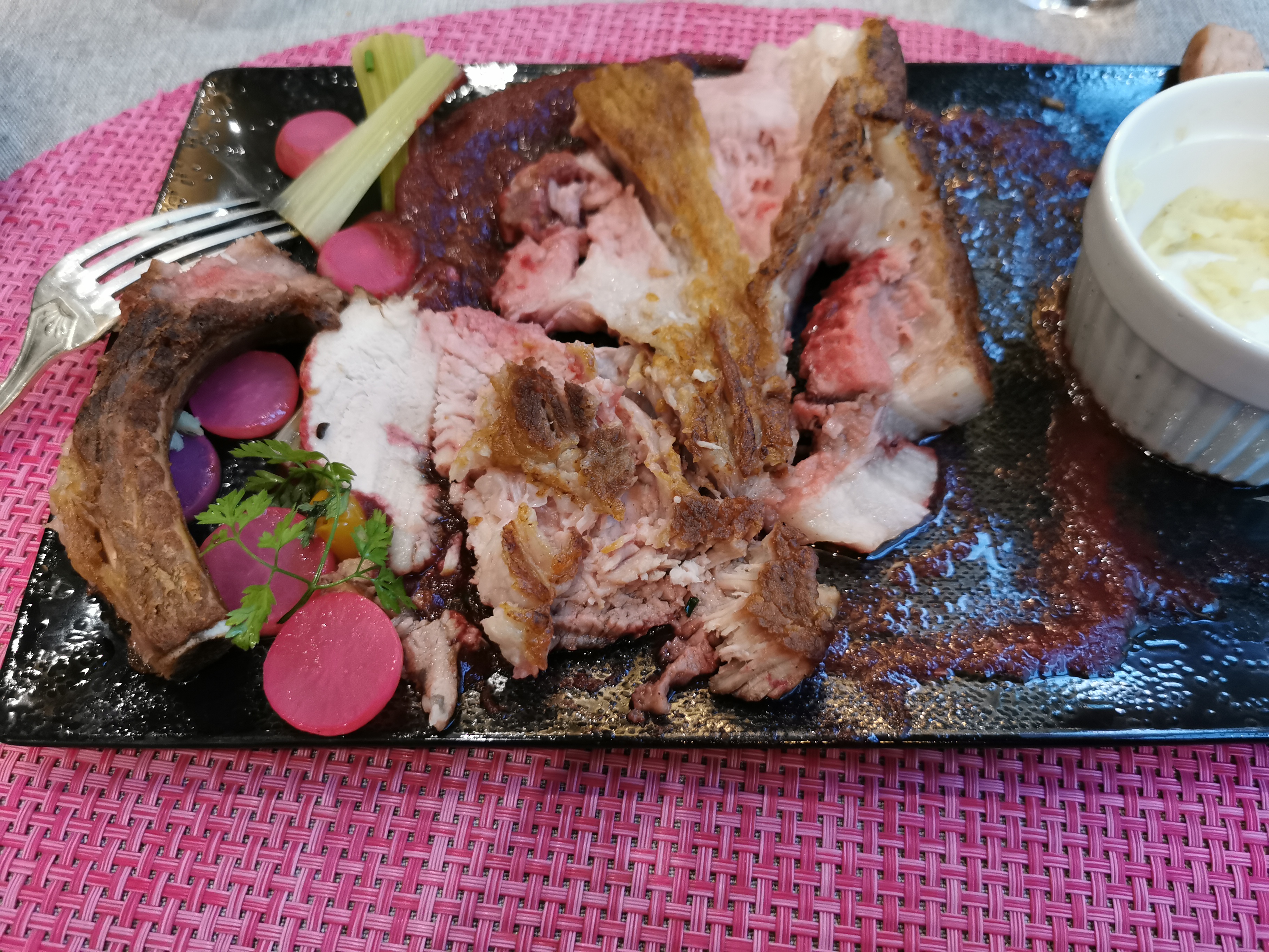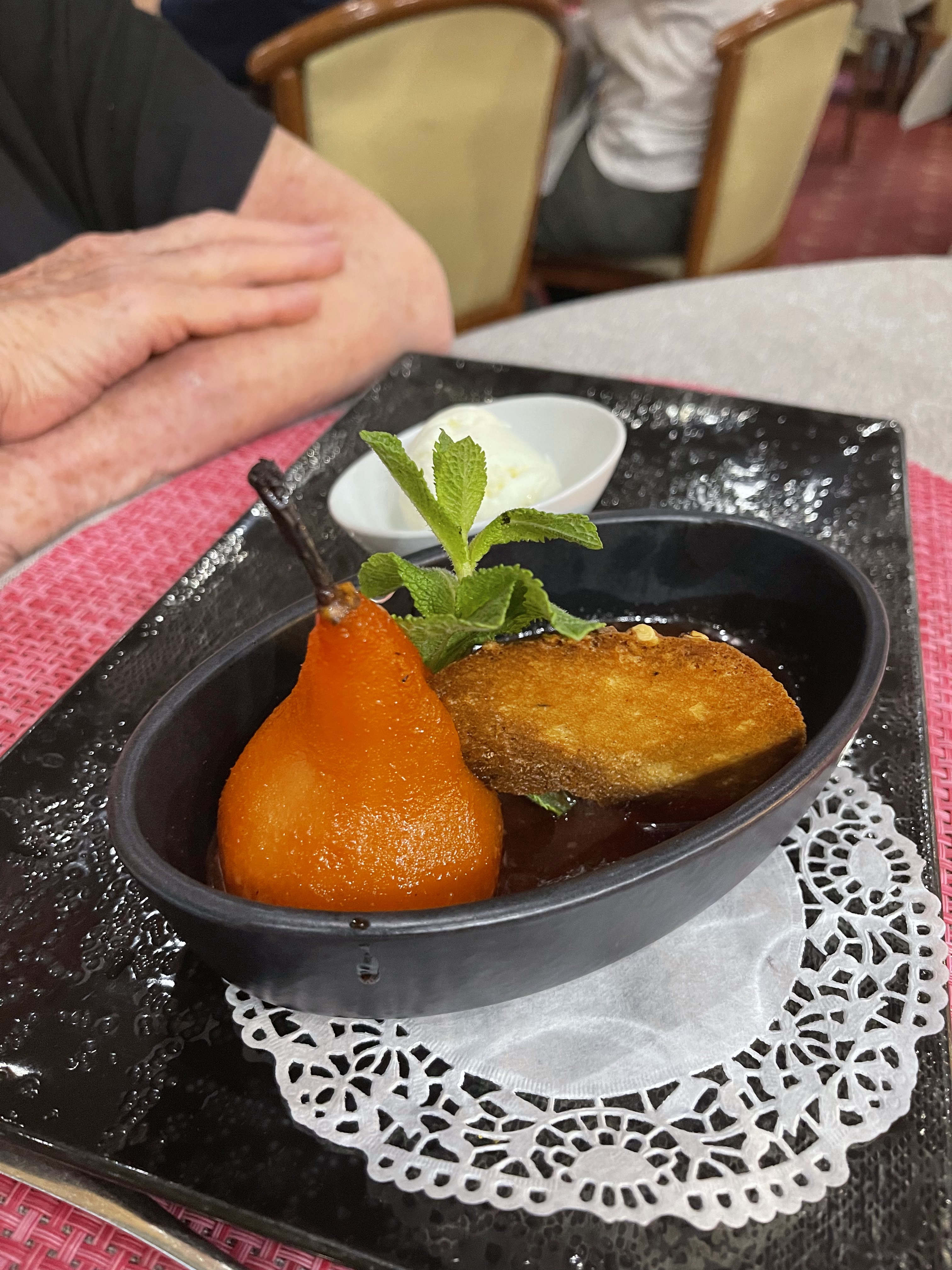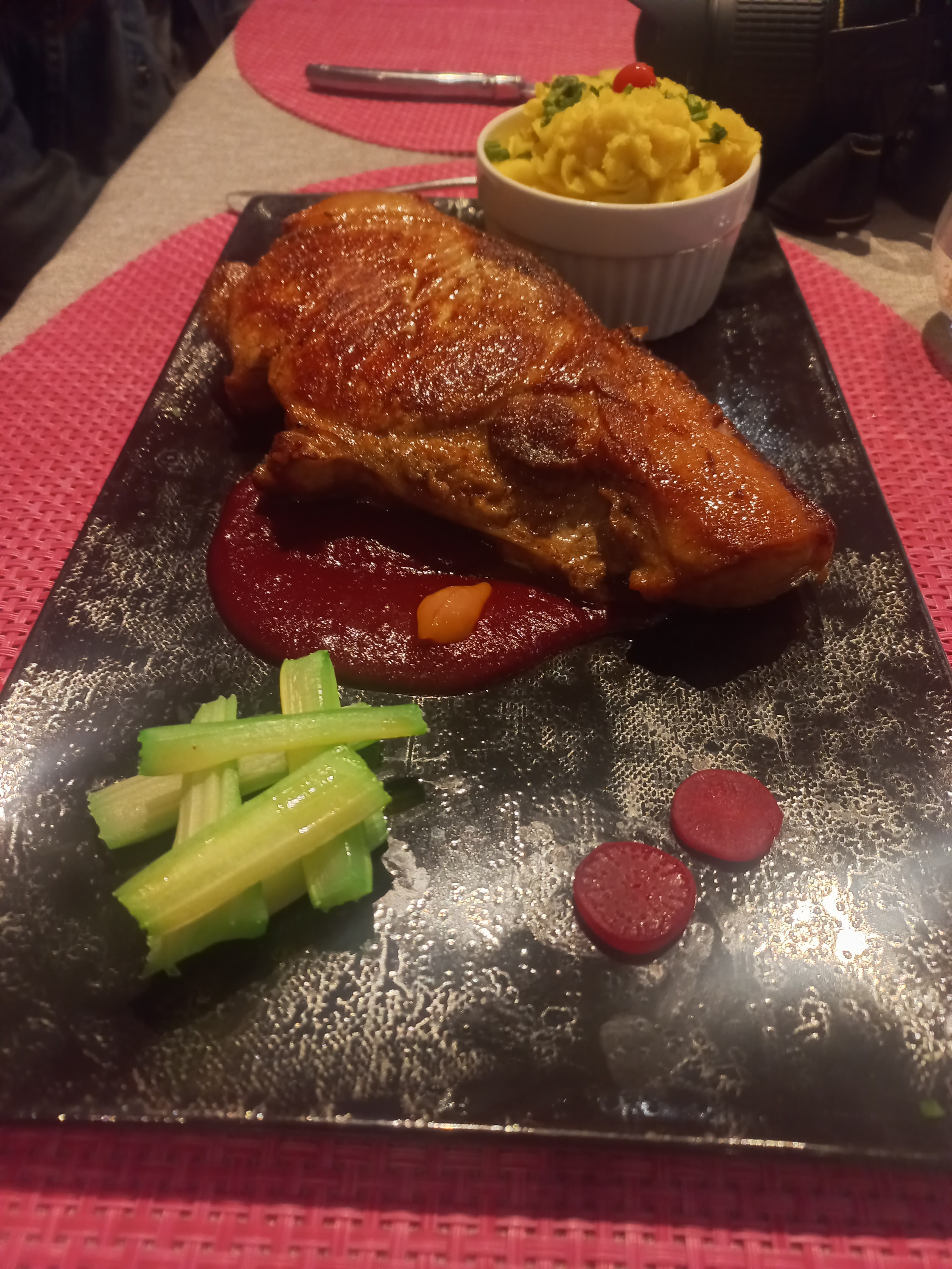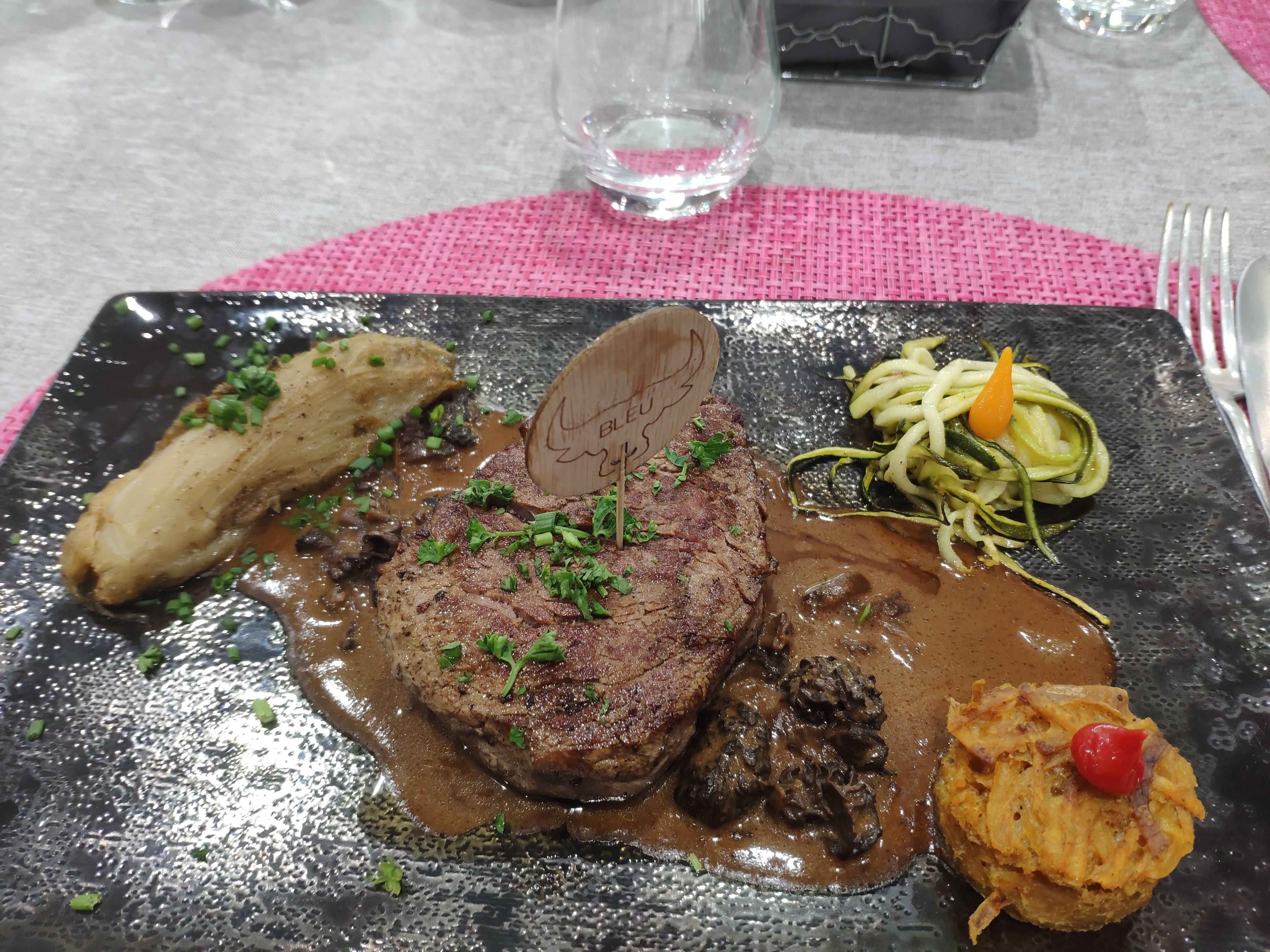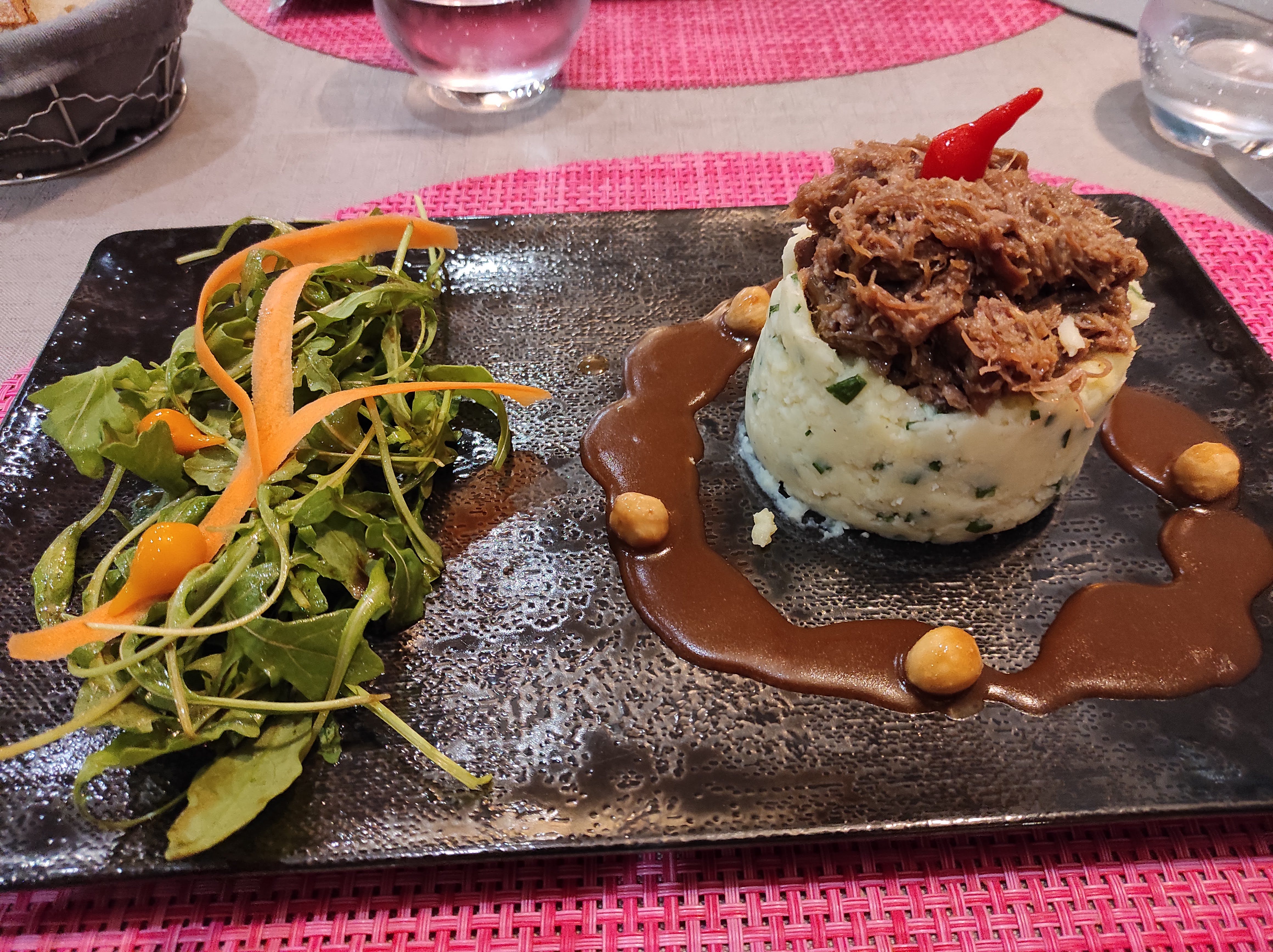 Un paleron de bœuf accompagné d'une sauce marchand de vin dans laquelle on devine un soupçon de cardamome et de chocolat noir pour une expérience gustative hors norme hors norme ! FÉLICITATIONS au chef et à son équipe discrète et disponible ! Une adresse à retenir sans modération !
