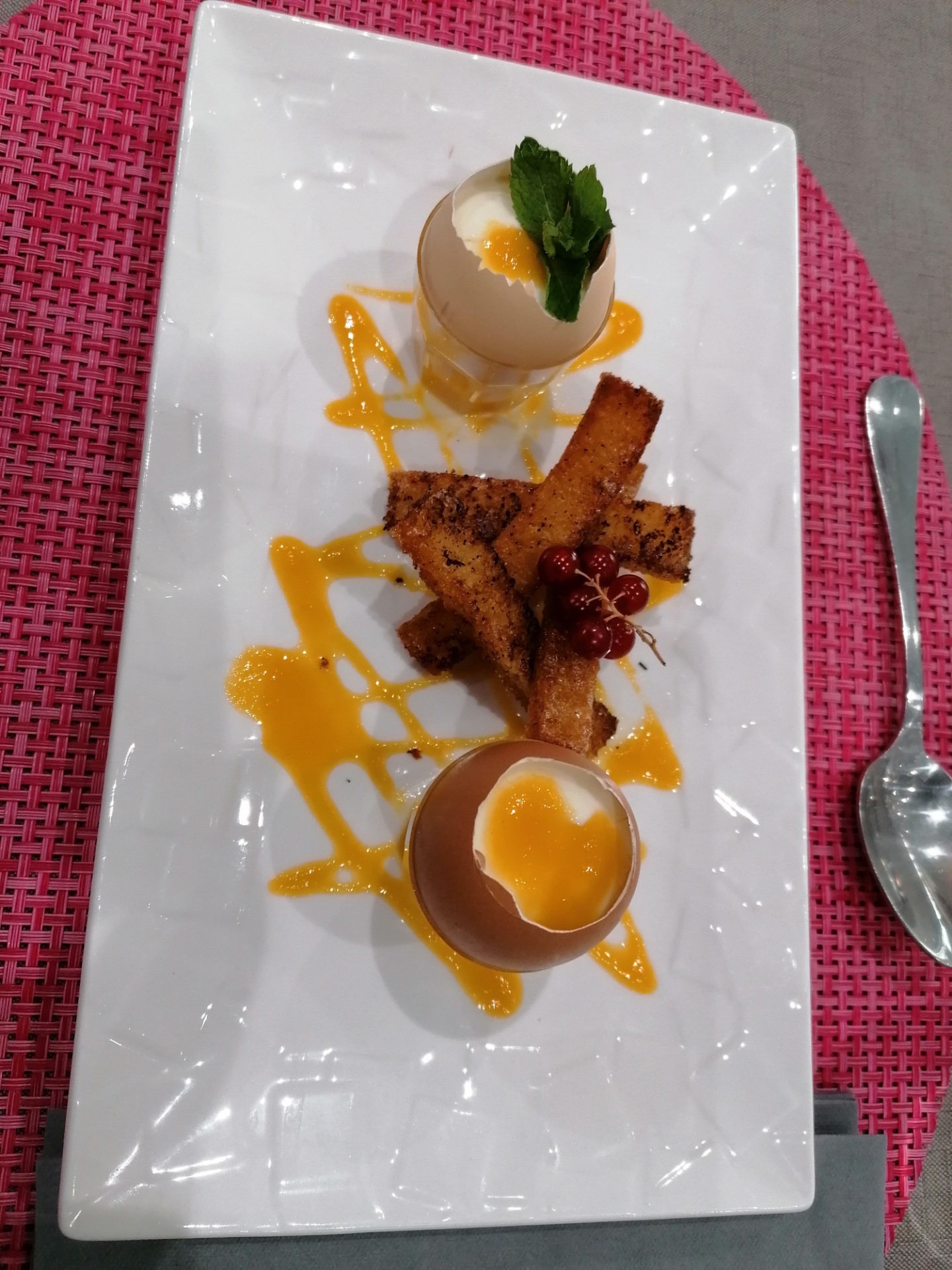 J'ai demandé un verre de vin frais pour l'avoir au dernier moment avec mon plat. Le verre de vin a été servi pas très frais et 30 minutes avant mon plat. J'avais pourtant bien insisté au début de ma commande et j'ai bien vu que cela embêtait la serveuse de me le mettre au frais. Des plats que nous avons attendus bien trop longtemps (Entre 30 à 45mn. ) Je recommande l'œuf mollet sans hésitation. Magret de canard trop cuit pour ce genre de viande, c'est bien dommage.