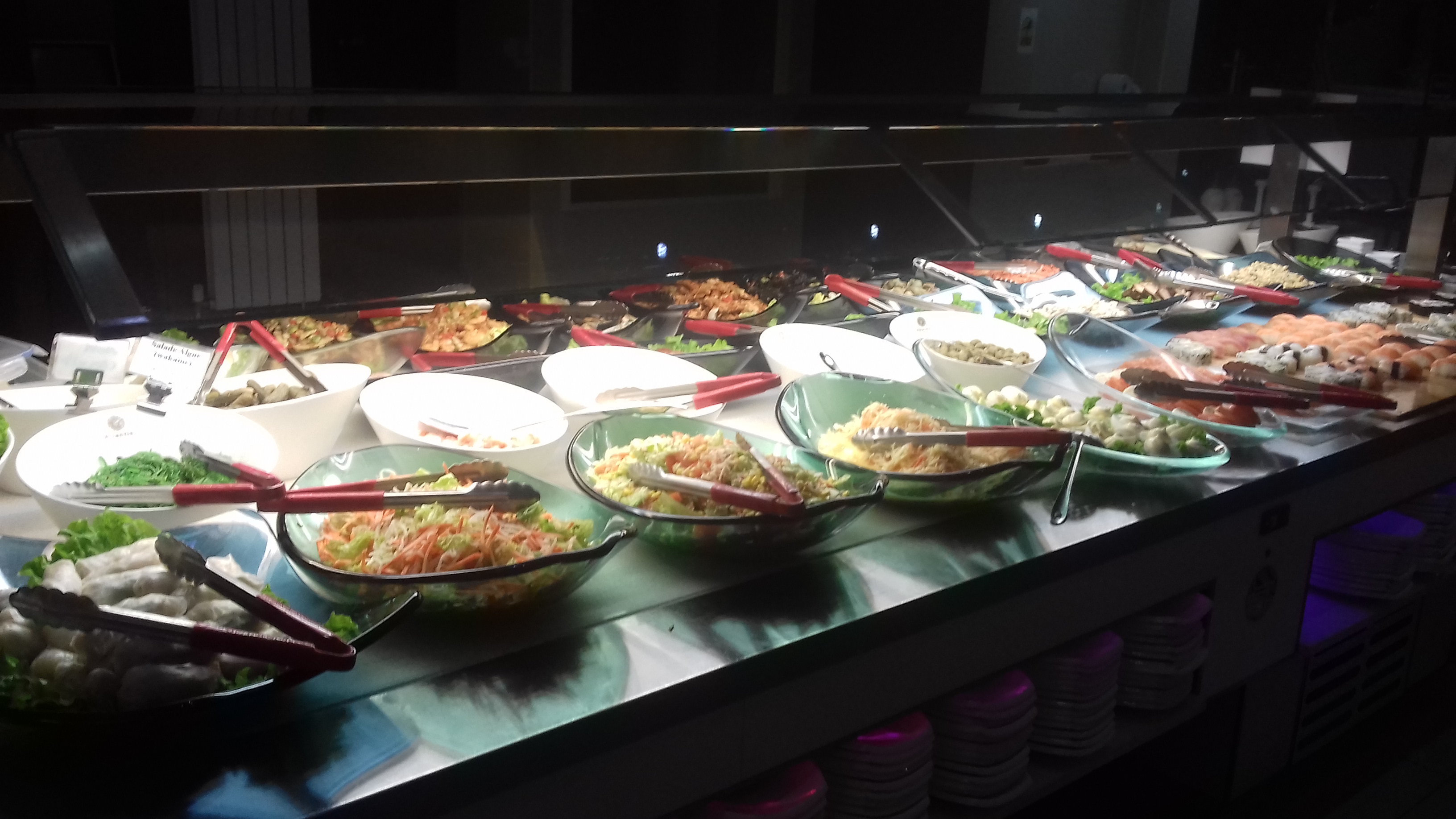 Nous ne sommes pas particulièrement difficile, pourtant nous avons été extrêmement déçu. Ce restaurant à volonté est plutôt original aux premiers abords, il propose tout les soirs un buffet et boissons à volonté accompagné d'une carte avec commande à volonté. On ne peut pas s'attendre à grand chose en mettant les pieds dans un restaurant à volonté, à l'image d'un fast food, on sait très bien ce que l'on mange. Malheureusement, la nourriture n'était même pas à la hauteur, rien n'avait de goût, c'était extrêmement fade. Le buffet est classique, similaire à tous les restaurants à volonté que j'ai déjà testé. Les sushis furent ma plus grande déception. Ils sont énorme mais blindé de riz : les poissons et légumes sont pratiquement inexistant. Le restaurant vous en met pleins les yeux avec une illusion de choix gargantuesque grâce à sa carte qui fonctionne sur commande, mais les végétariens n'ont que leurs yeux pour pleurer : nous avons payé 25€ chacun, pour manger des temakis avec une feuille d'algue pas fraîche et caoutchouteuse, des sushis à l'avocat avec plus de riz que d'avocat et des légumes frits avec un arrière goût vraiment étrange. Il est évident qu'on nous sert du surgelé ou du sous-vide. Même le choix de dessert n'a rien de ragoûtant, on se sert de la glace avec une cuillère trempée dans de l'eau trouble qui semble croupir la depuis quelque jours. Le business est clair, on a du choix, certes, mais on vous remplit le ventre avec ce qu'il y a de moins cher : le riz, la friture, les boissons gazeuses et la glace. N'y venez pas pour le poisson ou comme nous, pour l'avocat. Alors c'est certain, le restaurant en jette, le personnel est très agréable, et la salle est superbe. Malheureusement, ça n'est que de la poudre aux yeux.