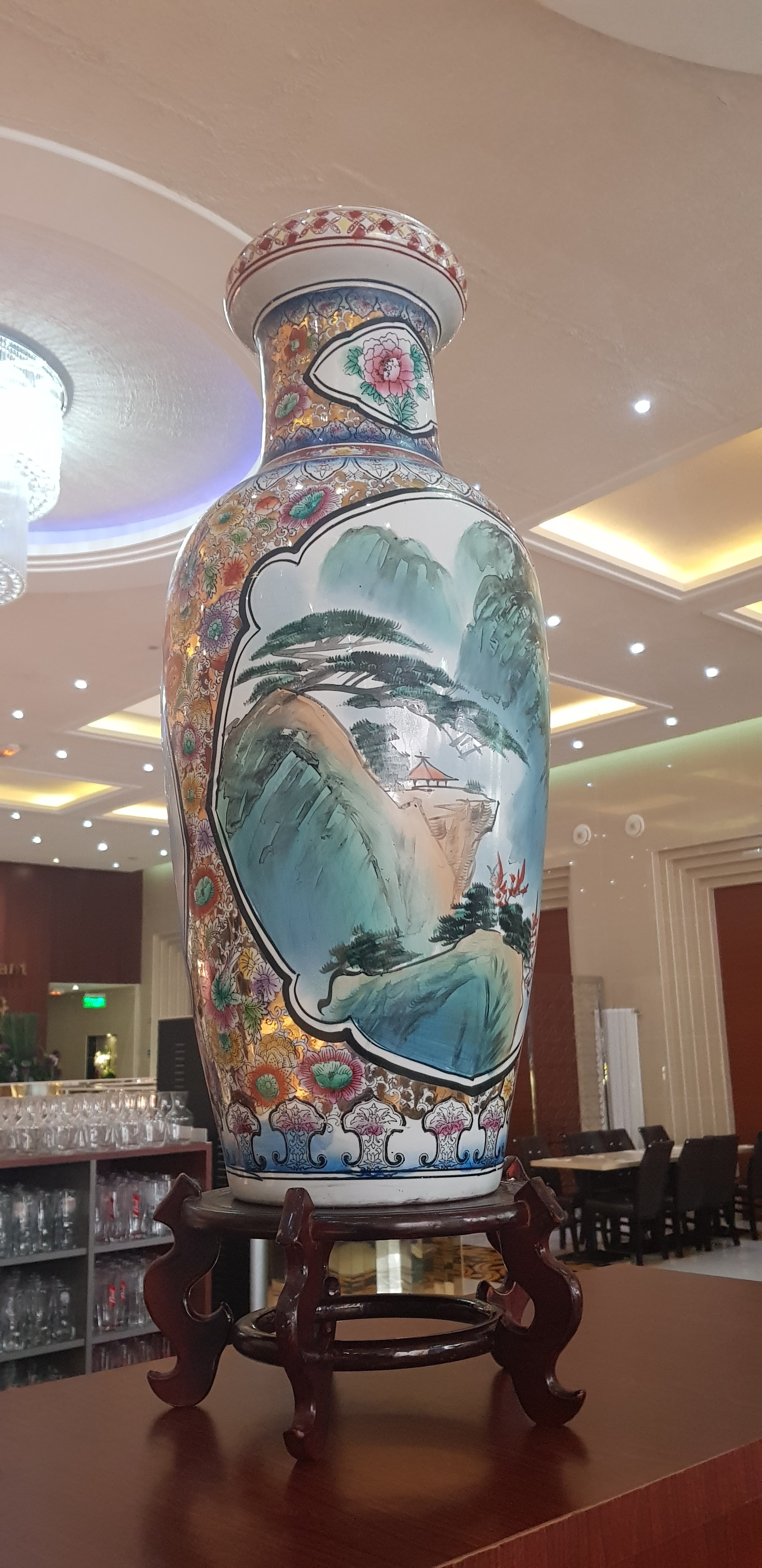 J ai complètement oublié de prendre des photos car le lieu ...plutôt gigantesque et la déco ... époque national socialisme sont époustouflants ....pas de rouge ni de brun laqué pas de rivière qui cascadeur en clignotant mais une statuaire graphique ...c'est ultra propre..personnel affable...le samedi soir c'est plus cher mais même les gros appétits trouvent leur compte...ok c'est du à volonté donc du traditionnel du buffet asiatique mais de qualité.