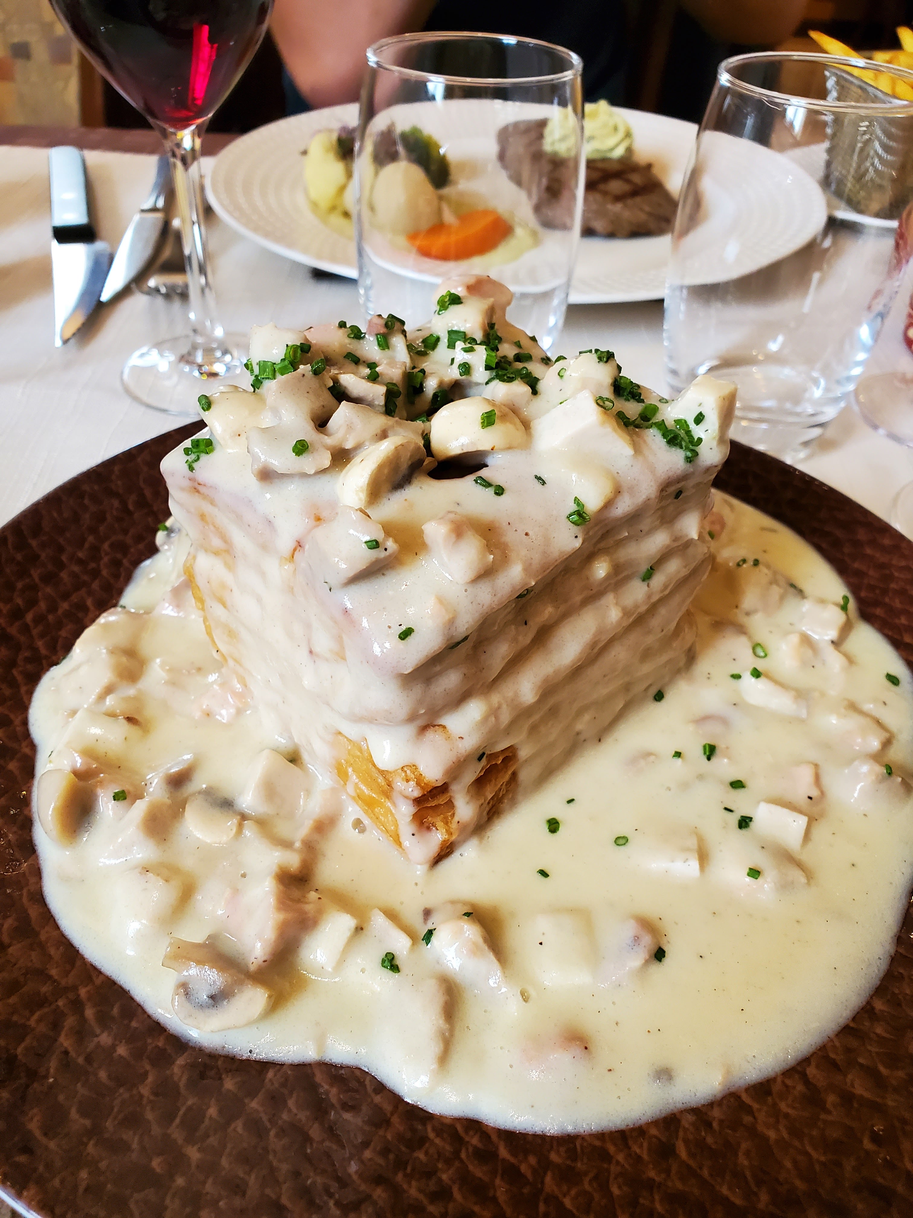 Au dîner avec ma famille, c'était un très bon repas. Il y avait le Vol-au-vont, qui était excellent. La recette vient de la grand-mère des propriétaires. Extrêmement riche et savoureux. Ma femme et mes enfants ont mangé un steak. Je ne suis pas sûr qu'ils soient aussi heureux que moi de mon steak. Tout était frais, Anna le restaurant est très propre.