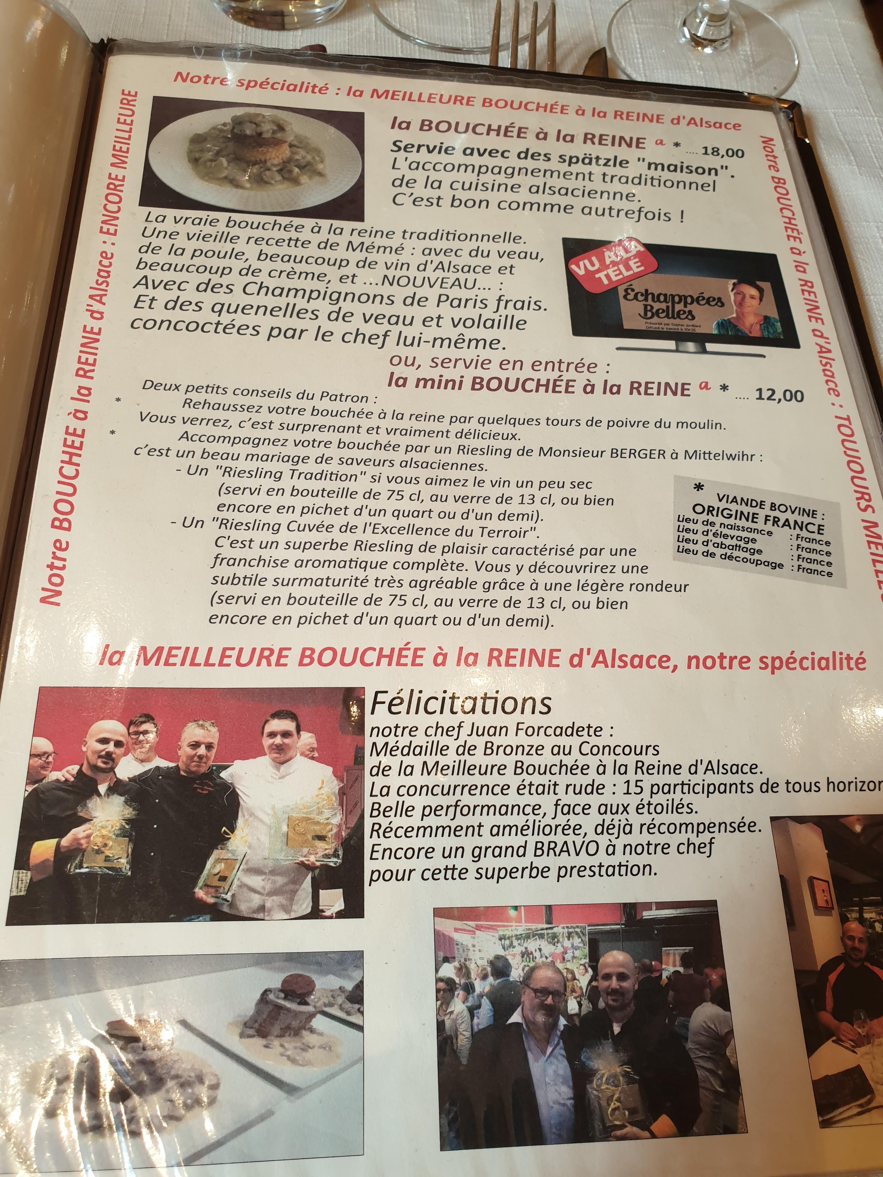 Vous aimez la bonne cuisine ? Un service très sympa et compétent ? Les bouchées à la Reine, une tuerie... Allez-y les yeux fermés vous ne pouvez pas être déçu. Un conseil, réservez avant, on est plusieurs à connaitre. Probablement un des meilleurs restaurants Alsaciens.