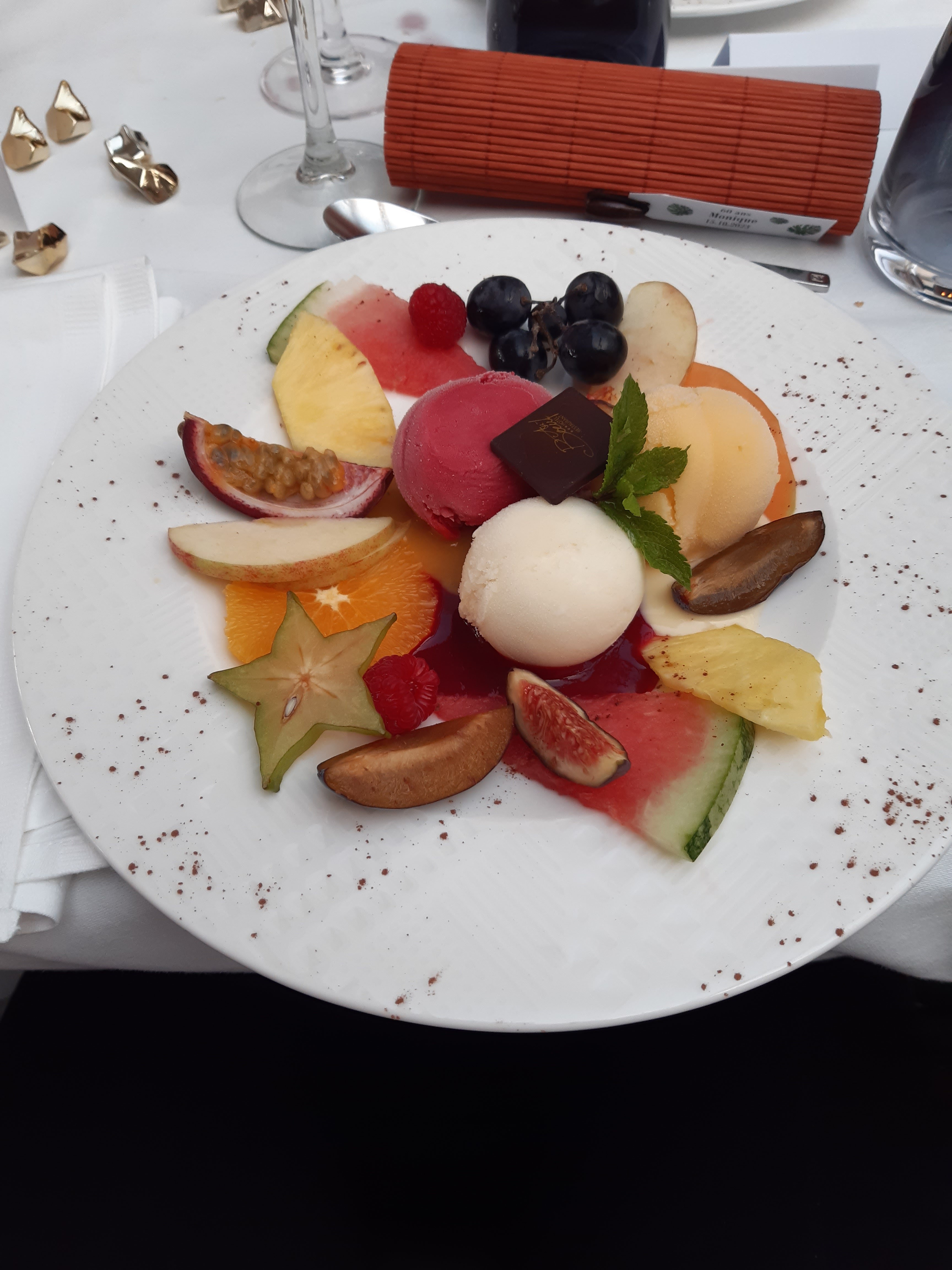Mariage. Très bon dîner. Belle présentation soignée Dessert fabuleux ( assiette gourmande ) Merci