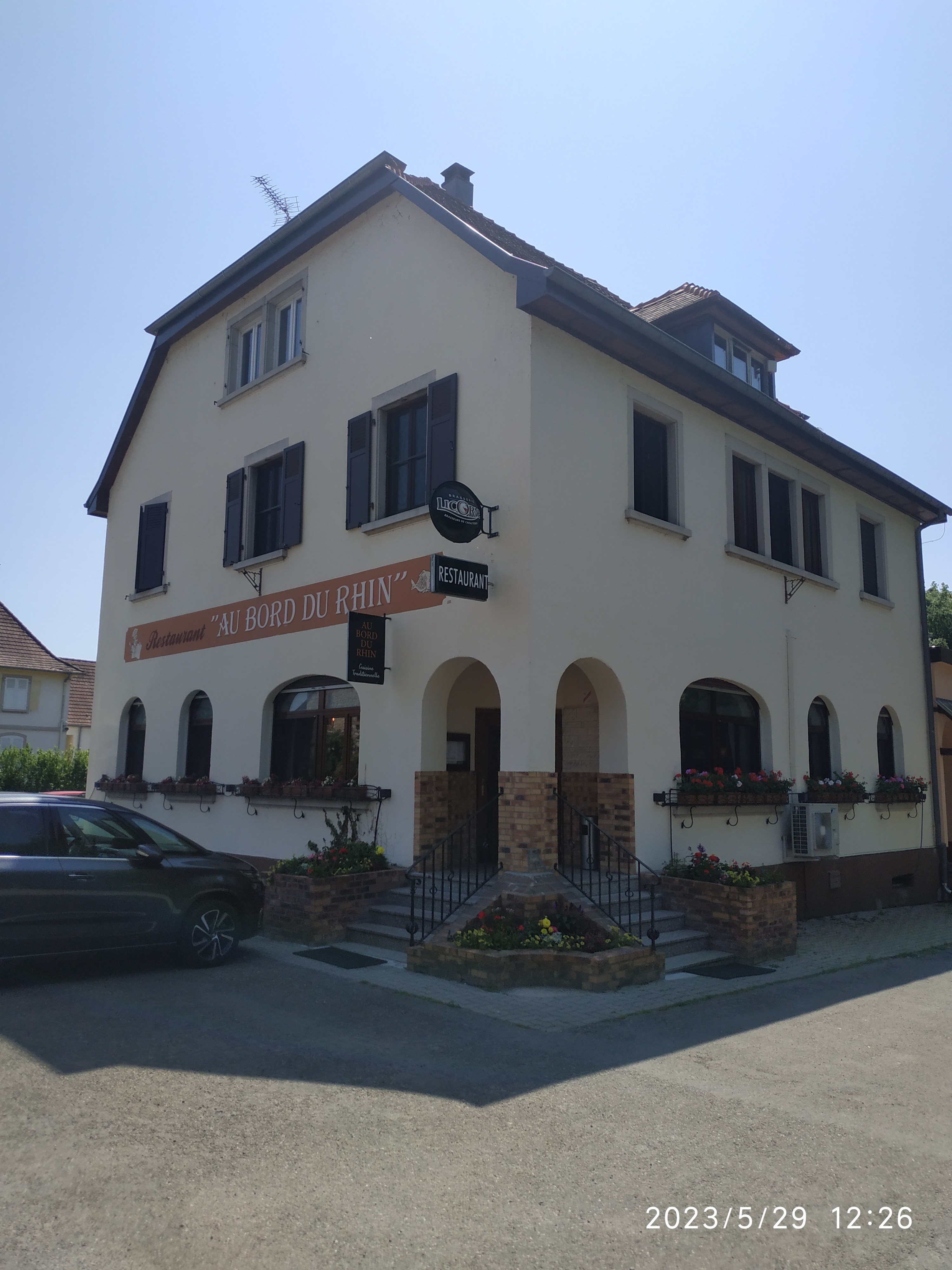 Resto réputé depuis des décennies sinon un siècle ! Dans le temps c'était chez Steinmetz, Au début il y avait un pont de bois pour aller en Allemagne remplacé ensuite par un bac automoteur qui traversait le Rhin juste a coté, il fallait montrer patte blanche à la douane car l'Europe n'avait pas encore aboli les frontières, le service de la navigation, et quelques maisons de fonction. Le pont qui y menait était aussi en bois, le site était inondé chaque printemps à la fonte des neiges dans les Alpes, le Rhin des cerises débordait encore. Il n'y avait pas le Grand Canal d'Alsace ni le barrage plus haut qui permet de passer a présent en Allemagne sans contrôle. Quelle époque ! Bref, une étape gourmande très bien reprise par les nouveaux propriétaires qui se donnent beaucoup de peine et mettent leur talents culinaires et leur savoir-faire et savoir-être au service des clients ! Nous y mangeons régulièrement, car c'est une valeur sûre ! Nous avons à nouveau très très bien mangé, trop même, car c'était tellement bon et le rapport qualité-prix est très bon. Merci d'avoir perpétré l'excellente réputation de la maison, qui est très courue par les voisins allemands, qui n'ont pas la chance d'avoir de la si bonne cuisine chez eux ! A bientôt, et merci d'exister ! Le 30-04-2024, je viens de rajouter une carte postale représentant la rive allemande avec le pont de bateaux et le bac qui permettait aux allemands de venir bien manger au bord du Rhin et aux français de faire leurs courses chez le voisin !