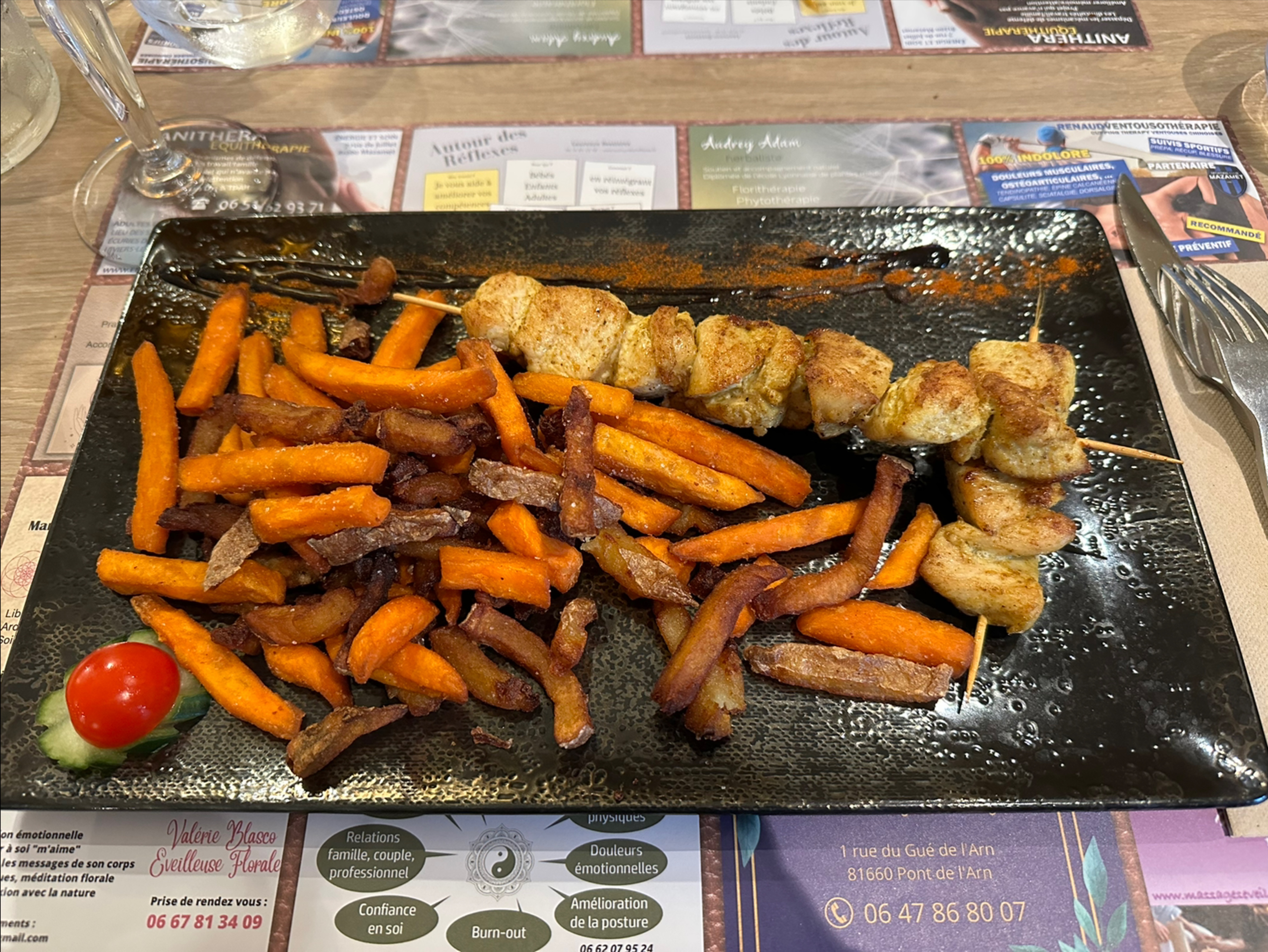 Arrêt improvisé où nous avons pu déguster 2 tartares coupés au couteaux accompagnés de frites maisons. Terrasse sous parasol. Une table à retenir à 2 pas de l’office de tourisme