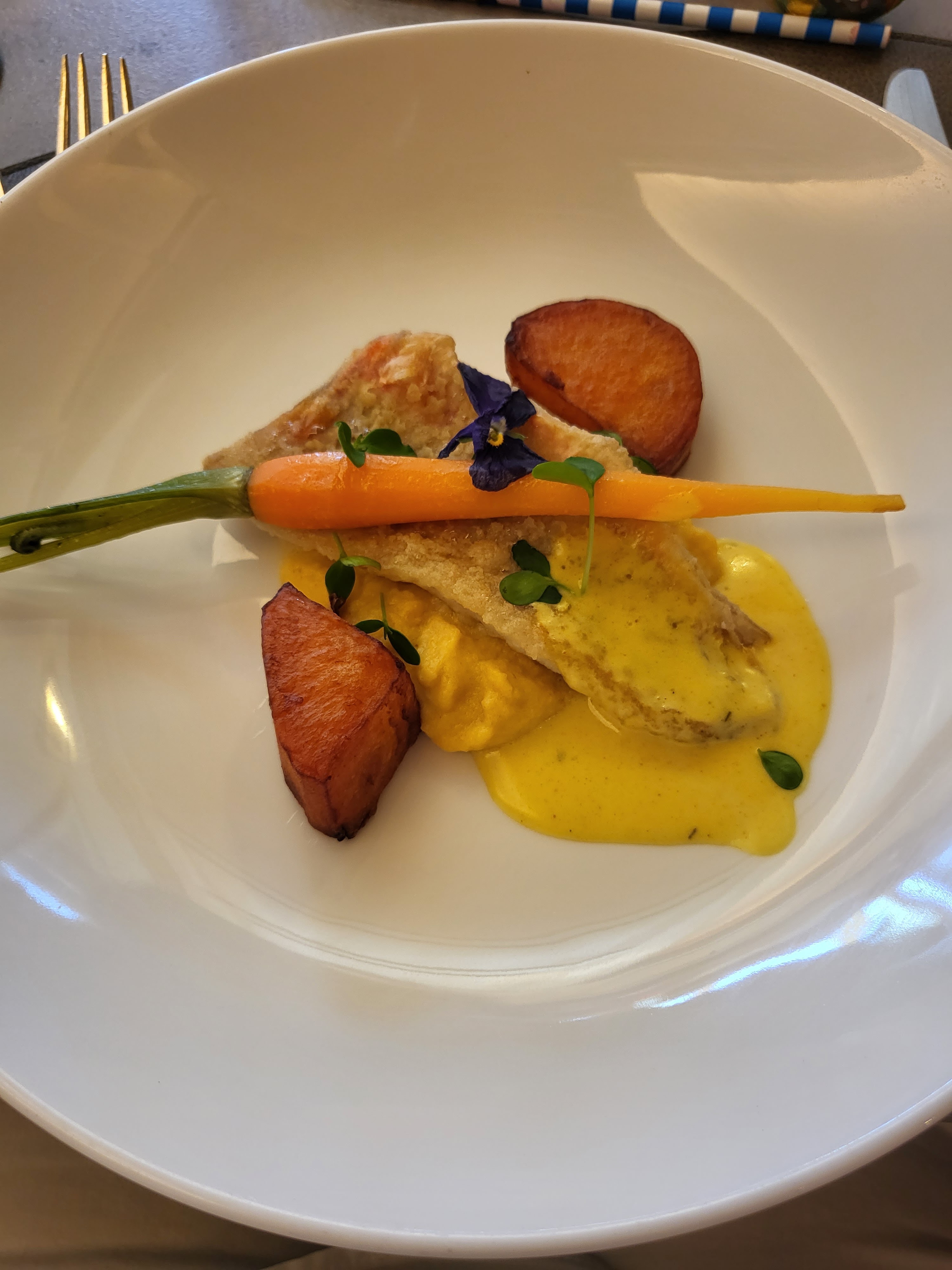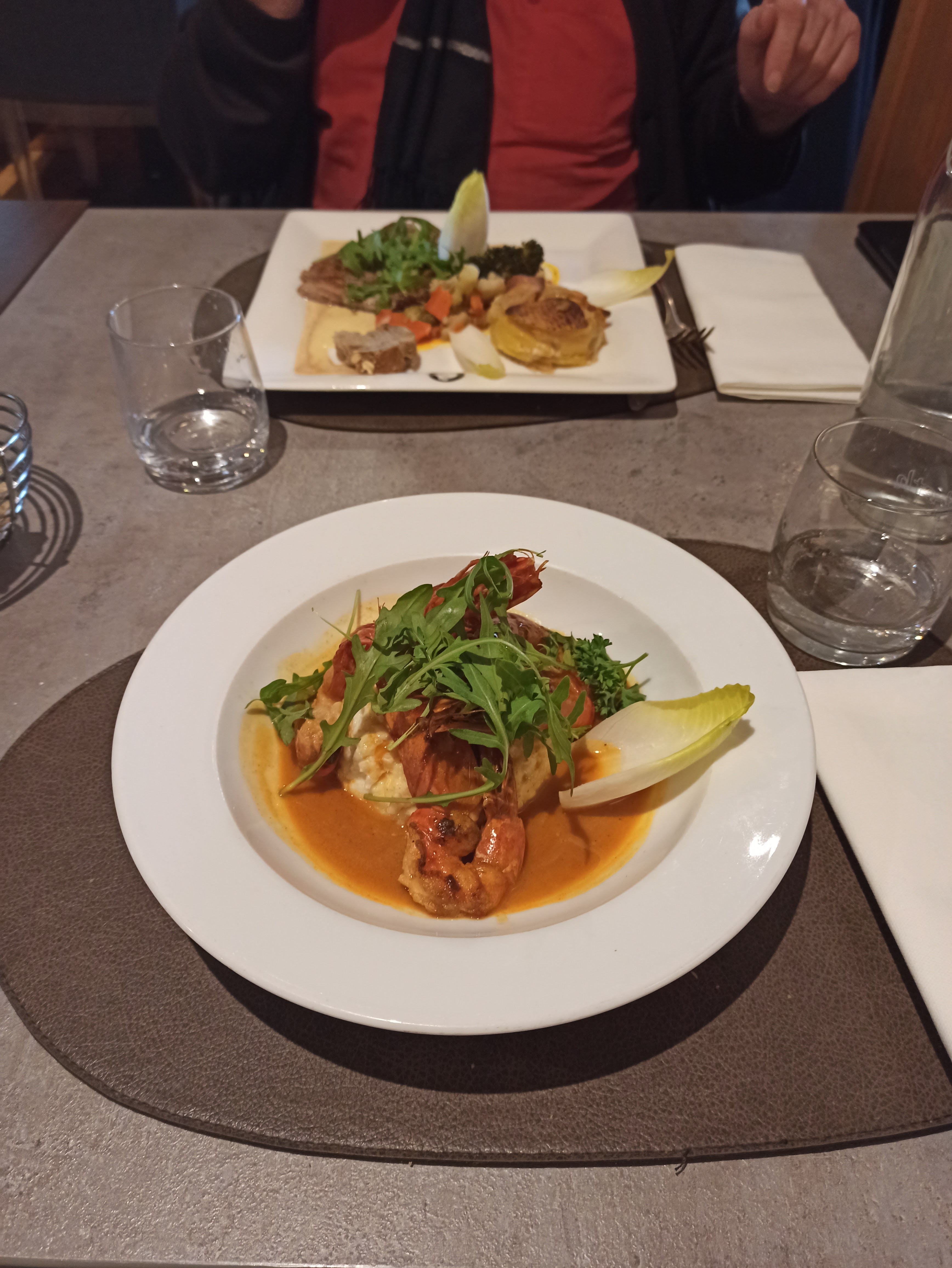 Restaurant propre et sympa.L'apéritif mériterait un petit accompagnement. Avons mangé correctement bien que les légumes accompagnant les plats étaient quasiment crus.(viande et poisson très bon) Pour le dessert il manquait une tuile. Changer de fournisseur de pinot noir...Malgré cela nous reviendrons !