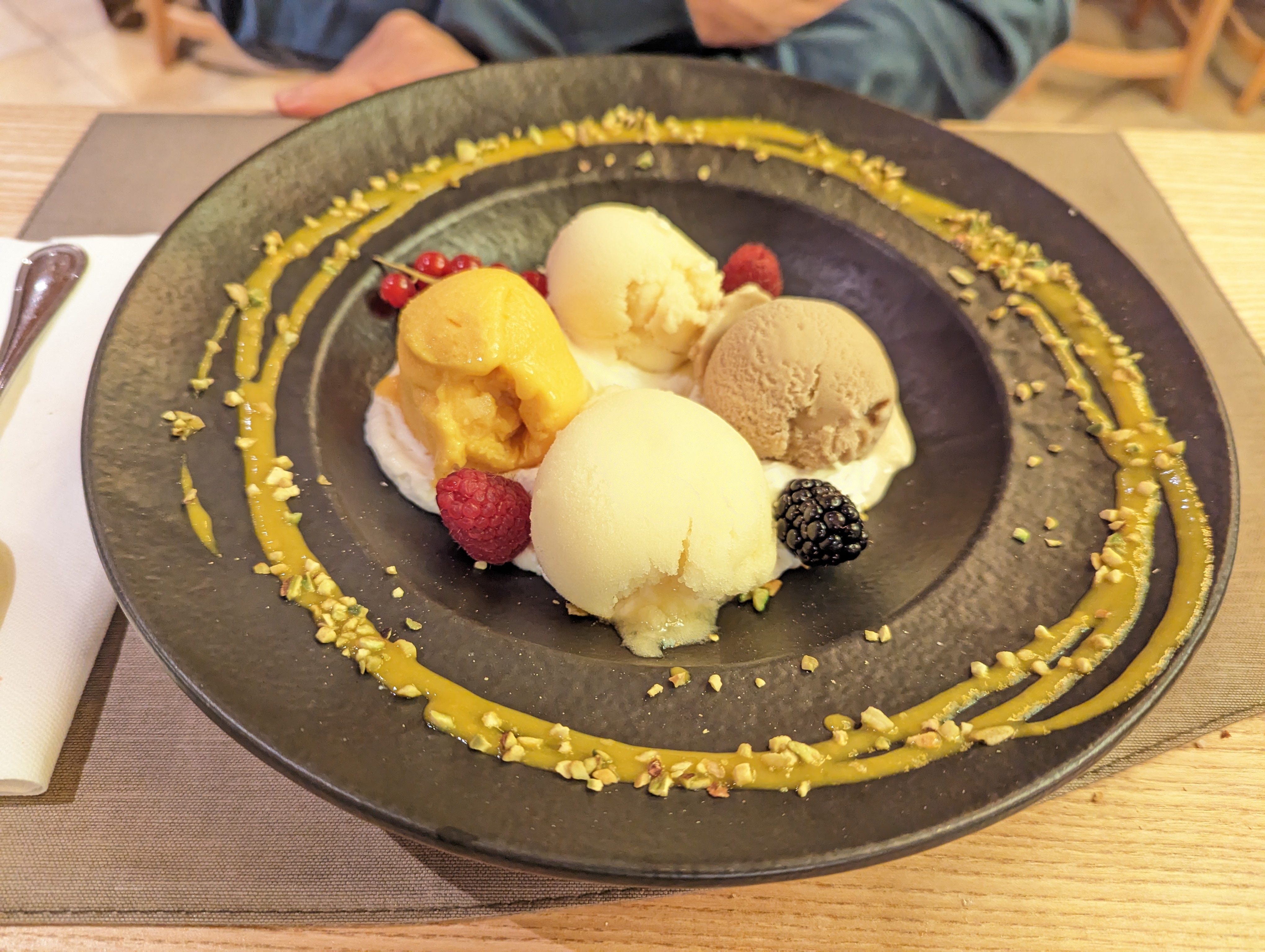 Un bon endroit, mais la déco et surtout les sièges en plexiglas dans un décor de superbes boiseries pique la rétine. Le plat principal était très bien mais le dessert par contre... Une sorte de coronavirus fait de crème de marron dans une coquille de chocolat avec une purée de pistache et des feuilles de salade (si si) Un goût indéfinissable et je cherche encore le message. Parfois quand on veut en faire trop on fait n'importe quoi. Mais je pense y revenir tout de même.