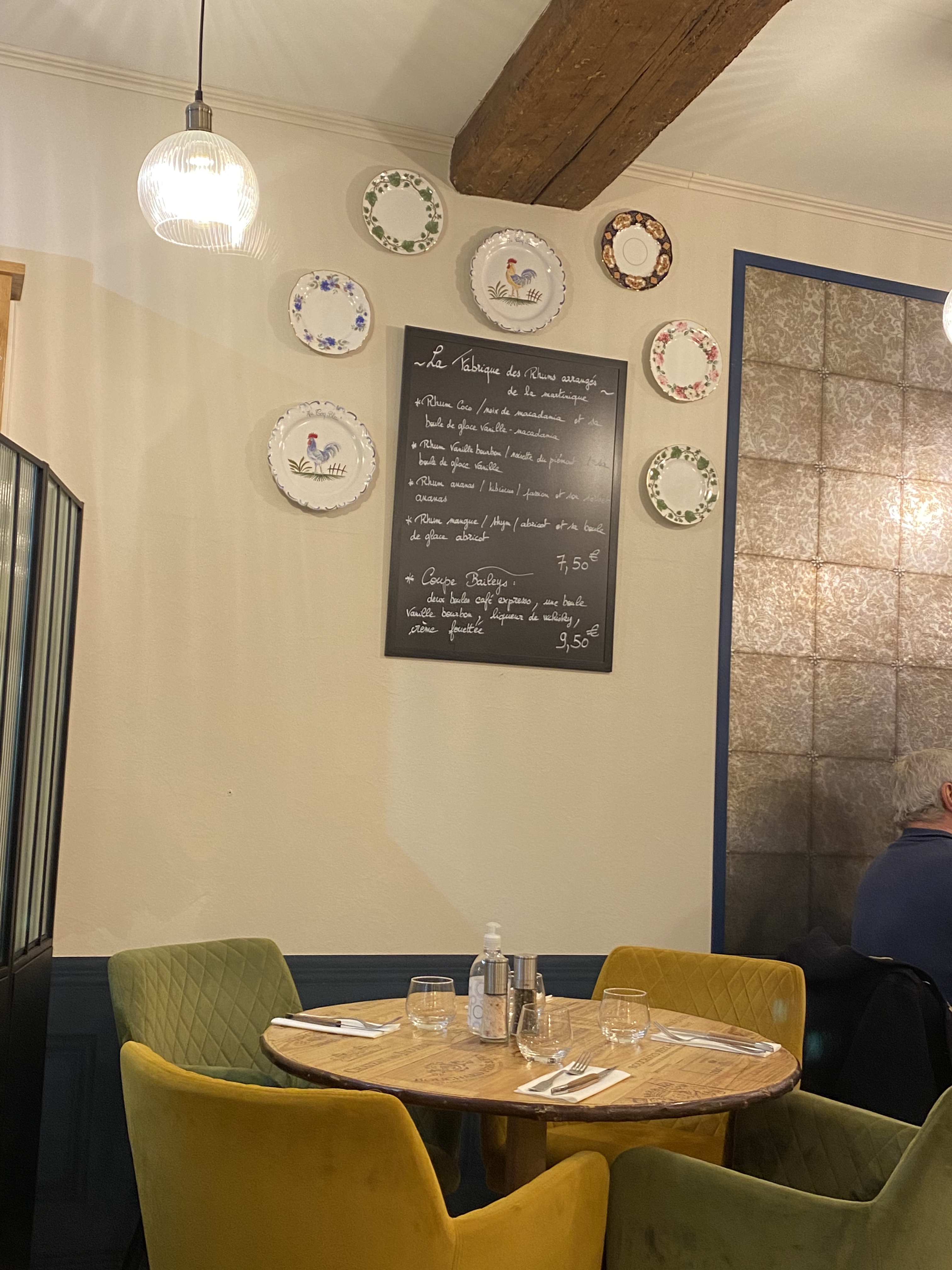 Plats excellents ( poulet Gaston Gérard et coq au vin) baba marc de cassis. Vins au verre excellents.Accueil parfait. Personnel très sympathique. Je recommande vivement