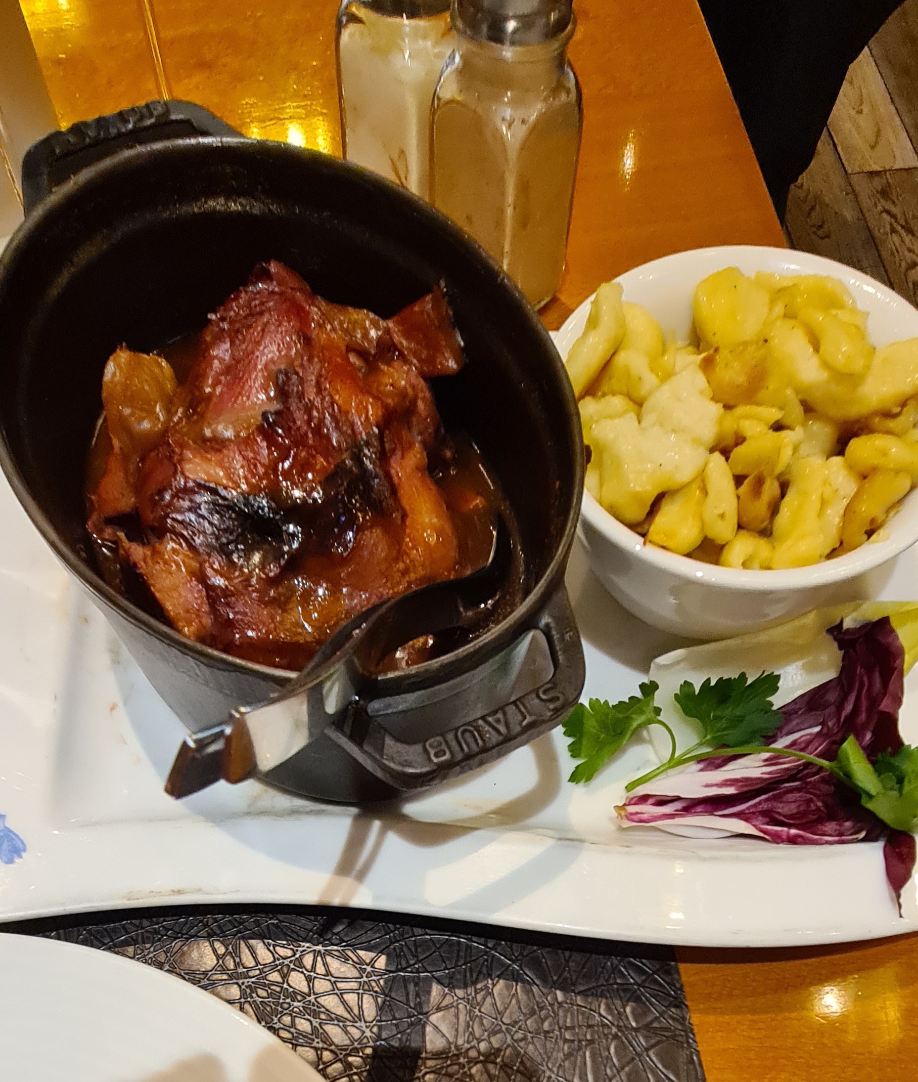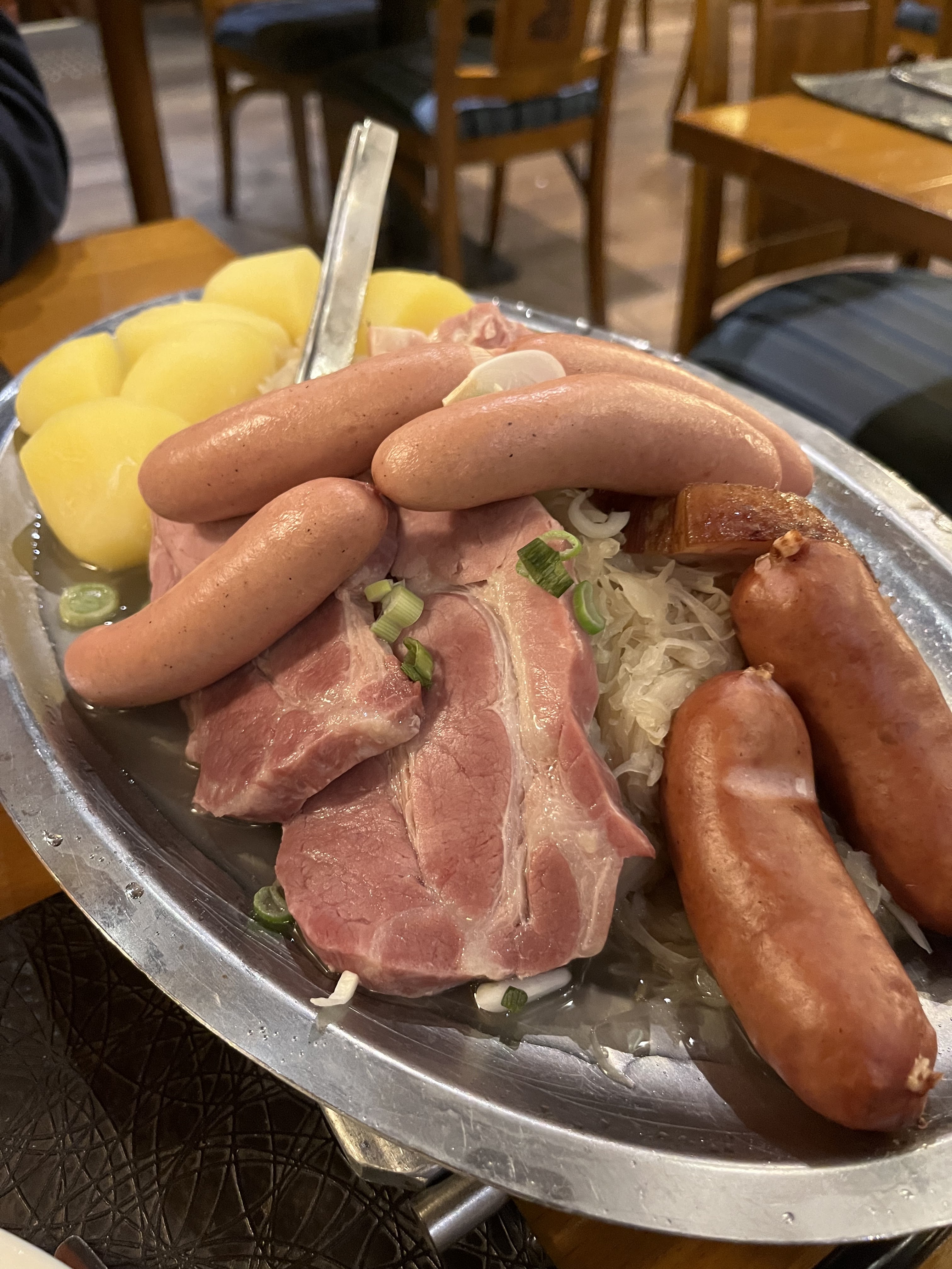 Un bon restaurant,le serveur est très sympa. On a pris une assiette de fruit de mer à partager. Puis 2 plats : jarret braisé au pinot noir et poitrine de cochon cuit 48h. C’était très bien se passé.