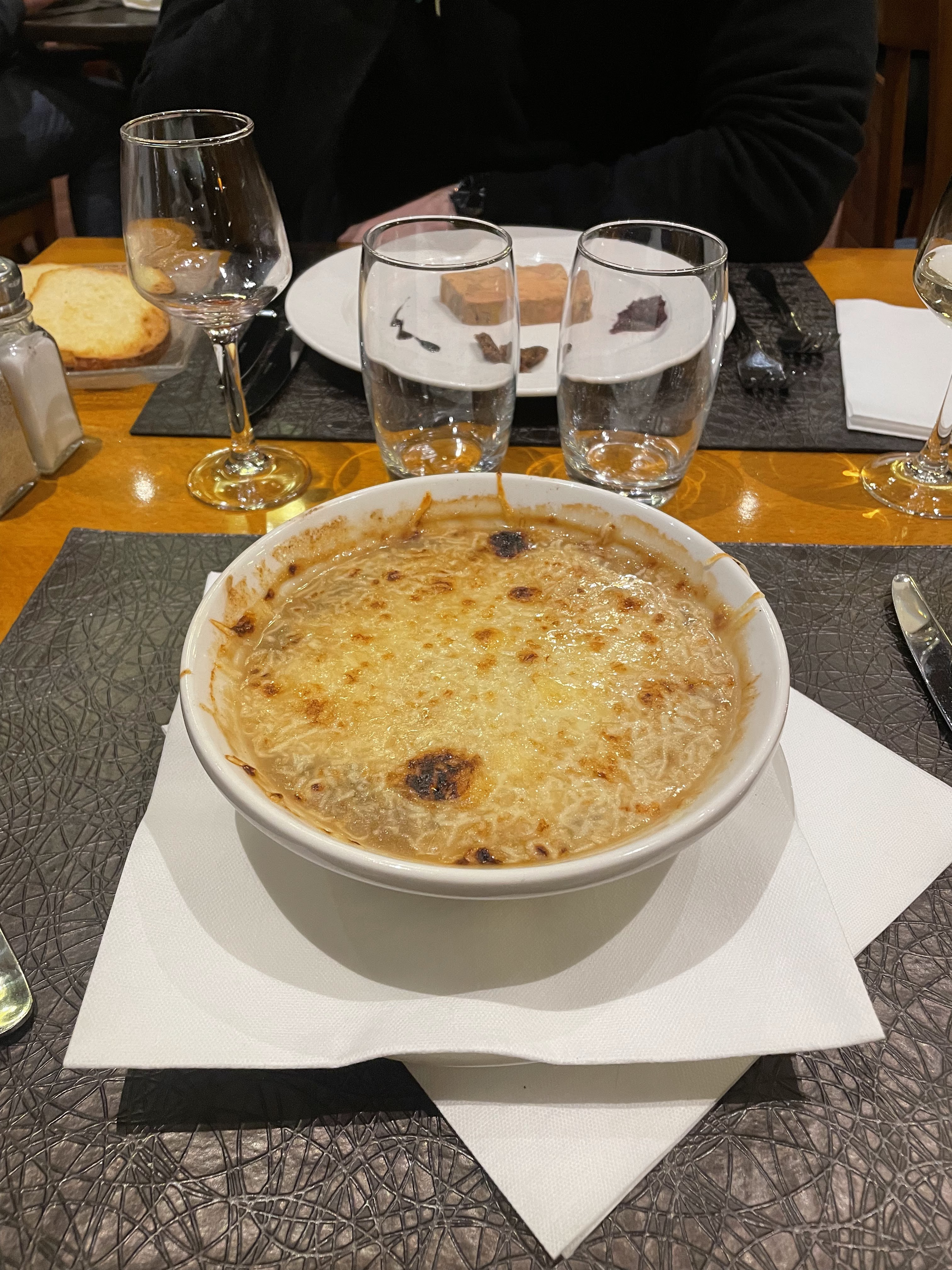 Soupe a l’oignon tres bonne mais bien chargée en pain et fromage La flamenkuch au fromage de chevre est folle pareil pour le jarret, civet de cerf et les bouchées a la reine