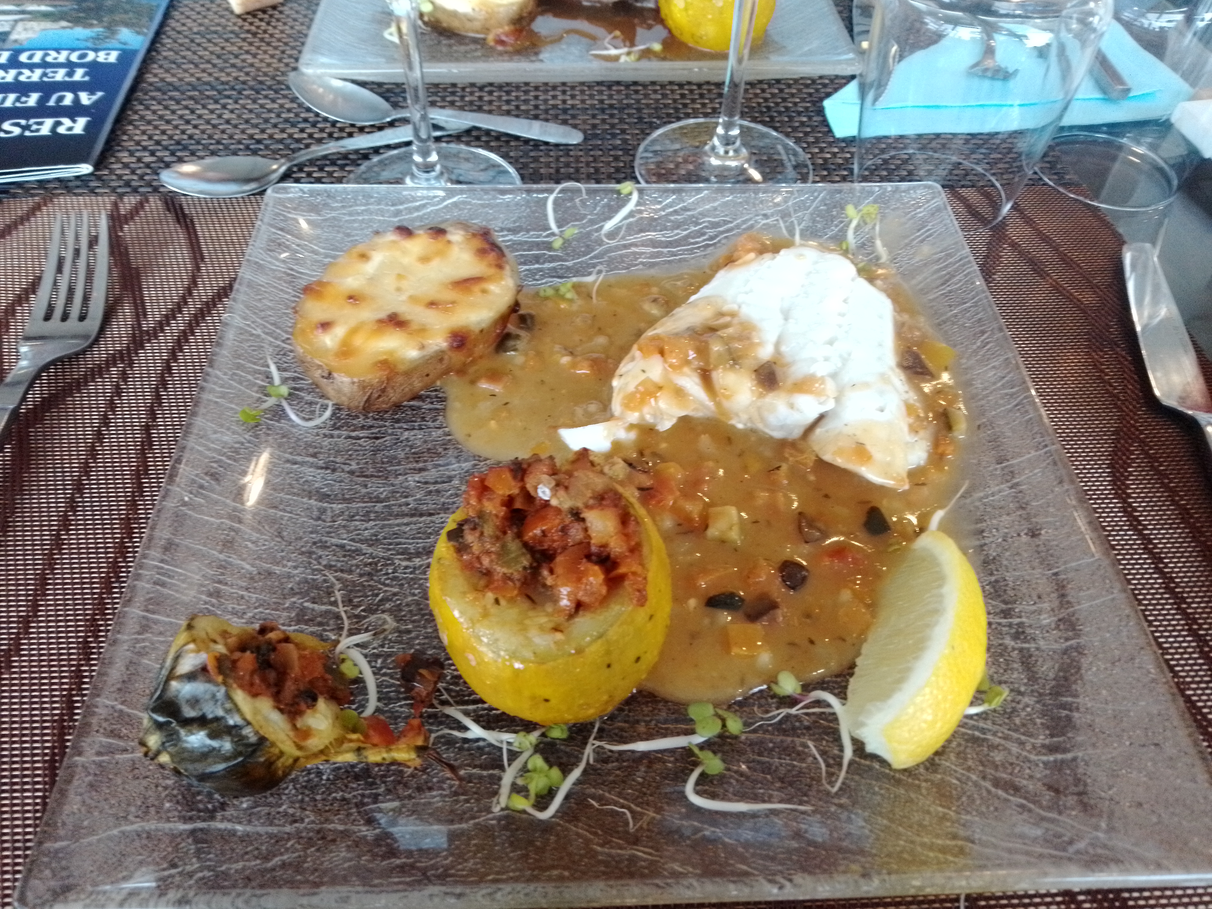 Un service assez expéditif, pas eu le temps de prendre l'apéritif que le plat principal était déjà servi. Pas possible de dîner en terrasse au bord de l'eau. Dommage.