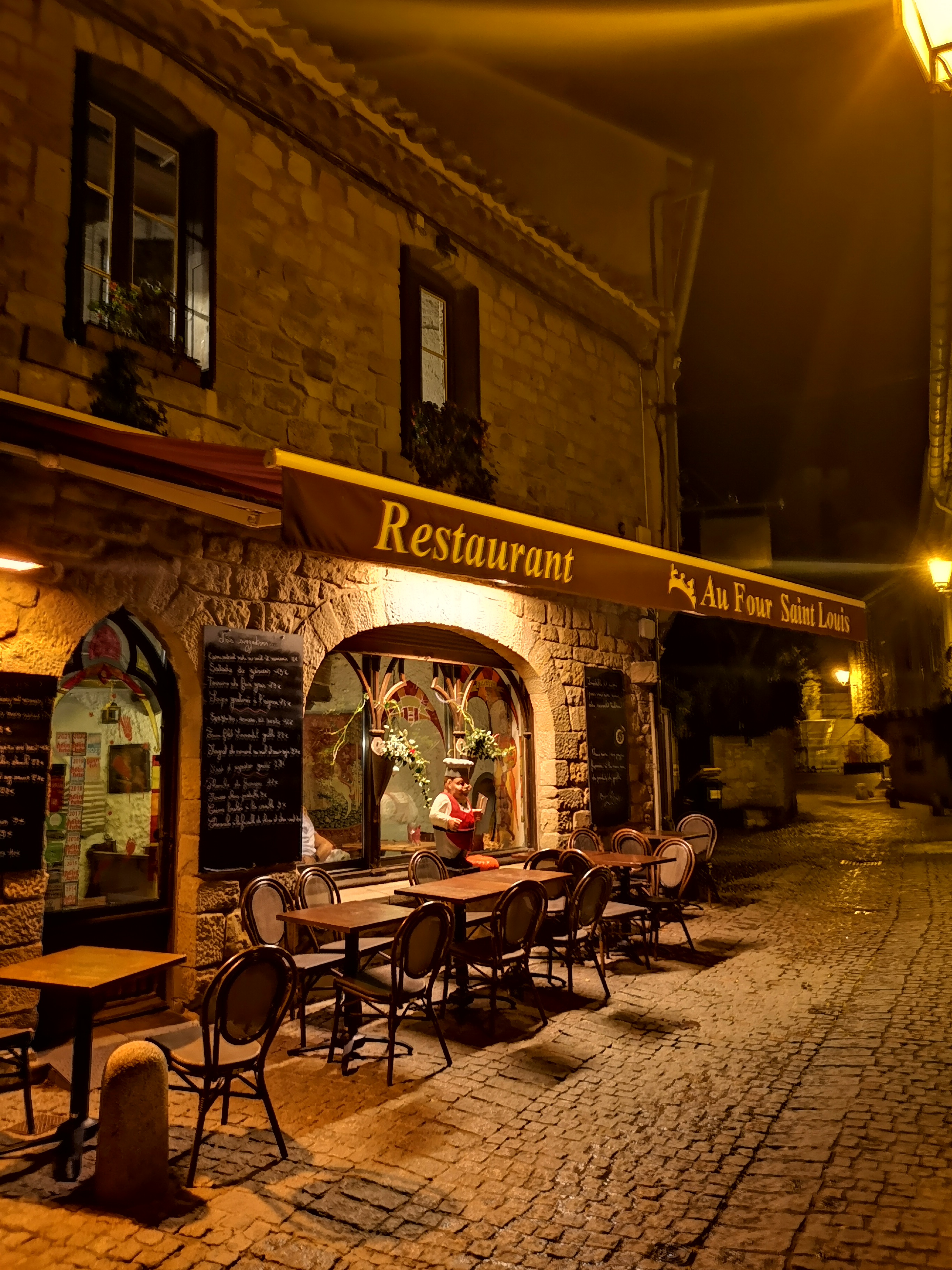 C'est au détour d'une des rues pavées, entre les hauts murs de vieilles pierres, que nous avons décidé de nous arrêter au Four Saint Louis ; Nous pensions le restaurant plein, une petite salle en bas, derrière de fine vitre, mais il n'en était rien, une salle en haut se cachait à nos yeux ; à peine la porte poussée que la serveuse nous approche avec un grand sourire pour nous placer, dans une ambiance feutrée, familiale, au coin du feu, proche des vieilles pierres et attablés autour d'un vieux bois ; La carte est simple, complète, quelque peu touristique pour quelques plats, mais évidemment, il ne faut pas en tenir rigueur, hamburger et consorts étant malheureusement le lot de beaucoup de touristes... en revanche, nous avons décidé de nous délecter d'un cassoulet incroyable, et je pense qu'il est important de dire que celui ci était VRAIMENT incroyable ; un rapport qualité prix très correct, un repas dans une ambiance familiale, des plats savoureux et très réconfortants, je recommande fortement cette adresse pour une pause gourmande.