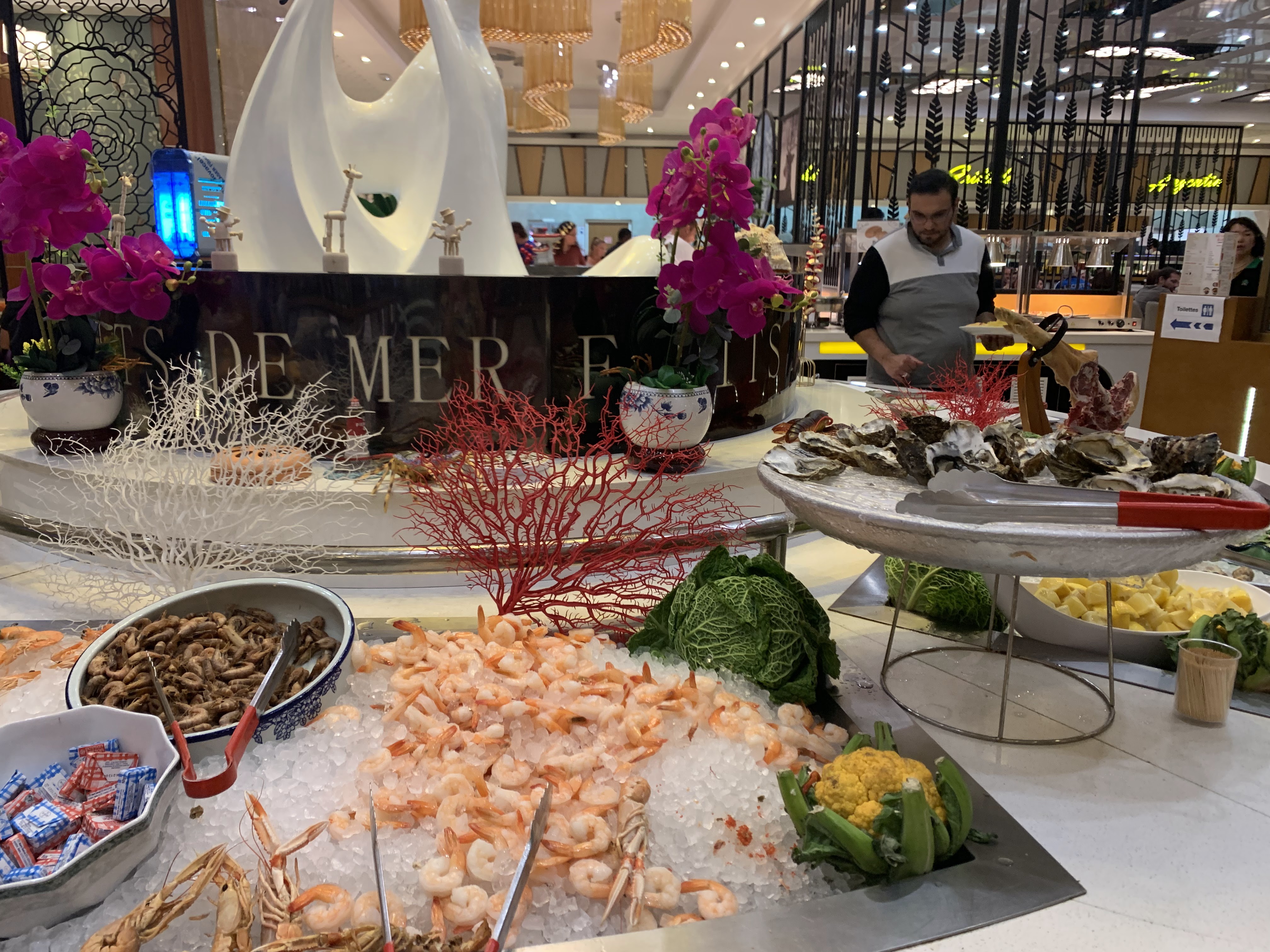 Avec un joli accent du personnel aimable et souriant et très efficace un très très grand choix de plat passez par les crustacés ensuite par les spécialités asiatique pur des plats plus traditionnels et voir si vous avez les déserts et un petit souvenir de. l'enfance les bonbons!!! donc prenez votre et allez manger au grand buffet je ne suis pas actionnaire mais une vielle femme qui a bien mangé !! pour un prix compétitif merci à tout le personnel et aux cuisiniers kdv