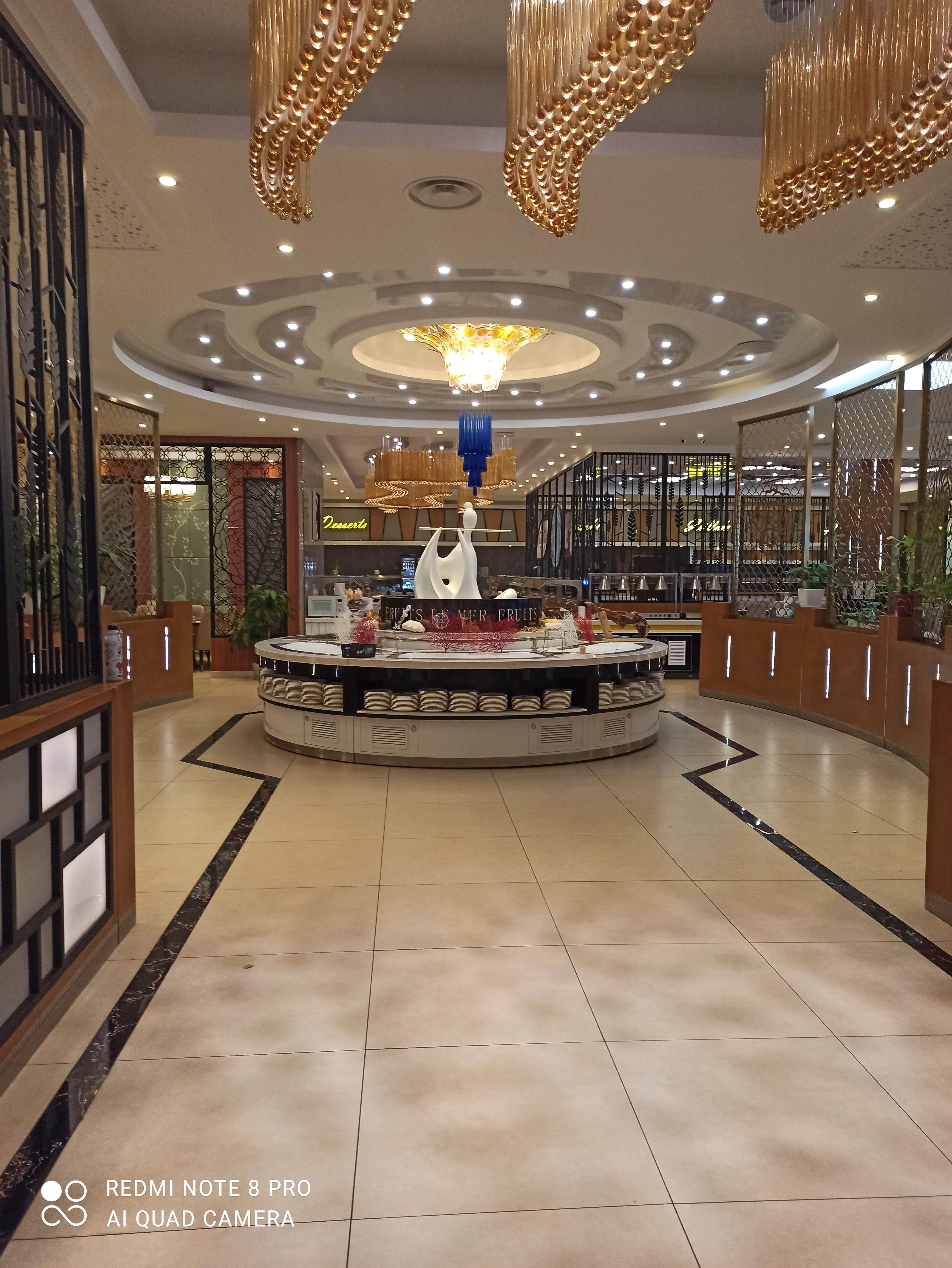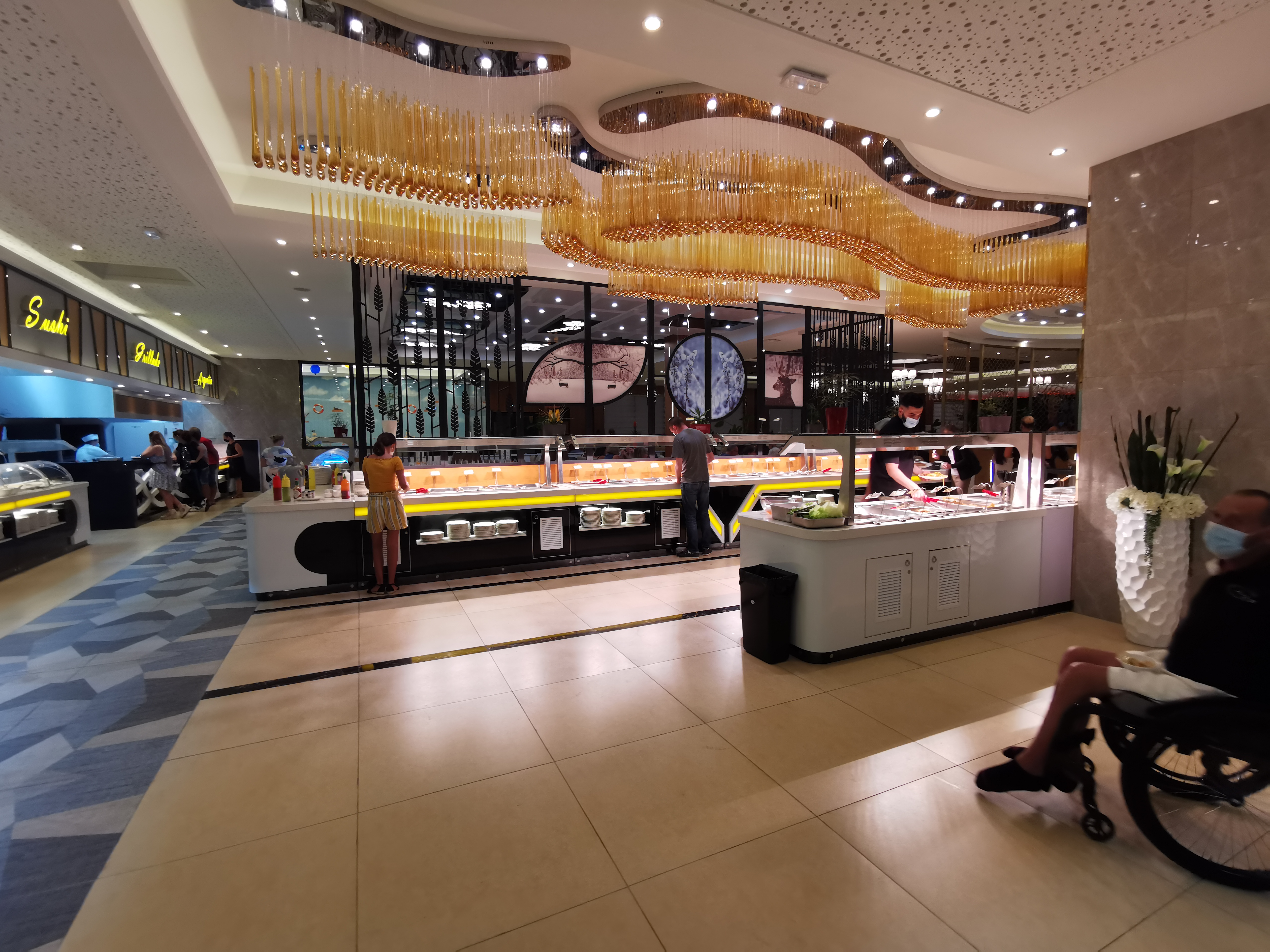 Restaurant très jolie , certaines personnes sont servie par des robots rigolo . Mais ceci dit le restaurant et tellement grand que c'est très très bruyant un brouhaha a table on ressort avec la tête en vrac pas très reposant quand on vient pour s'y détendre . Le buffet et très varié ceci dit pas d'organisation tout le monde vient de partout . Les gens se servent les viandes de porc avec les pinces qui sont dans les viandes halal , les viandes sont cuites pareille. L'accueil n'était pas très accueillants . Mon mari est mon fils on eu mal au ventre après mon fils me dit que les nuggets n'était pas terribles a voir si il été bon encore ou pas . Je n'y retournerai pas .