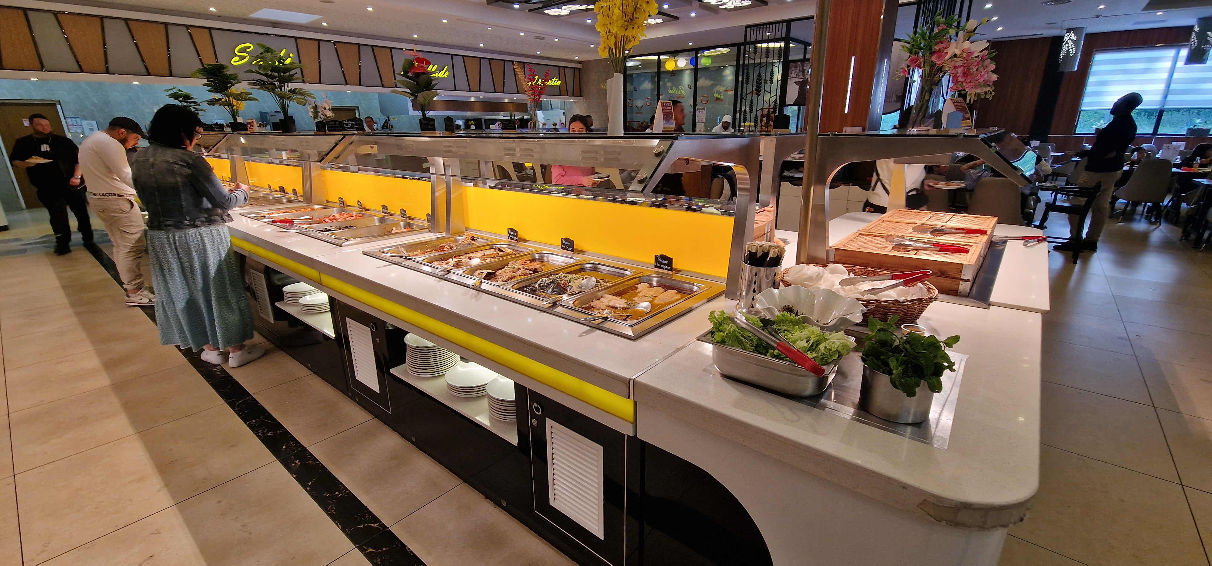 Le restaurant est immense et le concept est sympa ! Beaucoup de choix, pour les plus petits et les plus grands. Le problème des restaurants à volonté c'est la qualité des produits qui n'est pas forcément au rendez-vous... Les sushis étaient très secs, tu en mange 3 et tu as plus faim, c'est dommage. La viande est Halal est plutôt bonne. Les desserts font chimiques. Ce reste un restaurant à volonté avec des choses bonnes et des choses moins bonnes.