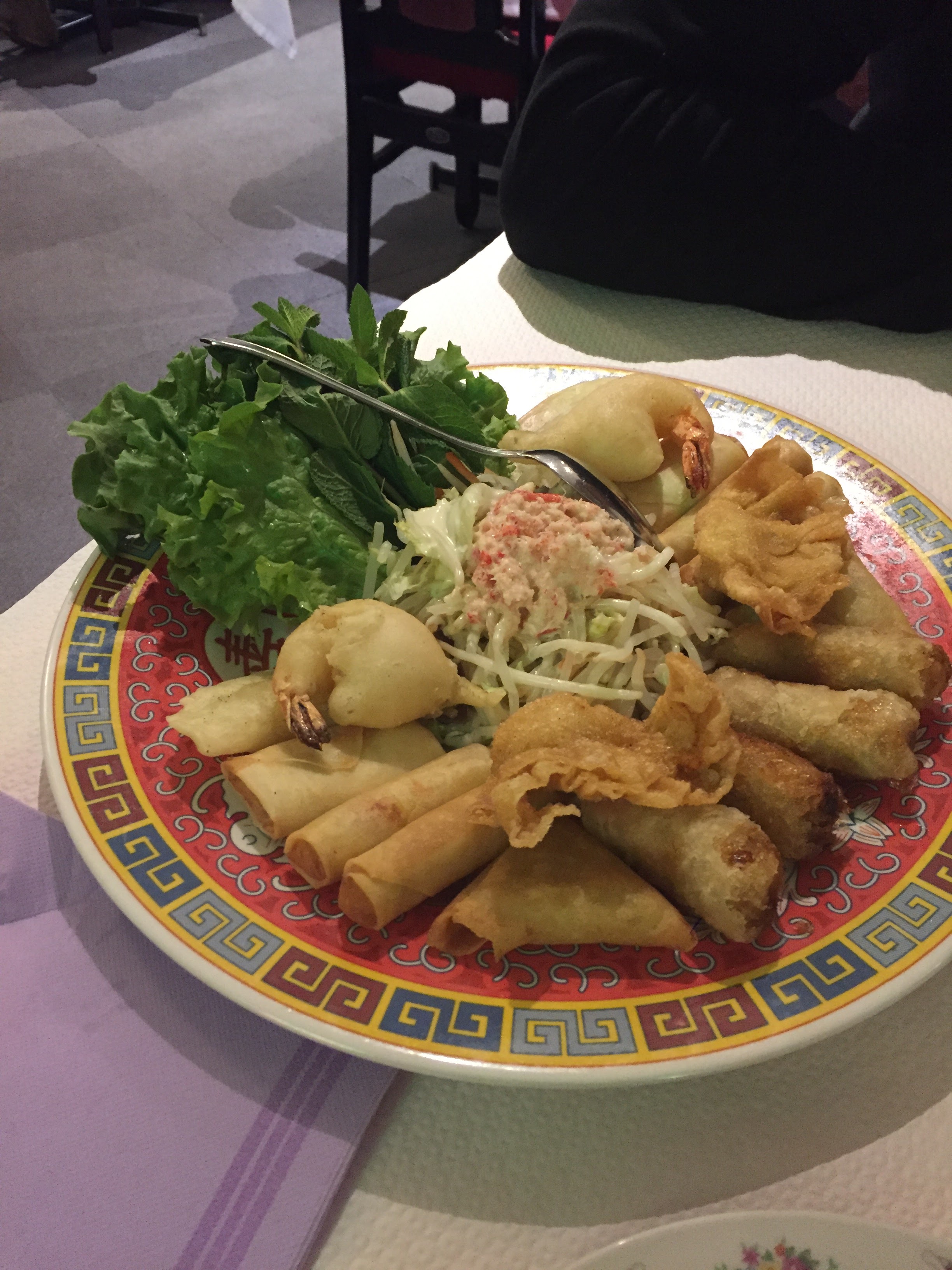 Arrêt au Pékin pour satisfaire un besoin urgent de nems... Nous avons donc commencé avec des nems qui se sont avérés assez moyens, visiblement industriels. Pas mauvais mais sans plus. Puis un canard à la Cantonaise avec des nouilles sautées et du riz cantonais. Rien n'est mauvais mais rien n'est vraiment bon. Les nouilles ressemblent à celles que l'on achète déshydratées et qui ont une forme de vague. Le riz cantonais était peu parfumé. In fine, un repas bien moyen qui n'aura que bien partiellement assouvi mon envie de nems...