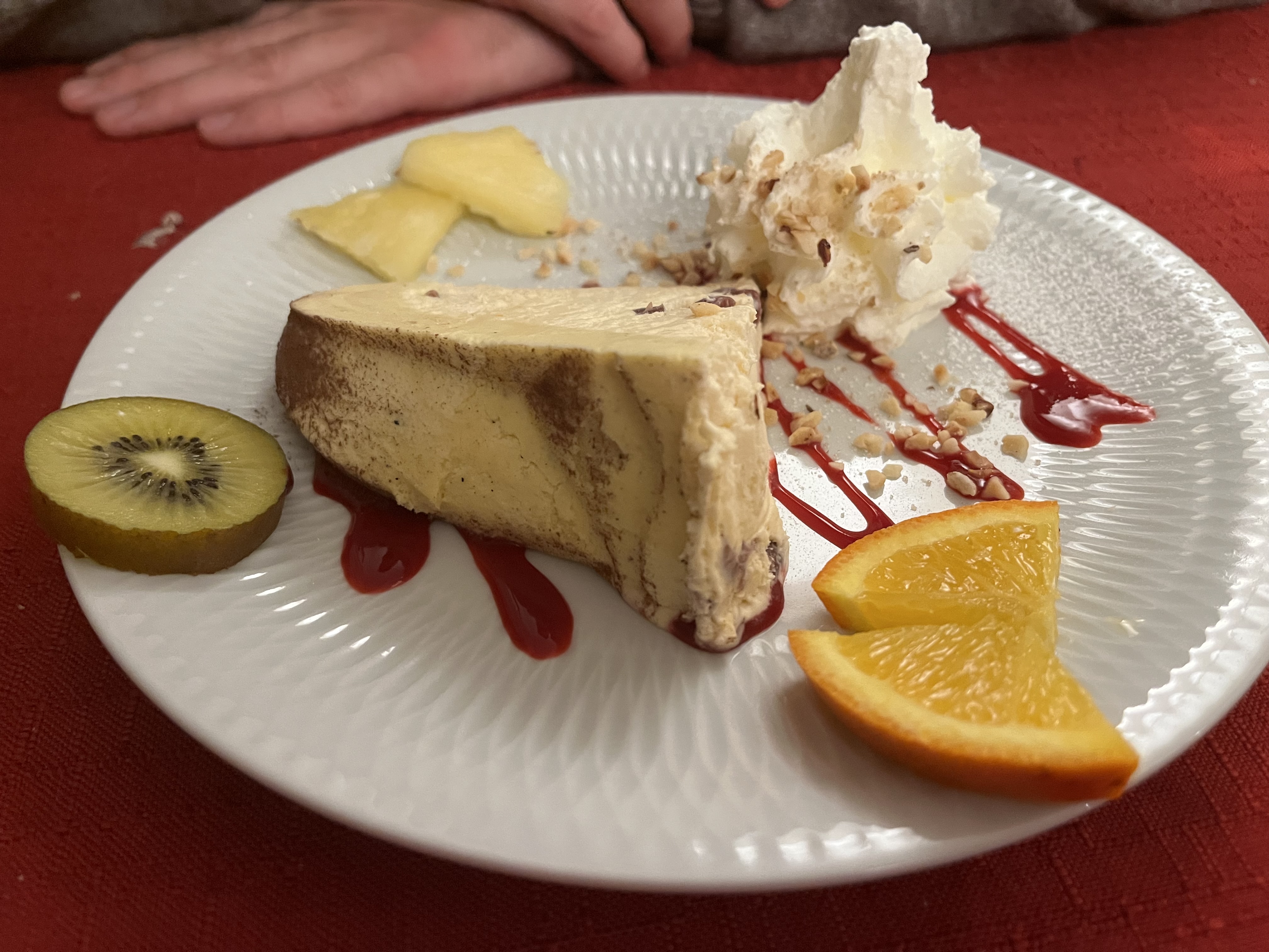 Un joli coin repas ombragé et une fantastique tarte aux myrtilles faite maison, une tarte au cheesecake et un jus de raisin car nous sommes dans une région viticole....