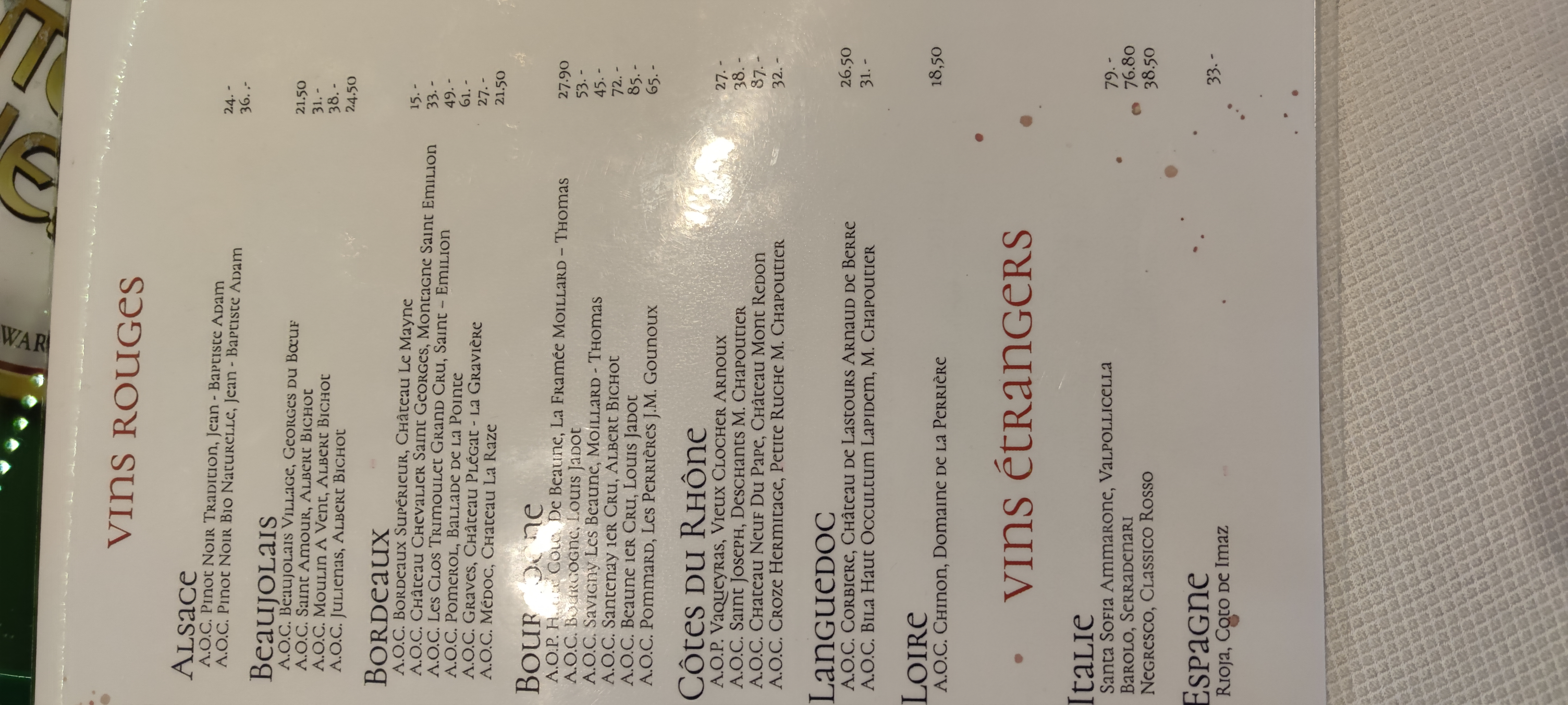 Lieu assez bruyant et service un peu spécial tout de même. Lorsque vous dites que vous voulez boire un vin il faut redemander la carte des vins et puis si vous voulez boire un seul verre la serveuse assez nerveuse vient vous faire la liste des tous les vins au verre. C’était étonnant qu’un lundi à 20h, la spécialité du jour (foie) était déjà terminée. Apparemment l’approvisionnement ne se fait pas sur le nombre de réservations…bizarre aussi. Les plats sont de bonne qualité mais assez chers pour l’hexagone…peut être à cause de la proximité avec la Suisse? Bien probable mais dommage tout de même. On nous l’avait conseillé mais on n’a pas été très convaincus.