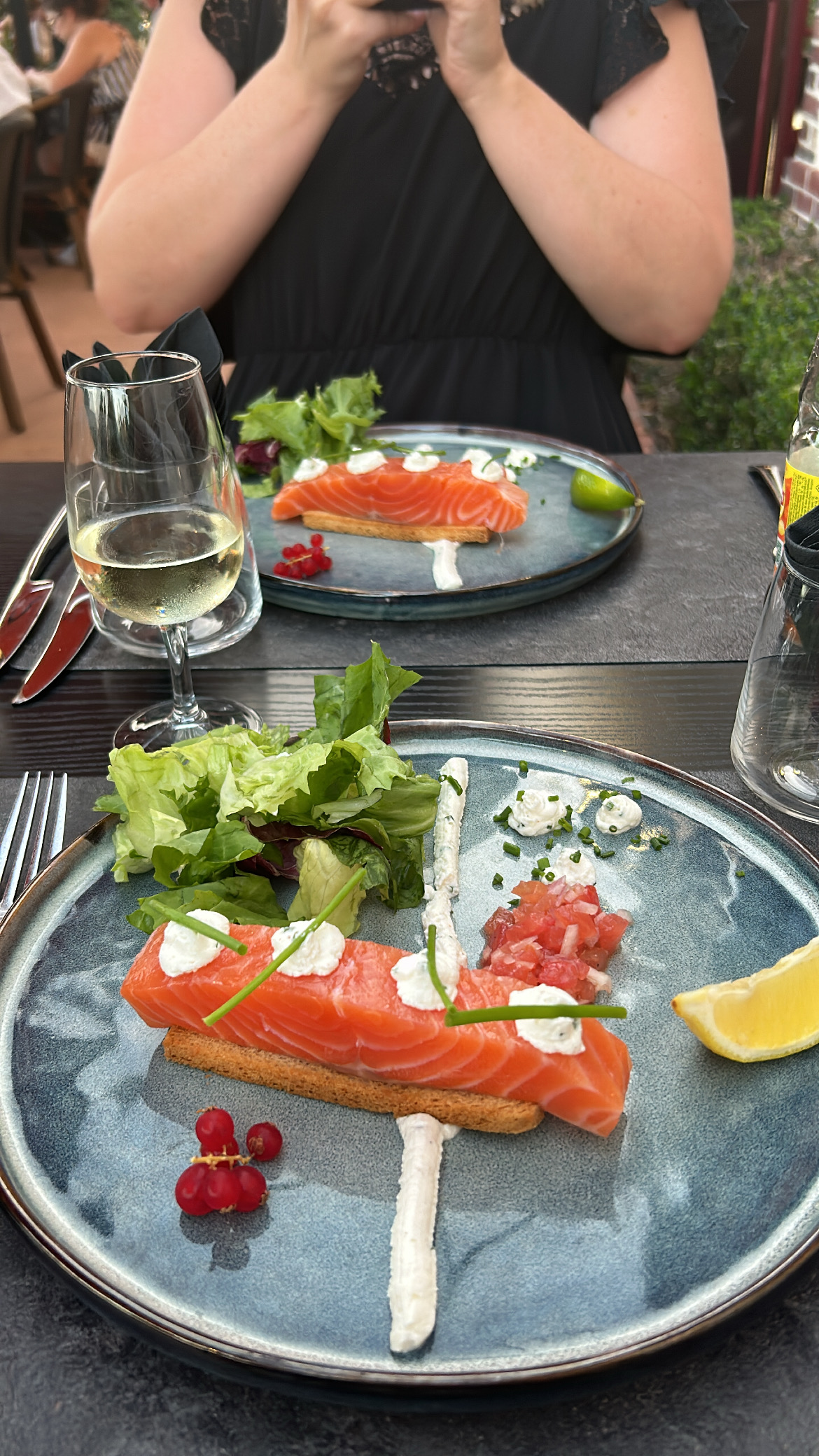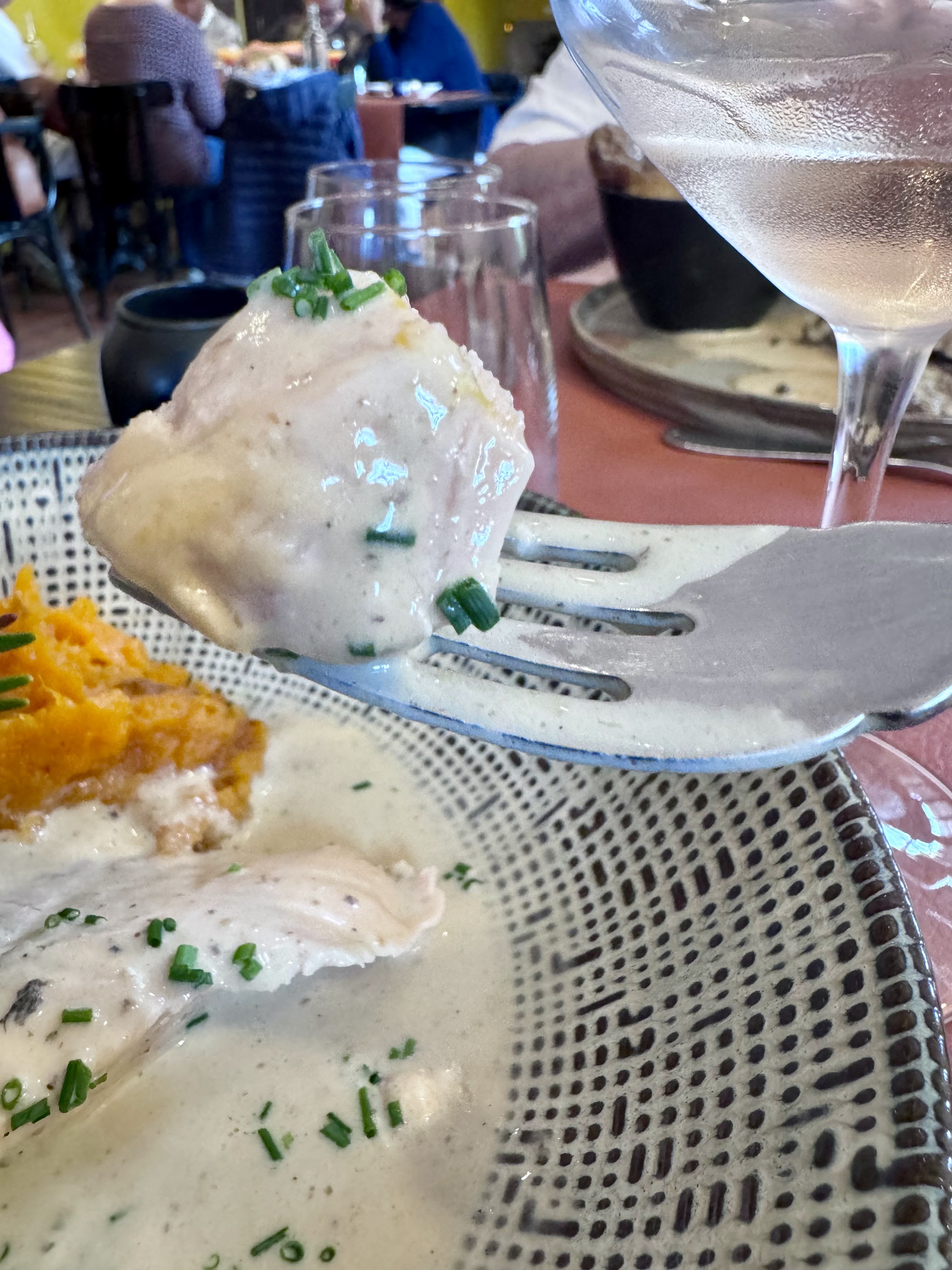 Super ! Mon mari a pris le menu du marché (menu surprise) un régal, moi le saumon gravelax et le rôti de lotte lardé très bon aussi, le personnel est très sympa, le petit côté sympa aussi : quand on va prendre son vin directement dans la cave et avec ce beau temps la terrasse était des plus agréable !