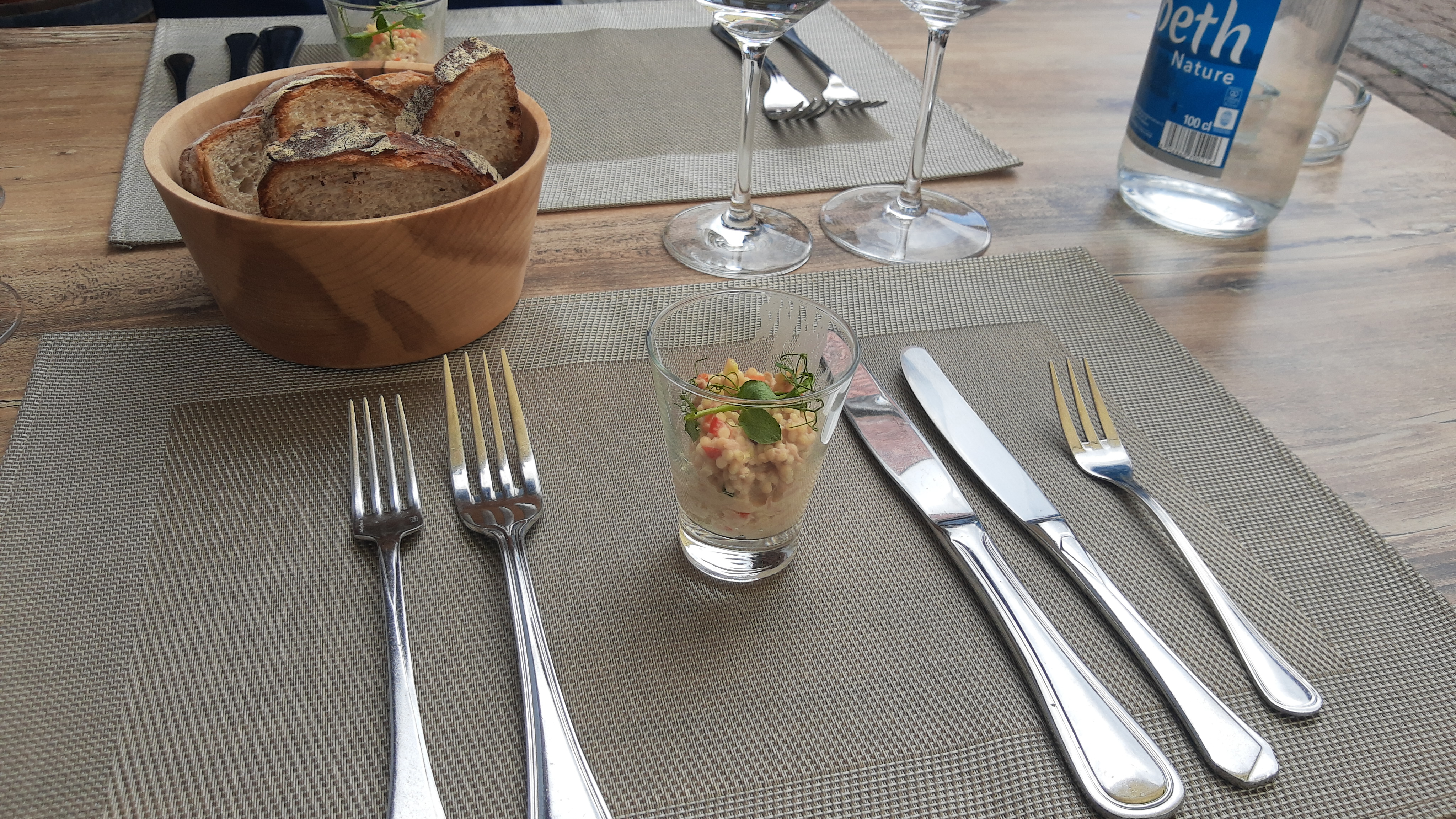 Très bon repas : ombre chevallier sur de la choucroute avec un vin fruité et léger proposé en accompagnement. La serveuse a bien vu que les guêpes nous ennuyaient sans cesse et a fait brûler du café dans une coupelle pour les faire s'enfuir. Du coup, on a pu se concentrer sur le repas. C'était bon.