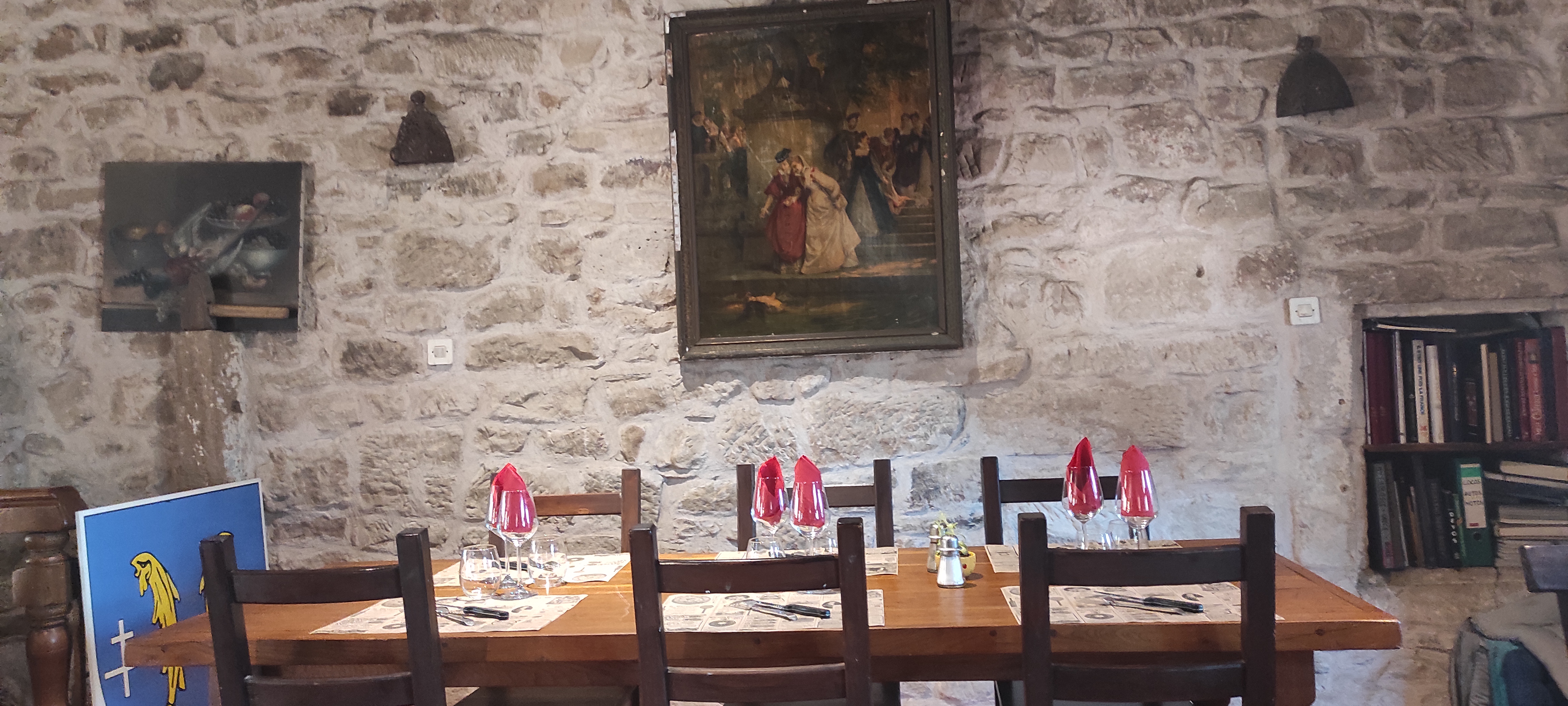 De passage dans le secteur, c'était le seul restaurant ouvert un 1er mai dans les environs. Situé dans une contre rue en face de l'église, il est mal indiqué de la rue passante c'est bien dommage. Nous avons mangé un menu simple mais goûteux dans un cadre magnifique et chargé d'histoire. Histoire qui nous a justement été contée. Ces anciennes demeures sont un peu sombres, ça fait partie de la magie des lieux.