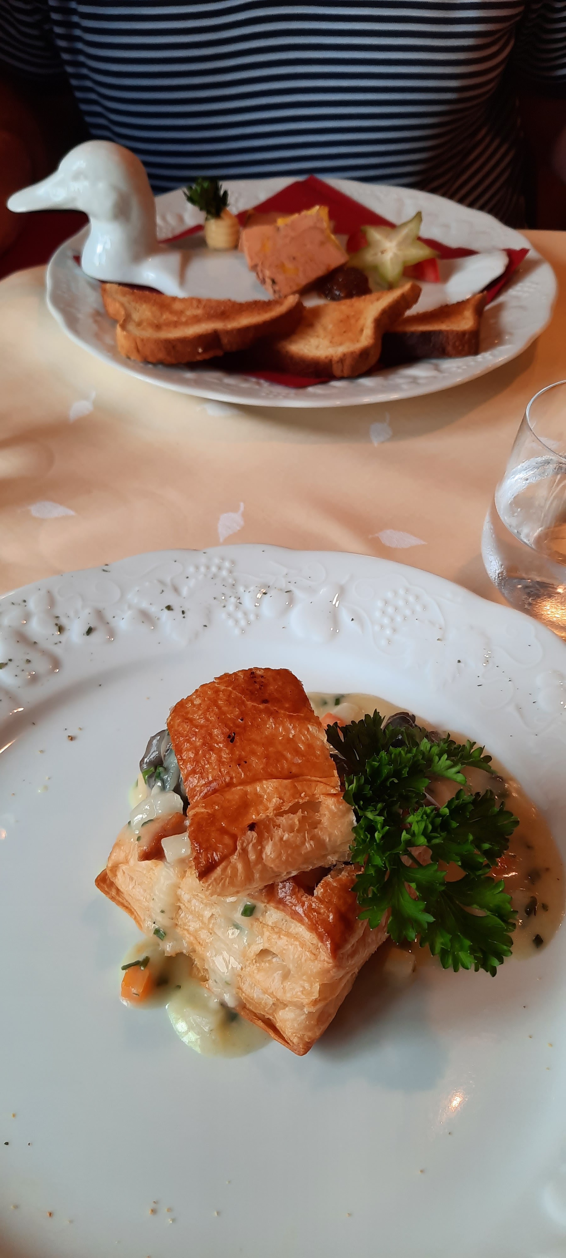 Cuisine typiquement française, bien réalisée avec de bons produits et très belle présentation. Il y avait un ragoût d'escargots en pâte feuilletée, une escalope de veau à la provençale et une madelaine à l'absinthe et glace. Nous avons apprécié ce repas ! Le service était épouvantable, apparemment c'était le stagiaire qui nous servait complètement sans émotion et ennuyé. Ce que l'on peut dire de l'hôtel, c'est qu'il vieillit et qu'il a un besoin urgent d'être rénové.