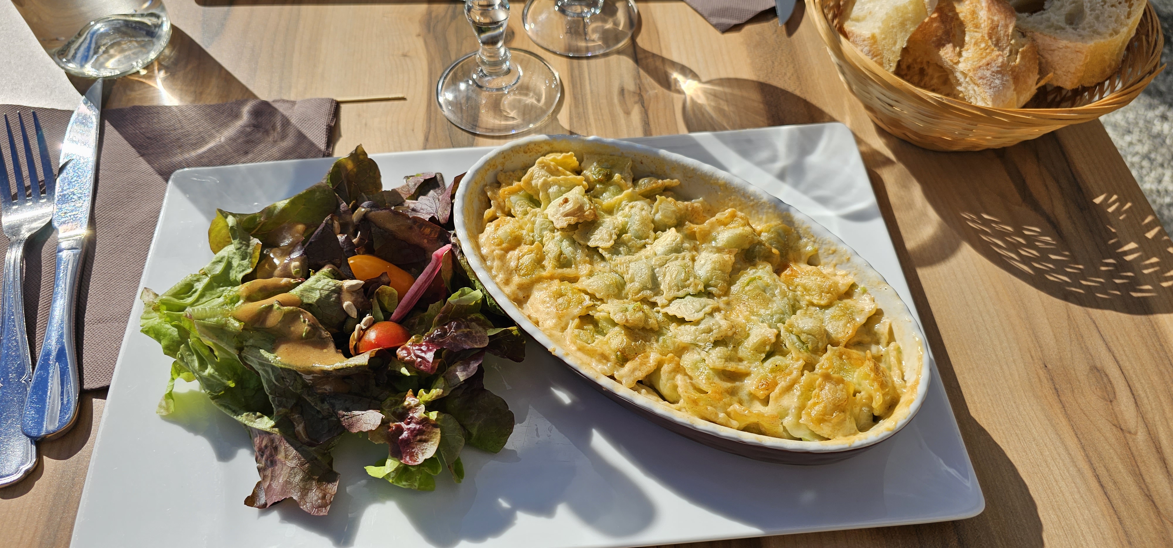 Cadre magnifique avec vu sur la montagne, on n'est pas du tout gêné par la nationale juste à côté. Terrasse agréable, ce qui est appréciable par une chaude journée. Bonne portion, on voit que ce sont des produits locaux et de très bonne qualité. Mention spéciale pour le gratin de ravioles aux gambas. Un vrai régal. Le personnel est parfait, professionnel, aimable et au petits soins pour les clients.