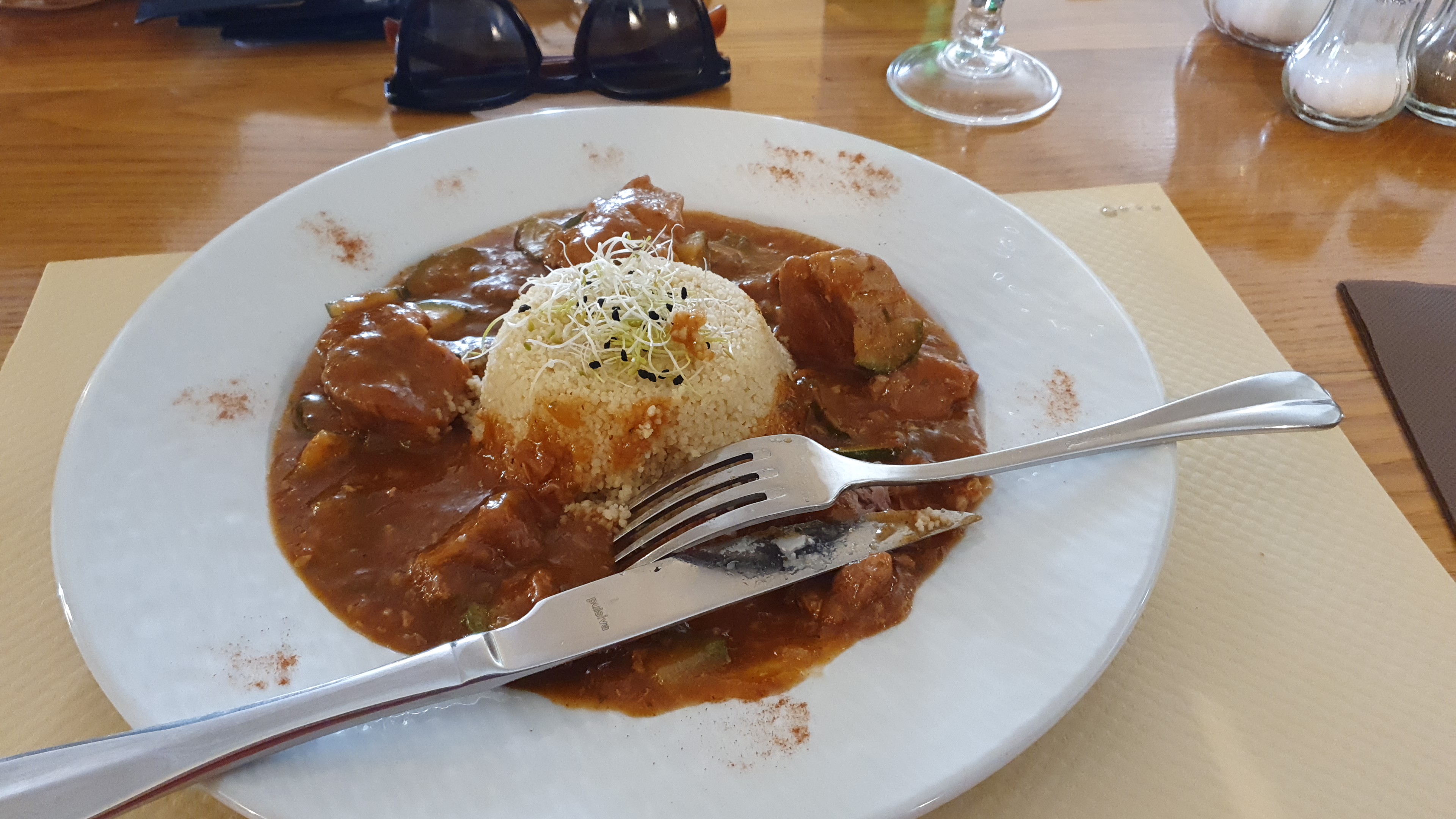 Nous nous sommes arrêtés pour manger vers 13h30 apres le contrôle dû au covid nnous nous sommes installer sur une belle terrasse il y avait une belle vue . Nous avons mangé des salades mais il manquait de la sauce.bonne glaces comme desert . Pratique car sur la route du sud grand parking (attention sol en gravier avec les motos).