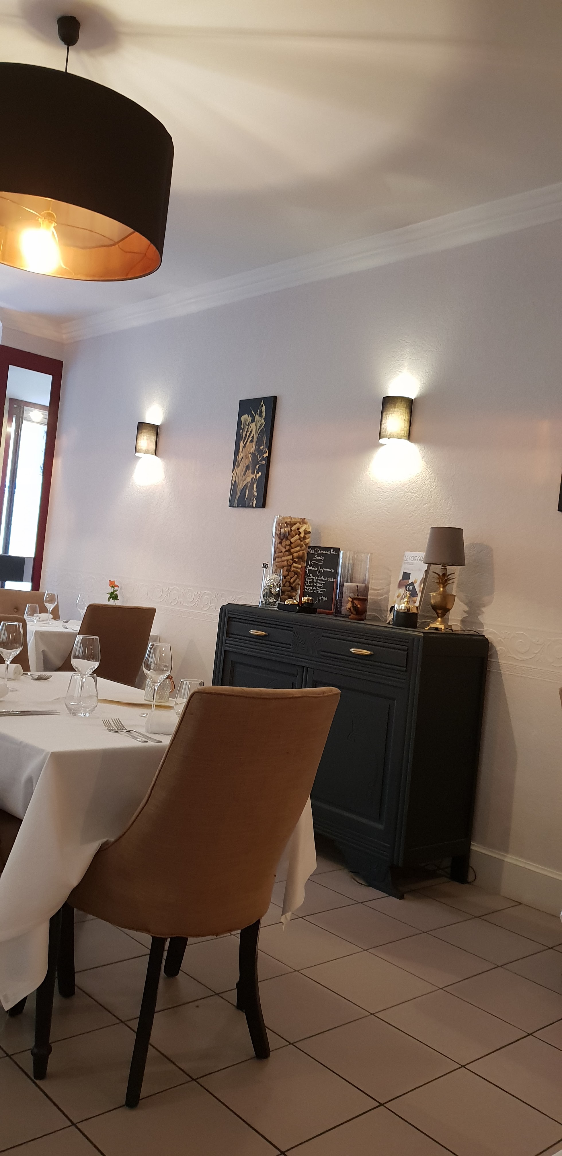Cuisine relativement bonne mais Tarifs très élevé pour la cuisine proposée : menu enfant 20€ mais assiette peu copieuse, menu à 35€ proposant en entrée foie gras ou cappuccino de Cèpes mais à l'arrivée nous nous sommes vu facturer un supplément de 6€/personne pour le foie gras (sauf erreur de ma part, non indiqué sur la carte ou sinon très peu visible), pas de bouteille de vin à prix peu élevé, la gamme démarre à environ 35€. Bref, nous avons eu un peu l'impression de se faire avoir surtout avec ce supplément. A côté de ça, l'accueil était top, le service parfait et le repas bon.