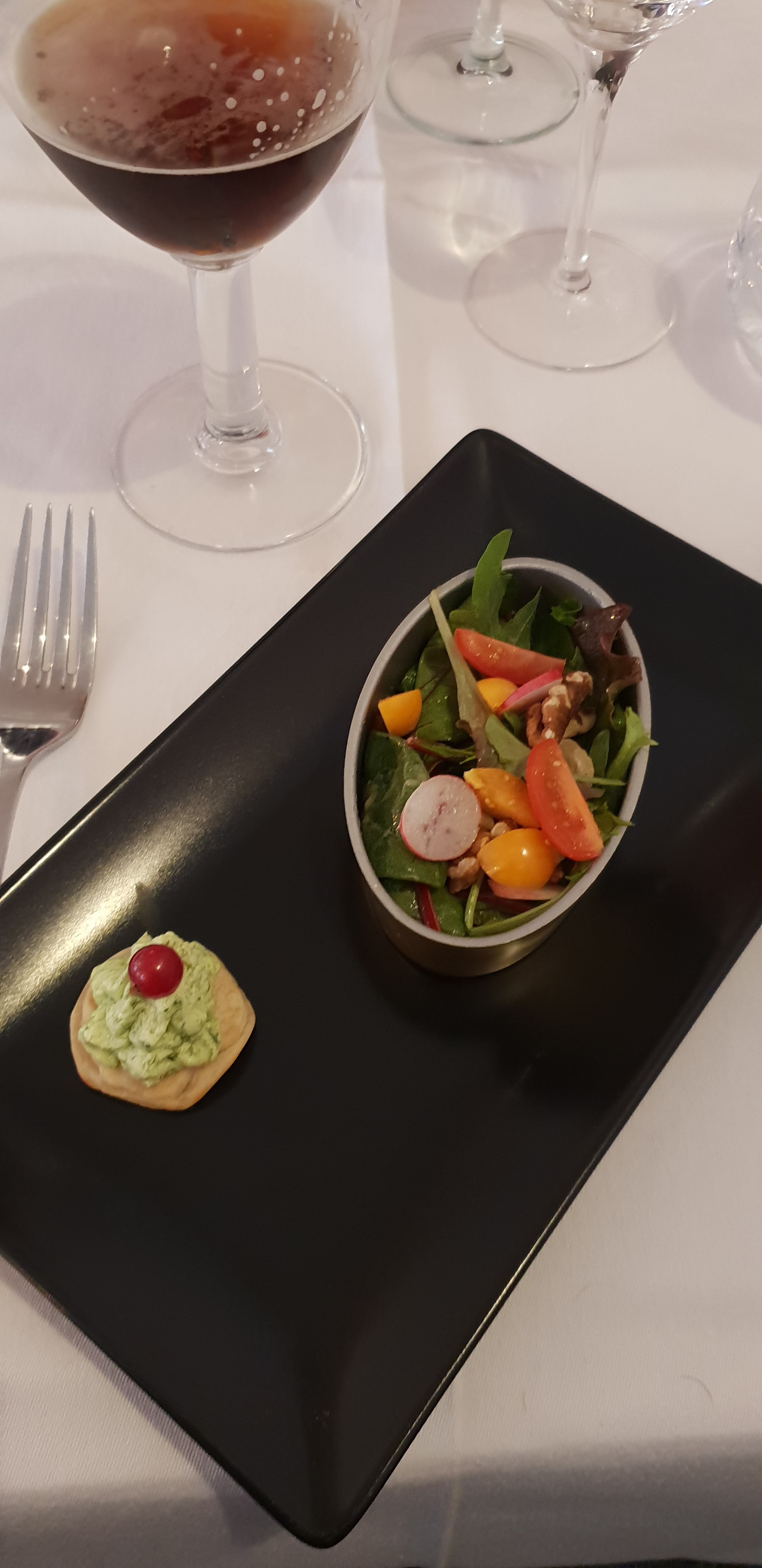 Après un voyage fatigant en voiture nous sommes arrivés peu avant minuit avec mon compagnon et n'avions nulpart où manger. Nous avons vu de la lumière dans le restaurant, il était en train de fermer, nous espérions éventuellement collecter quelques restes mais nous avons été accueillis comme des rois ! Servis rapidement avec toutes les options, tout était parfaitement présenté, absolument délicieux et le personnel d'une chaleur et d'une gentillesse exceptionnelle ! L'endroit est très raffiné pour un rapport qualité prix incroyable. Excellente expérience, merci infiniment !