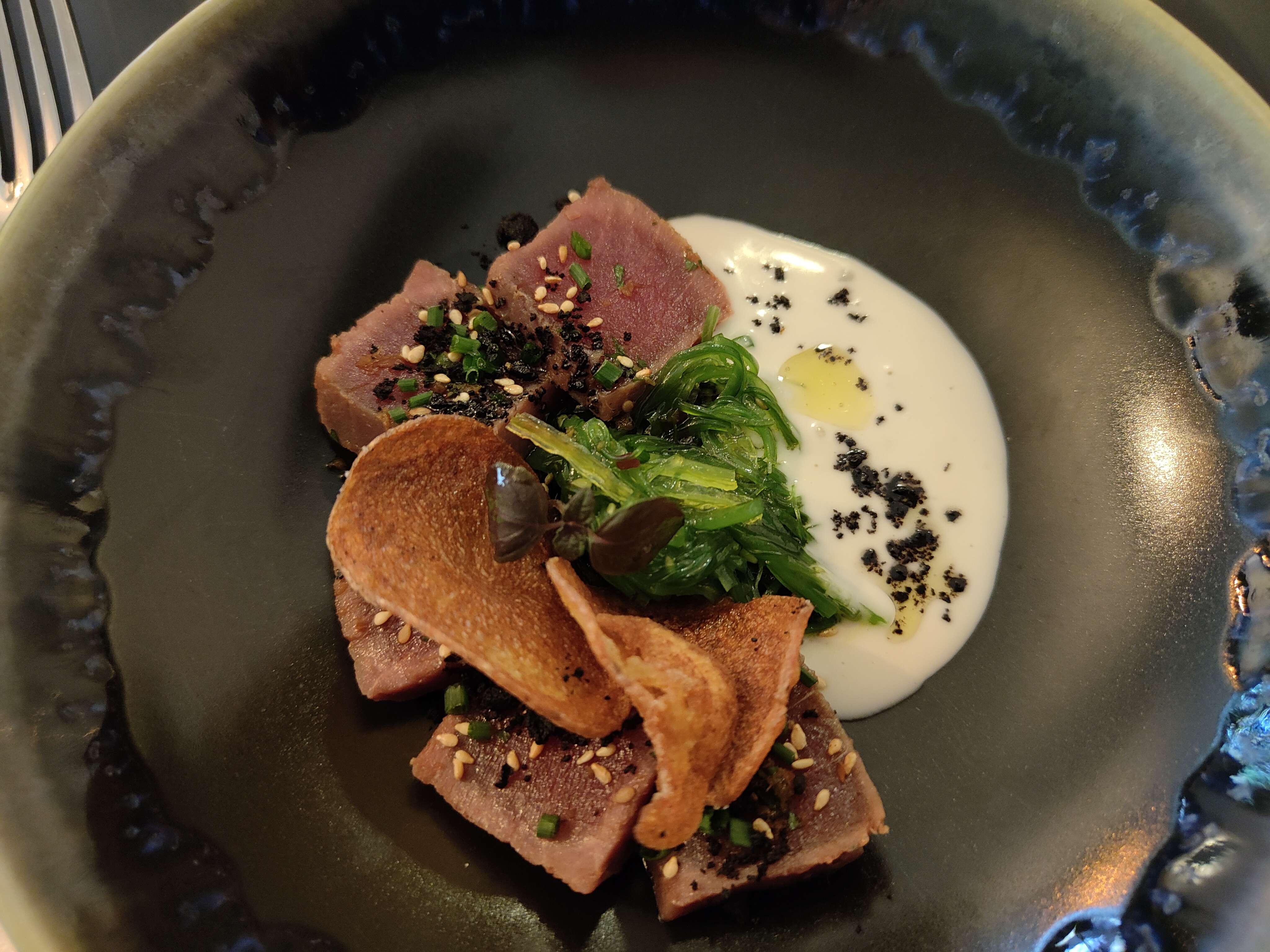 Une cuisine travaillée, tout en douceur. On a pris en entrée un takimi de thon, wakame et sa sauce gingembre. Un délice. Puis une hampe de boeuf et du lieu noir qui étaient très bien cuisiné. Ambiance feutrée.