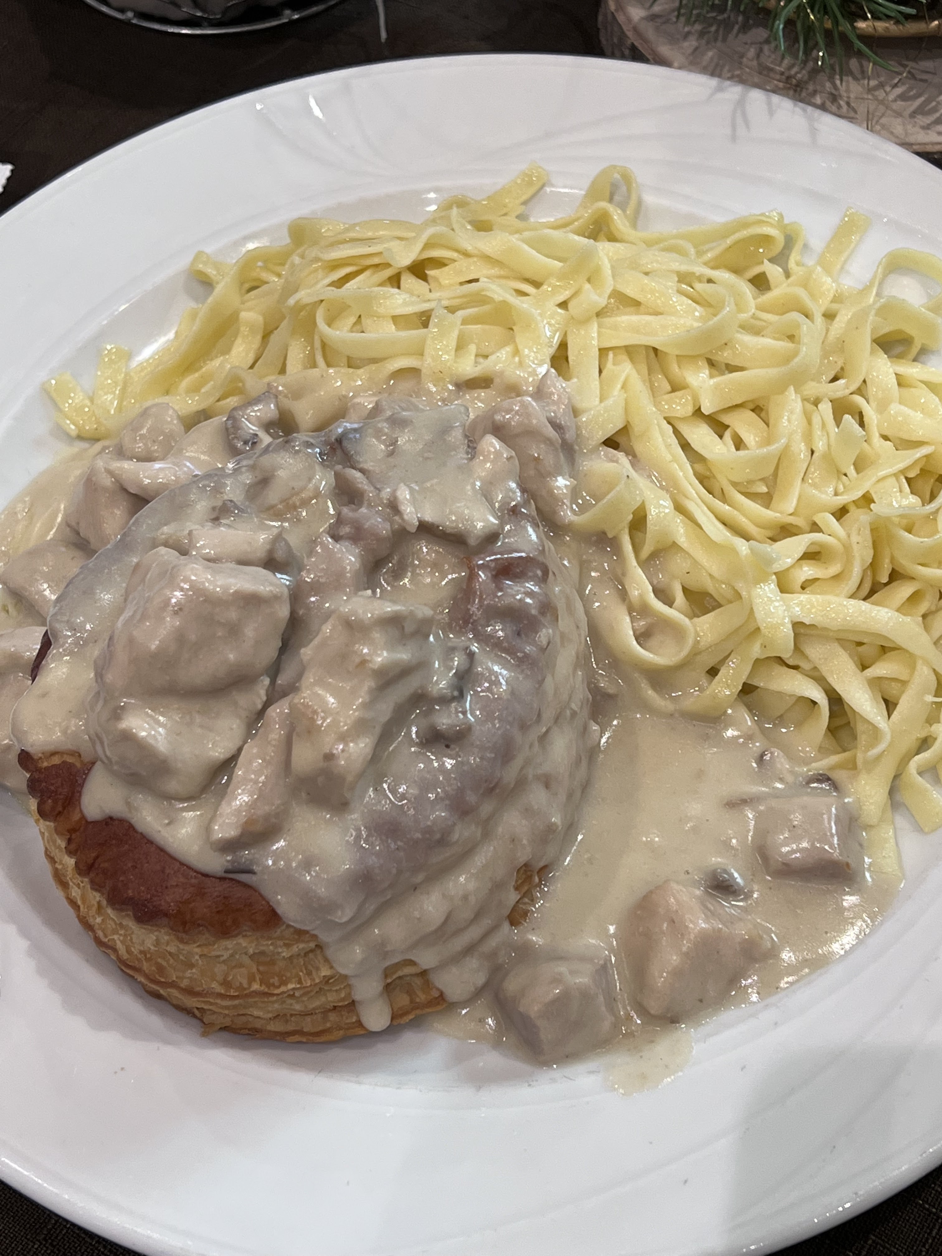 J'ai eu les pâtes Bouchée à la Reine qui avaient une pâte feuilletée fourrée au poulet crémeux servie avec des pâtes. Étant donné que je ne suis pas fan de la cuisine allemande et que l’Alsace a beaucoup d’influence allemande, c’était plutôt correct ! Et le service était hospitalier ! J’imagine que ce sera plutôt génial après la randonnée dans les Châteaux à proximité !