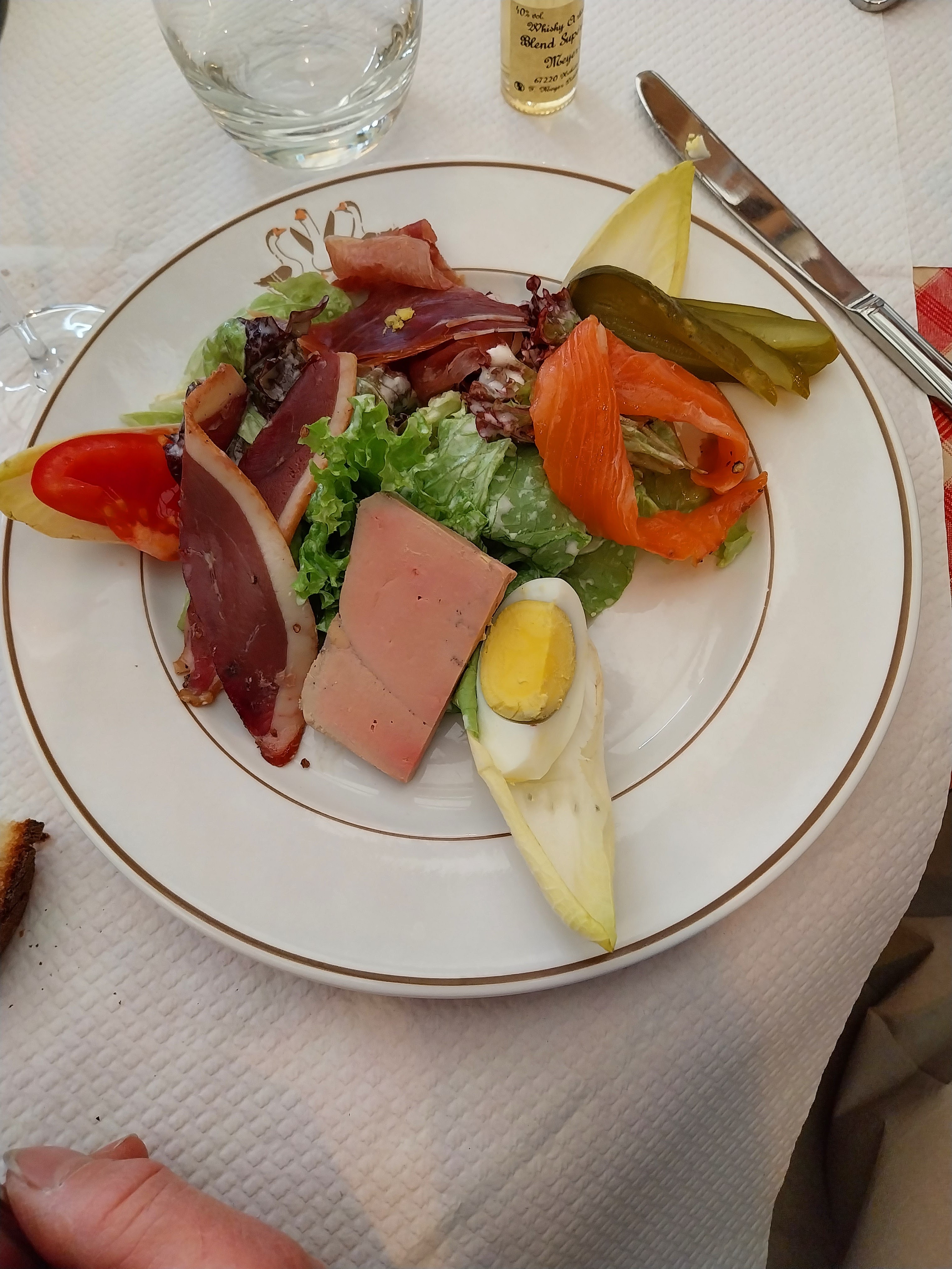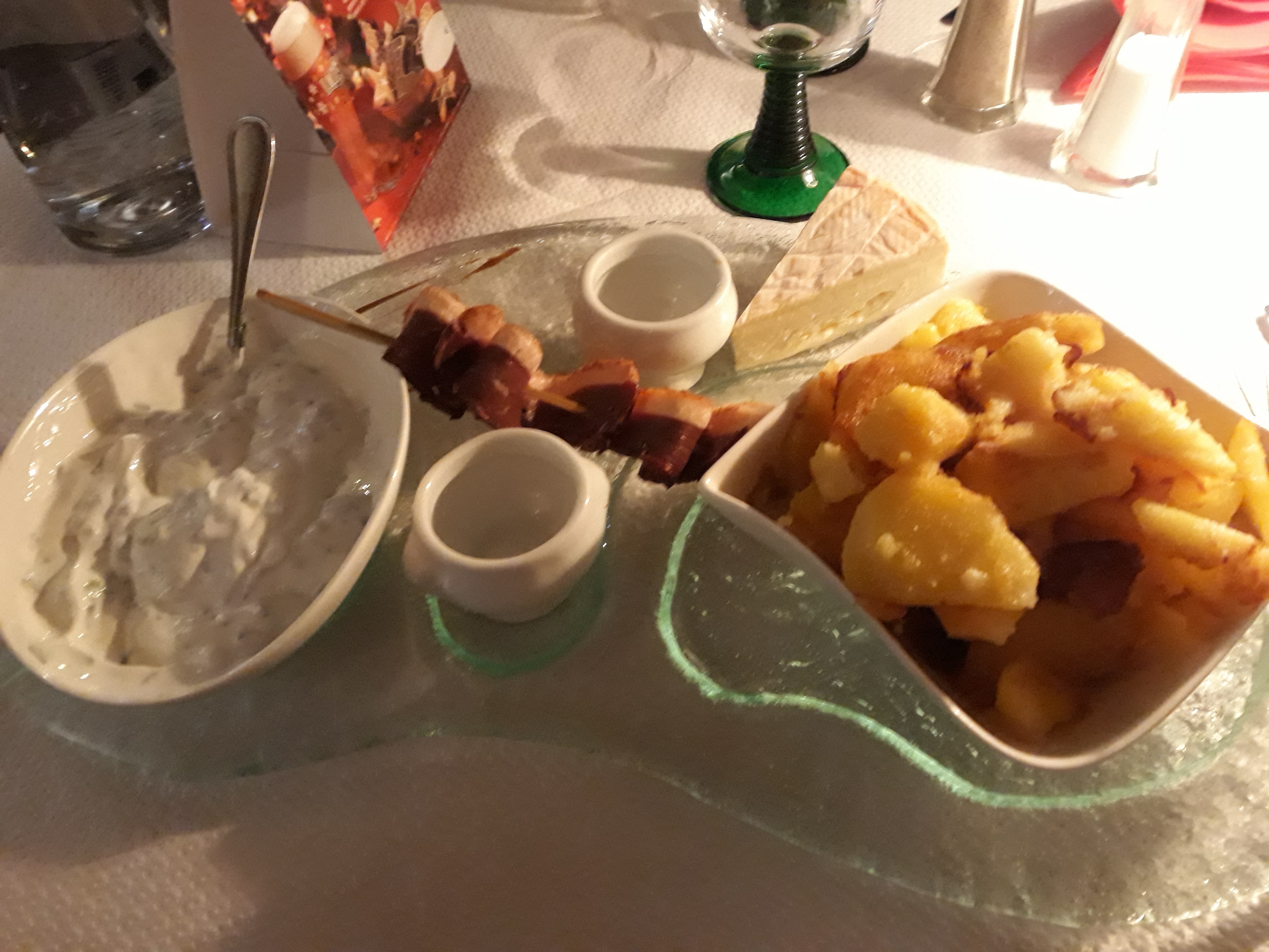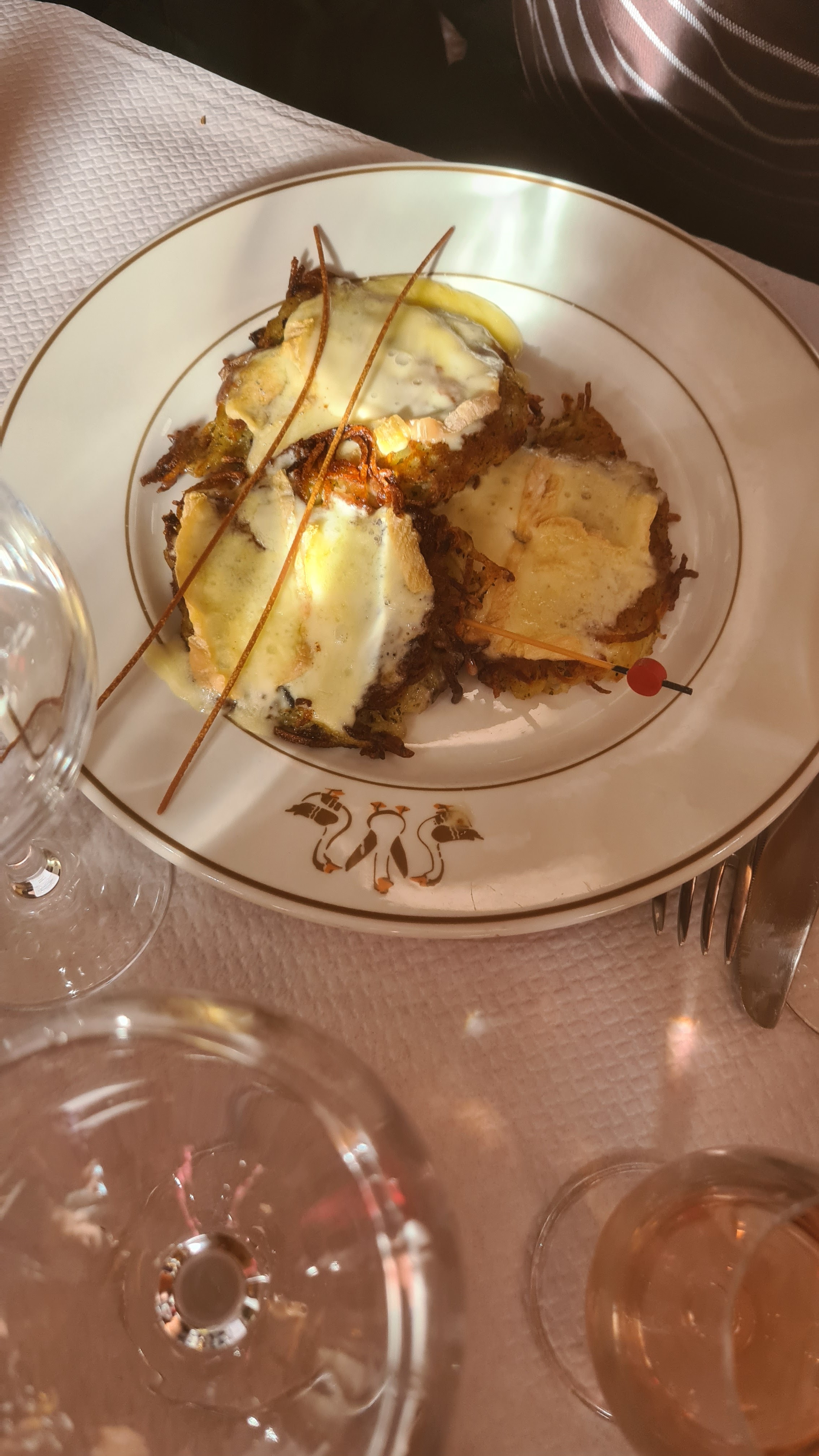 Belle découverte de ce restaurant, cadre et décoration originale, service impeccable avec le sourire. J'ai pris une galette de pomme de terre au munster....au top!!!! Mon conjoint une assiette de charcuterie Plus de place pour un dessert 😅 Adresse a découvrir, sans hésitation