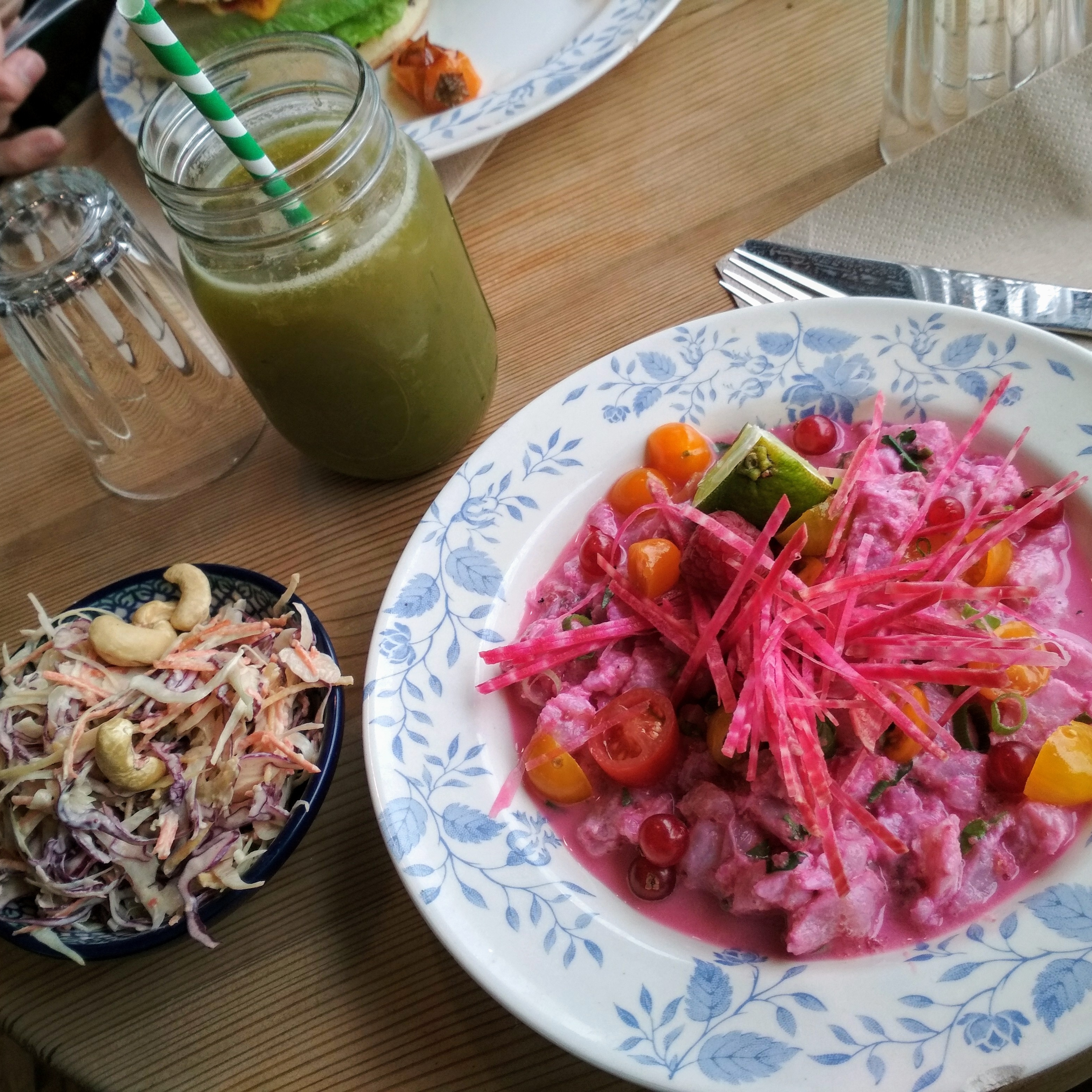 La photo parle d'elle même, c'était étonnant et délicieux ! Ceviche et jus frais 😍