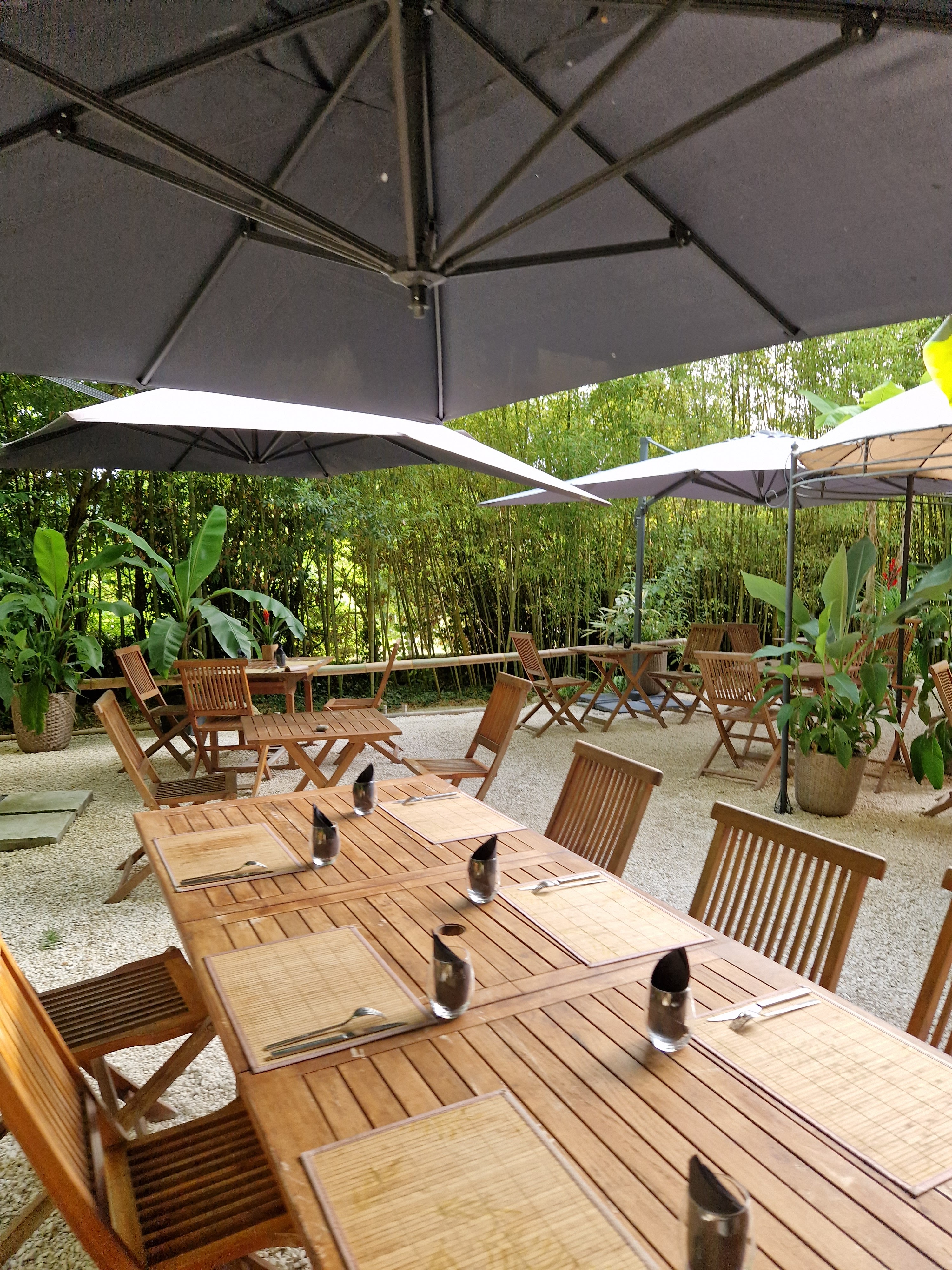 En week end dans la région. Nous sommes venue après avoir vue les très bon commentaires et cet belle note de 4,5. Mais quel déception et mauvaise expérience. Le cadre et tout simplement magnifique on mange dans un superbe jardin au milieu des bambous les pieds sur un beau gazon avec de jolie basin, nos compagnons à 4 pattes sont les bienvenus mais la belle expérience s'arrête là. Nous attendons bien 10 minutes avant que l'on nous place. Puis plus 1h pour avoir 1 entrée et de l'eau pour notre chien, 40 minutes pour les plats, viande chaude frite froid puis encore 30 minutes personne ne vient on abandonne le dessert, en plus il faisait nuit et il n'y a pas de lampion pour toute les tables il a fallu qu'on demande a la serveuse si on pouvait prendre celui de la table d'à coté qui été parti depuis un bon moment pour finir notre plat.C'est pas fini 45 minutes pour payer au comptoir. Et le toilette très jolie on peut pas dire sale mais moyen. En résumé le personnel et très gentil, le cadre magnifique mais plus de 70€ pour 1salade et 2 steak frite froide non merci même pour un cadre magnifique.