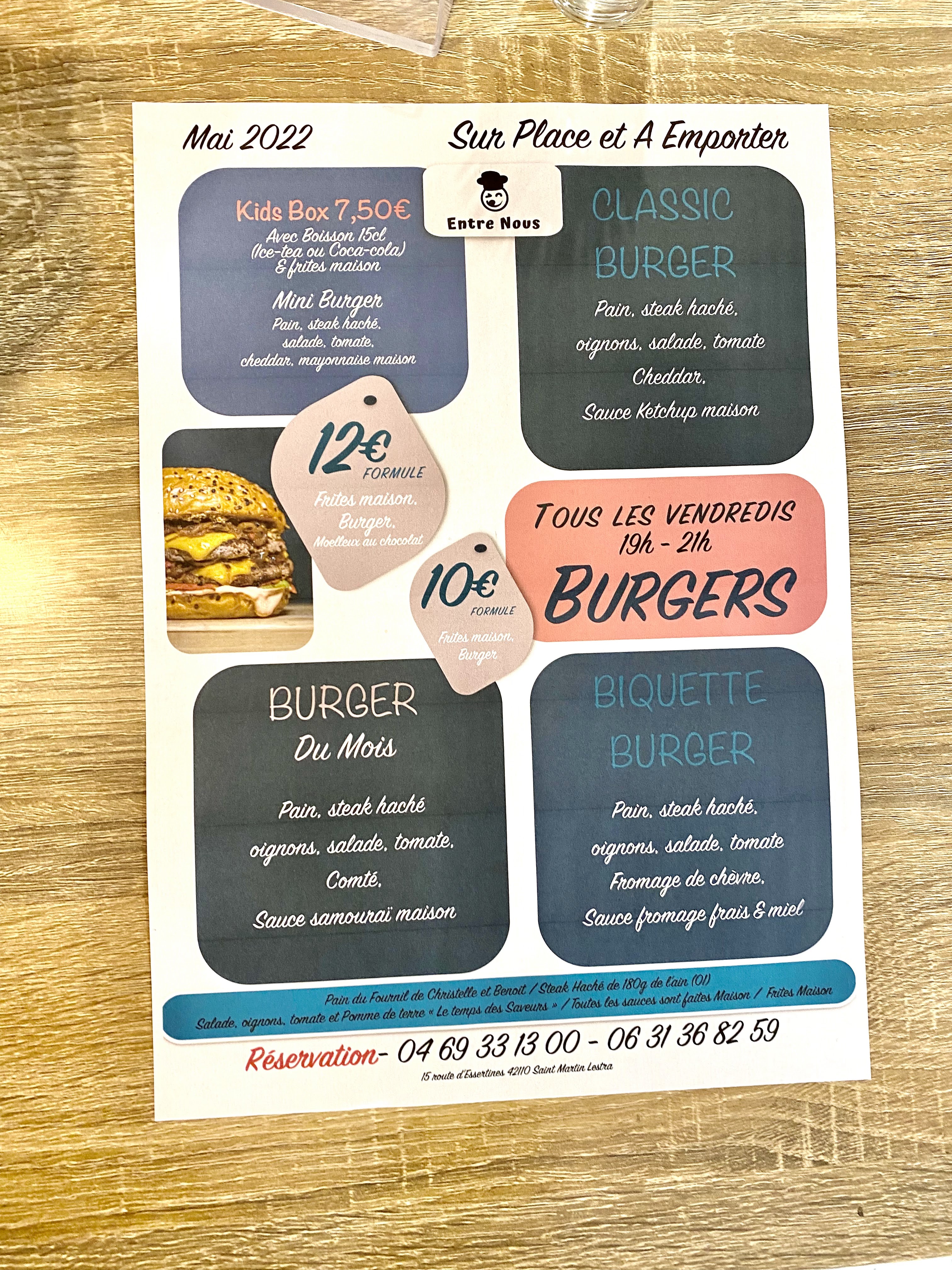 Formule burger du mois avec frites à 12€. De très bons produits et copieux. Du fait maison. Bon rapport qualité/prix. Service agréable, pas d'attente. Repas chaud. Et le steak bien cuit comme demandé. Nous recommandons.