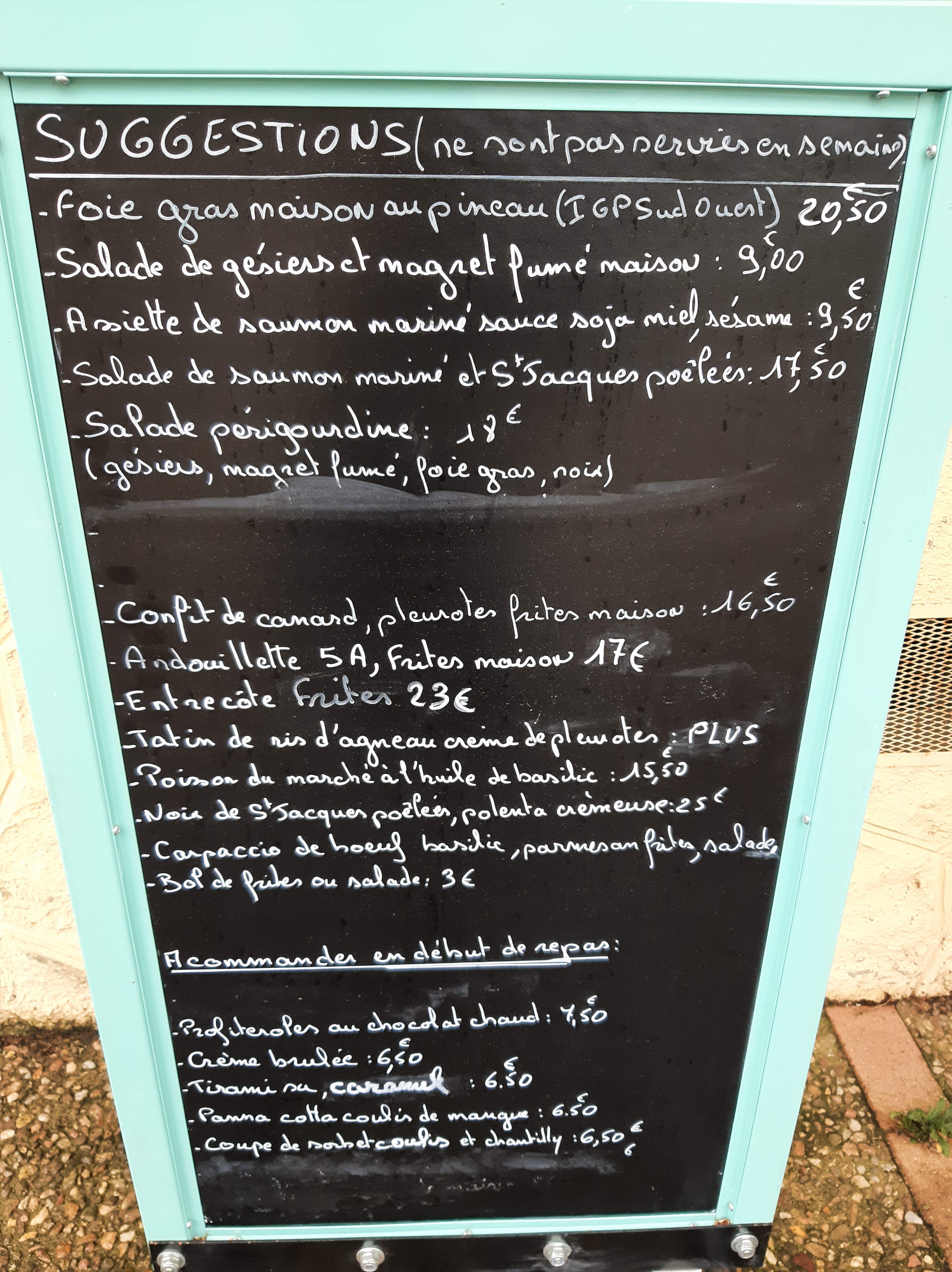 Le négatif : Aucun Le positif : la qualité des produits et le tarif. Bon accueil. Menu du jour à 12€70 (Entré plat dessert). Le tous faits maison. Je recommande.