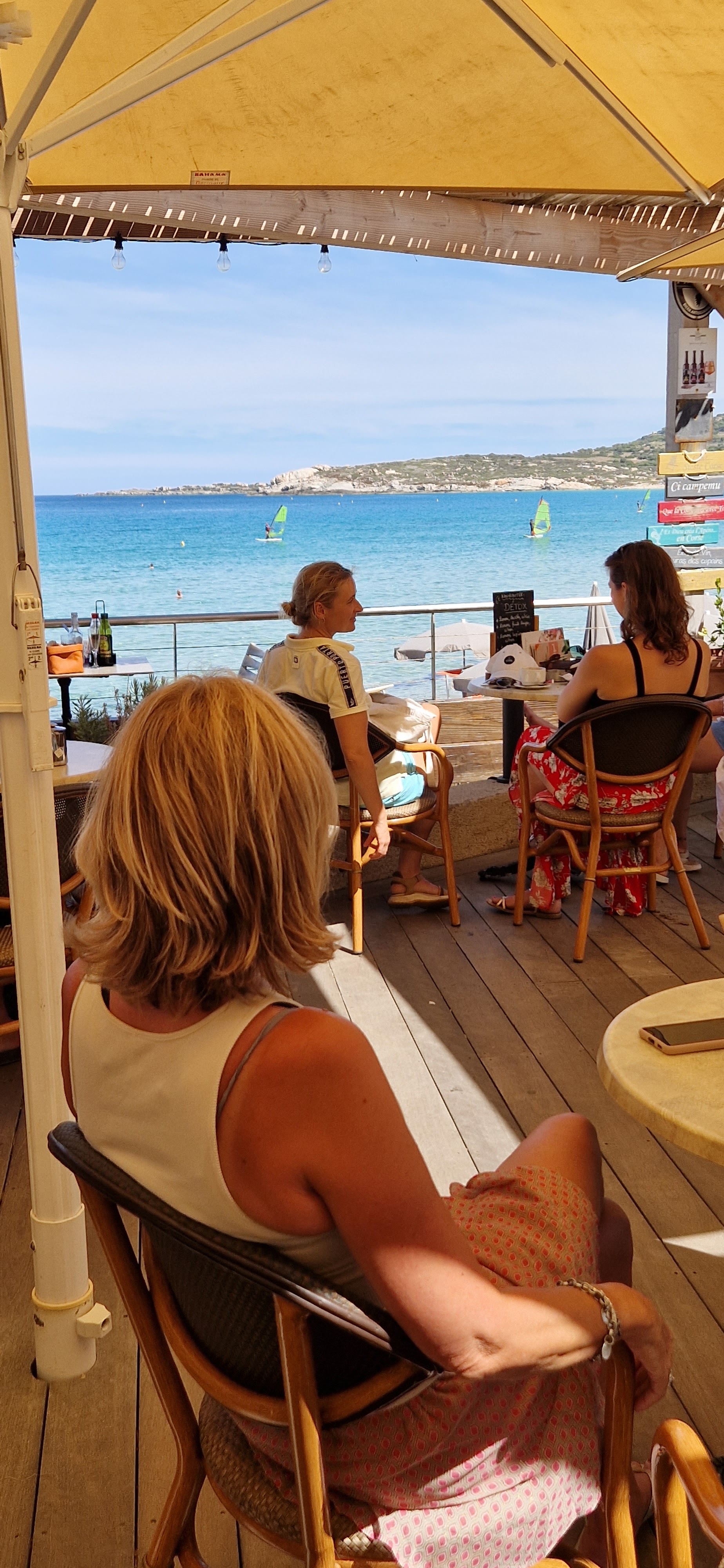 Accueil détestable et antipathique. Nous sommes arrivés à 4 peu avant midi, la seule table proposée était en plein soleil (parce que non corses ?) donc ne nous convenait pas. Alors que nous étions dans la salle en pleine hésitation, la serveuse nous a beuglé dessus avec son plateau rempli (au lieu d'un simple Excusez moi) pour nous demander de nous écarter. Une fois repartis, le patron nous a hélé dans la rue en nous invectivant Fallait prévenir que vous ne prenez pas la table ! . Aucun regret vu le repas finalement pris au restaurant des Arcades quelques mètres plus loin avec un personnel sympathique et accueillant, le tout surplombant la plage.