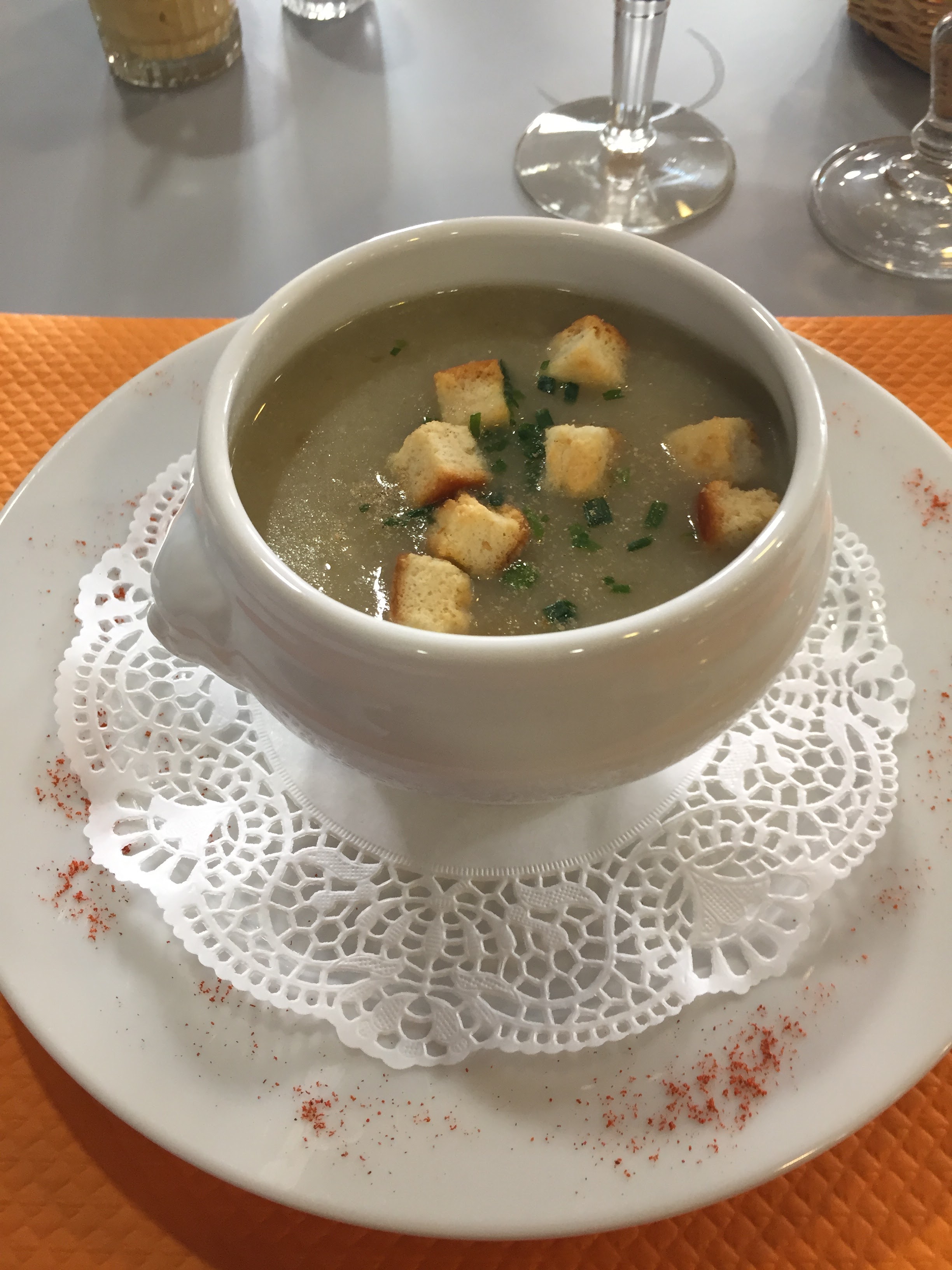 Alors ... comment vous dire ... L’arrivée dans ce restaurant fût cordiale, menu étape à 15 euros proposé... je me prends une st feuillien en pression et pas possible de la prendre en 33 cl... Bref, une dizaine de minutes après, je reçois le velouté ou crème d’endives...bon sans plus. Et là! Imaginez vous, vous êtes déjà seul(e) pour déjeuner, vous allez certes sur les réseaux sociaux histoire de passer le temps... ben il était extrêmement long ce temps car j’ai attendu 35 minutes !!!! Entre l’entrée(la gérante est passée plusieurs fois devant ma table sans même prendre le plat de l’entrée vide et pas un mot genre « excusez nous pour l’attente »rien !et ce plat pavé de saumon , poêlée de légumes potiron et courgettes... du riz assaisonné au citron ( a tout ceux qui détestent ça).... dans la corbeille de pain , il devait y avoir 8 tranches à vue de nez , ben y’en rester plus que 2 tellement j’avais faim et long d’attendre.. J’ai pas pris de café bien entendu et me suis levée pour me diriger vers le bar et régler ma note .... ah ben là, je peux vous dire que j’ai pas attendu une minute pour que l’on le présente l’appareil à carte bleue... Les habitués étaient servis en priorité avec plus d’égards,c’est très dommage de laisser de côté les potentiels nouveaux venus... Moi qui pour une fois, avais envie de déjeuner équilibré ( représentante commerciale)ben j’aurais dû m’arrêter au MC doc car pour le même pris .... non comment !! Une st feuillien blonde de 25 cl à 4.20 euros en pression mais, pas celle à laquelle je m’attendais, c’était une pompe à bière... Je passerai mon chemin à Solesmes concernant ce restaurant... Les habitués seront peut-être surpris de lire cet avis... j’assume