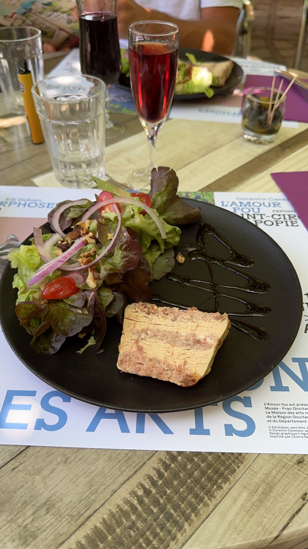 Des assiettes en plats unique avec seulement des crudités, sans aucun goût, la qualité des légumes est déplorable ! Nous sommes désappointés d’avoir payé aussi cher pour une tomate sans goût en plein mois d’août accompagnée d’une salade verte mal triée avec des partie fanée, et carottes râpée, concombre et chou rouge à l’image de la tomate ! Un « rocamadour » sur un bout de pain blanc bas de gamme et le tout…13,90€ ! Autant vous dire que je ne vais pas au restaurant pour manger ça et que c’est bien meilleur chez moi ! Ah par contre ça doit être sacrément rentable pour le patron à l’intérieur qui boit du rouge en donnant des ordres aux serveuses !